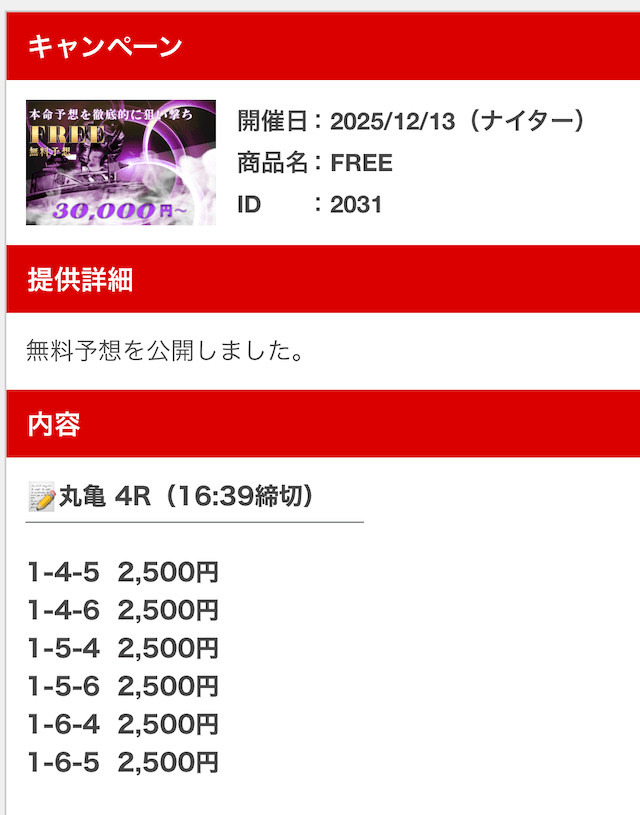 - 無料予想なのに荒れた決着でもカバーできて、思っていた以上に大きく稼げました。爆発力が強みで、継続的に参加するのが1つ勝つコツかな。投稿日:2025/10/01
