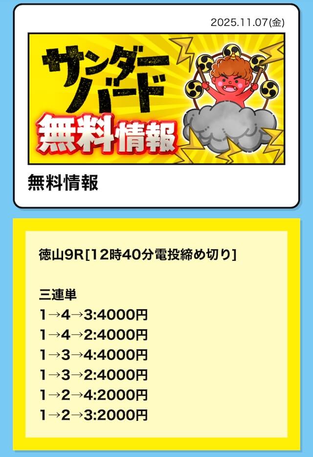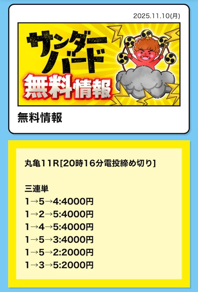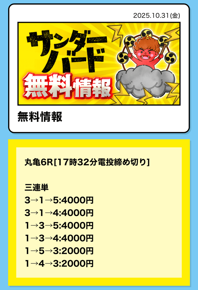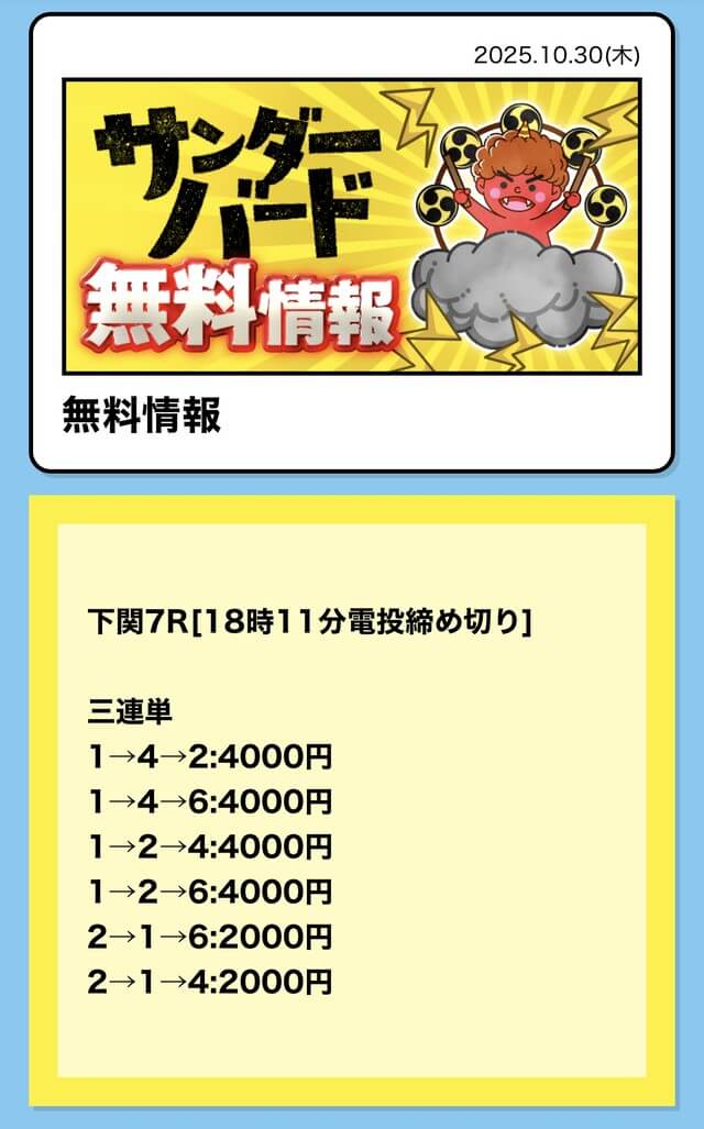 月曜に消えたい人昼休みに同僚が「これ、意外と当たるよ」と見せてきたのがアップボートの無料情報でした。軽い気持ちで試した初回が当たり、そこから毎日チェックするのが日課に。特に買い目が少なくて迷わないのが助かります。スマホだけで完結するし、結果もすぐ見られる。1日を通してちょっとしたワクワクを感じられる存在になっています。投稿日:2025/11/10