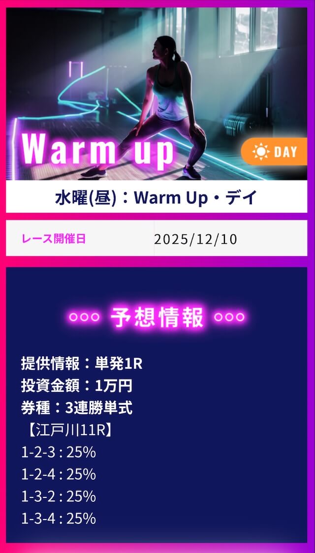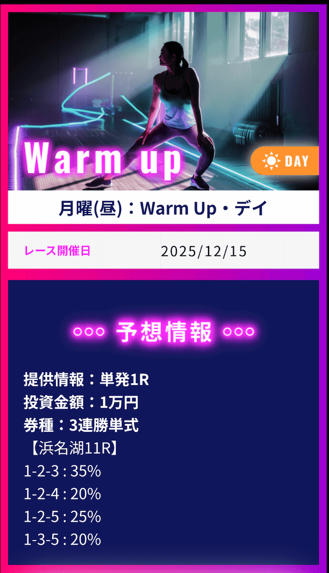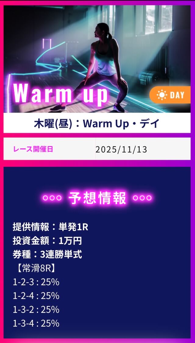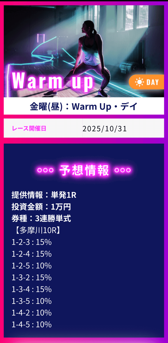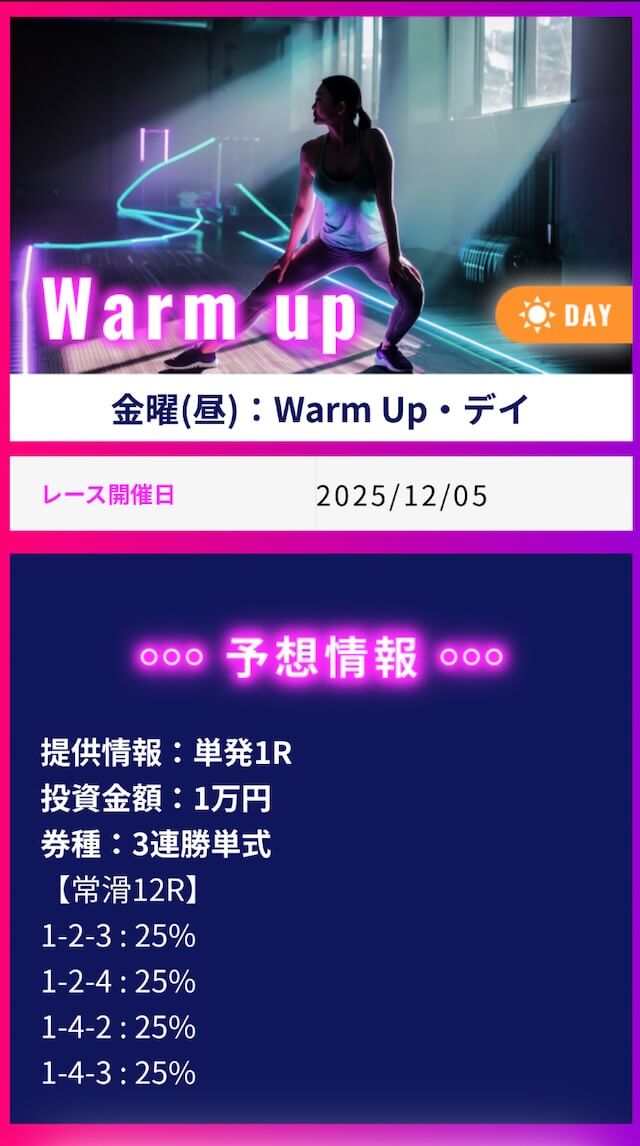 購入の締め切り時間が過ぎていたとしても、16時以降に「限定プラン」の案内が届くことがあるよ!!たぶん、直前に入った情報を加味された予想だから、いきなり案内が届くんだと思う。結構当たるし格安で参加できるから、メルマガは適宜チェックした方が良いかと!