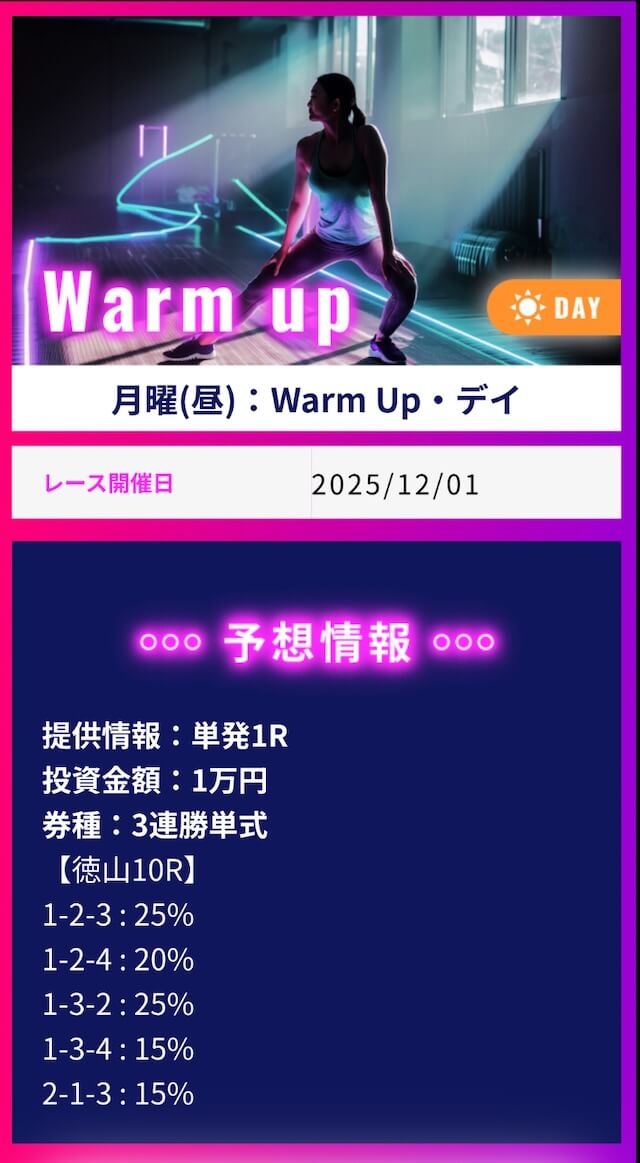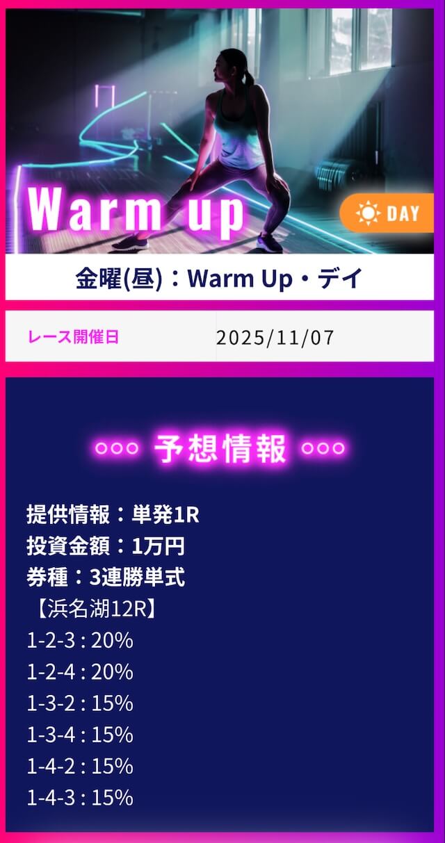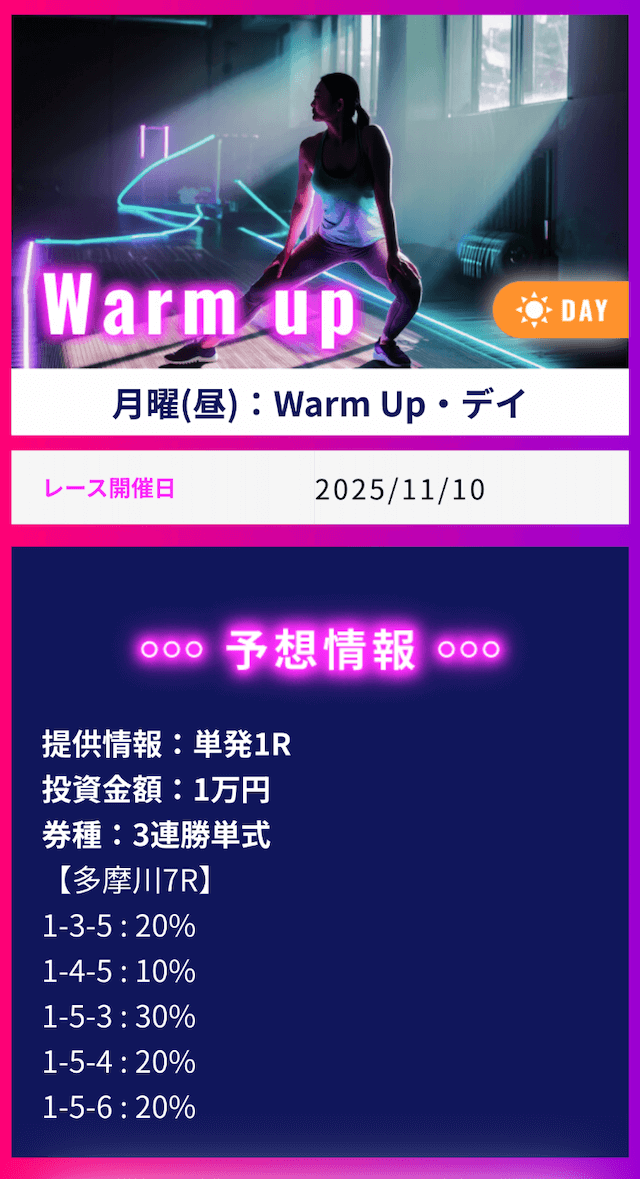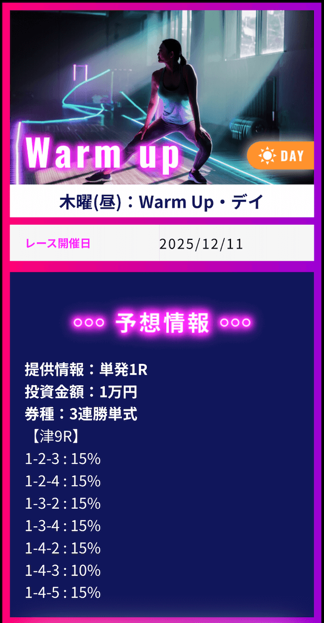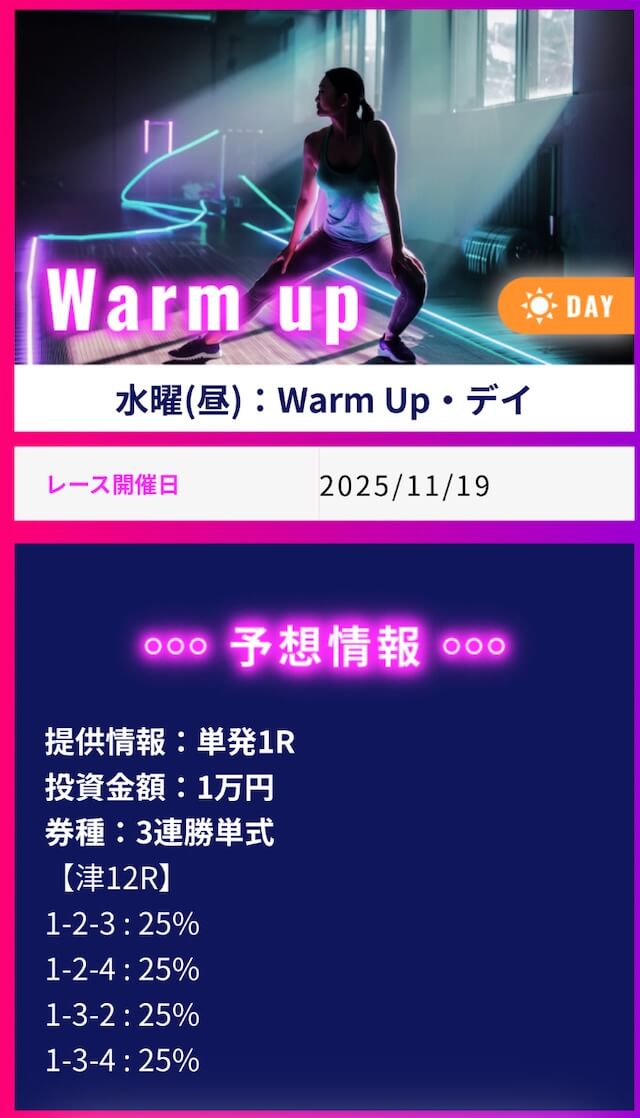 購入の締め切り時間が過ぎていたとしても、16時以降に「限定プラン」の案内が届くことがあるよ!!たぶん、直前に入った情報を加味された予想だから、いきなり案内が届くんだと思う。結構当たるし格安で参加できるから、メルマガは適宜チェックした方が良いかと!