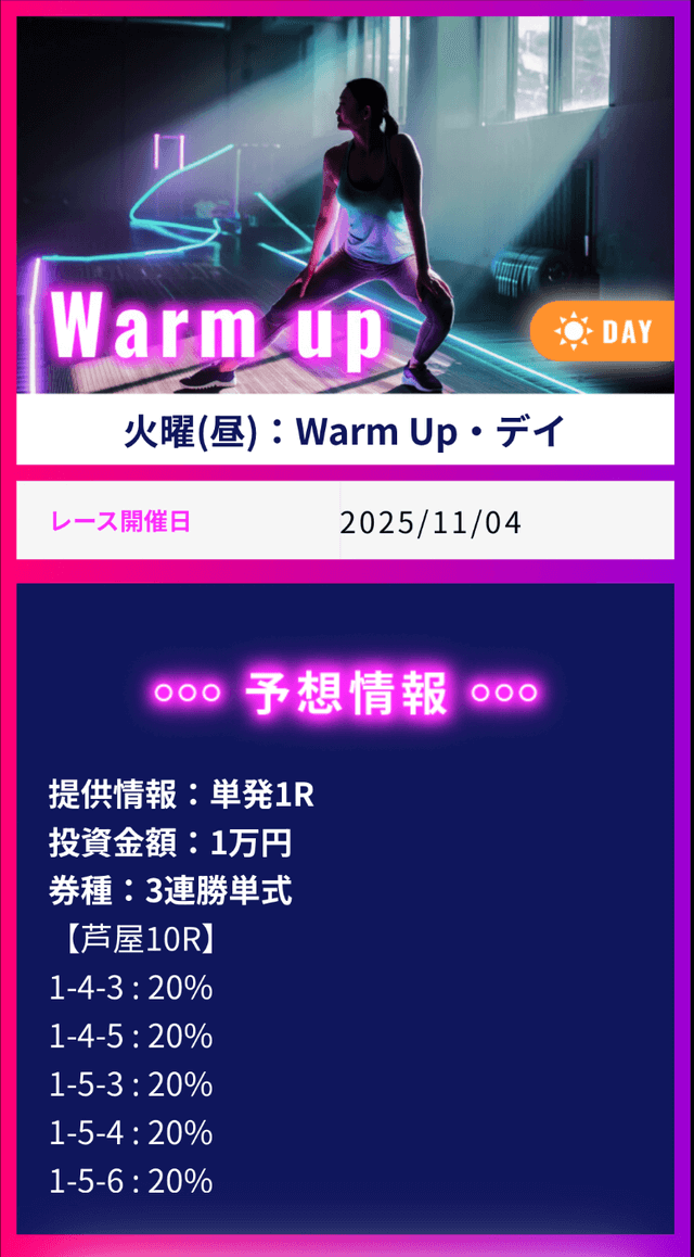 匿名無料予想の的中率が想像以上。1レースあたりのリターンはそこまで大きくないけど、4日連続で小さく当ててくれて、結果的に1万円近い利益に。こういう積み重ねって、意外と一番嬉しいですね。競艇ワークアウトの無料予想なかなかです。明日は有料予想にも挑戦してみたいと思います〜!投稿日:2025/08/10