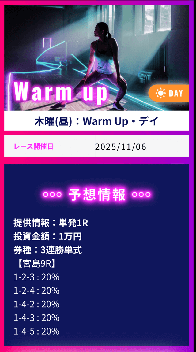 - 2025/12/09的中 無料予想で69,900円獲得2025/12/02的中 無料予想で25,500円獲得2025/11/19的中 無料予想で10,750円獲得2025/11/18的中 無料予想で22,200円獲得2025/11/10的中 無料予想で22,200円獲得2025/11/07的中 無料予想で31,650円獲得2025/10/23的中 無料予想で26,250円獲得2025/10/22的中 無料予想で25,000円獲得2025/10/20的中 無料予想で66,000円獲得2025/10/08的中 無料予想で30,600円獲得