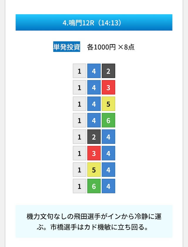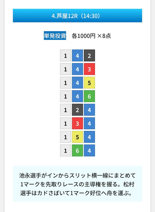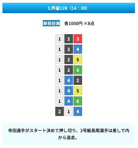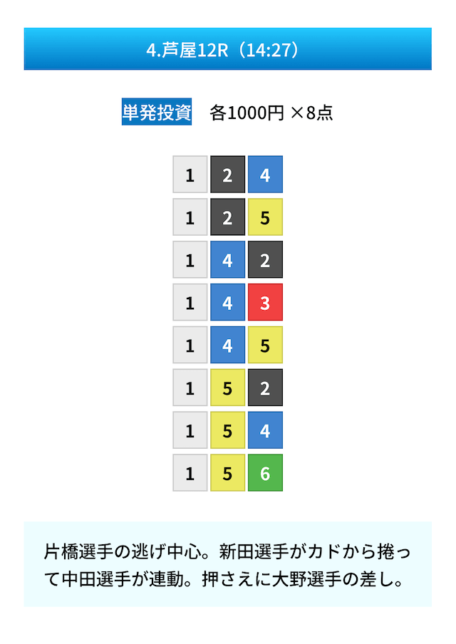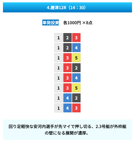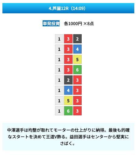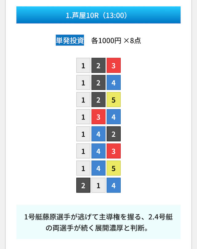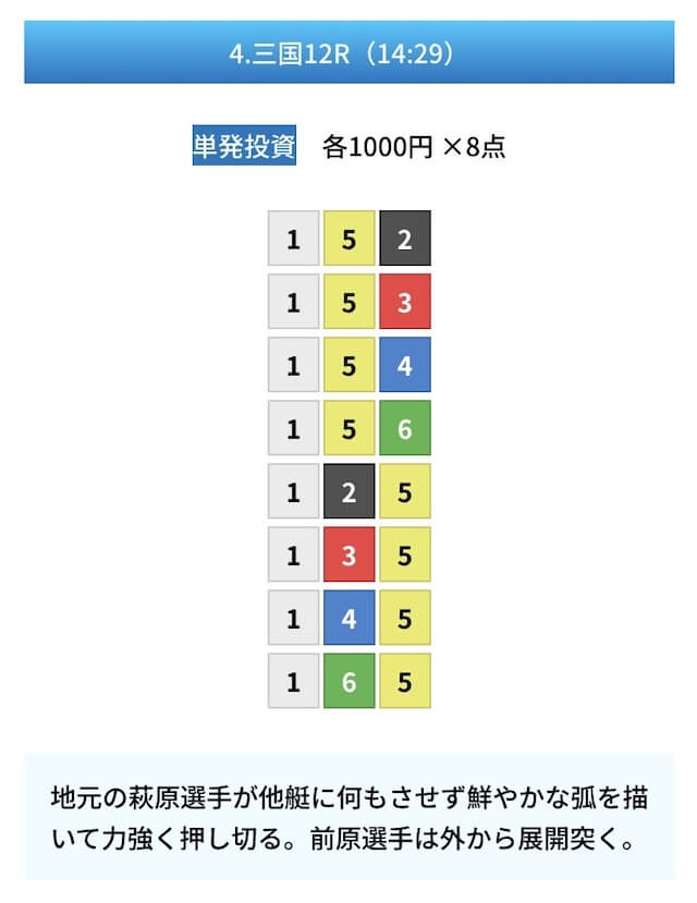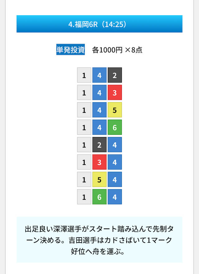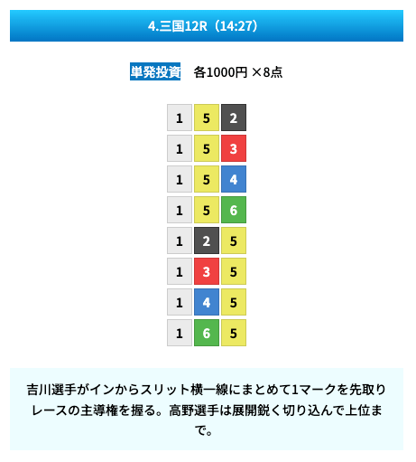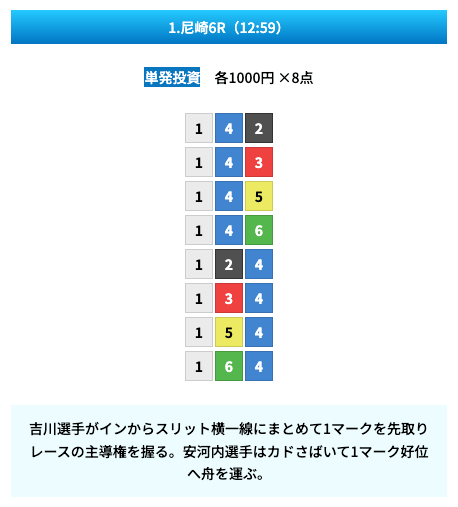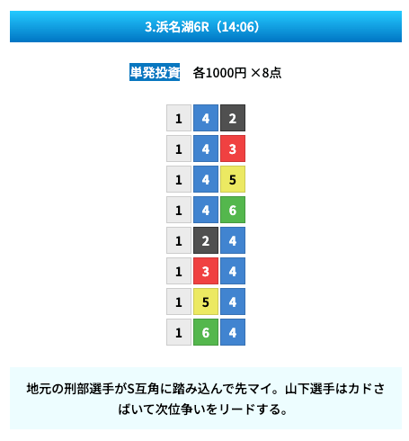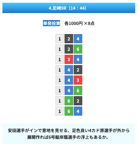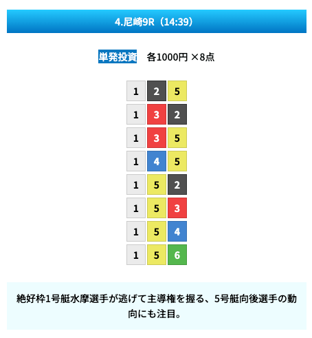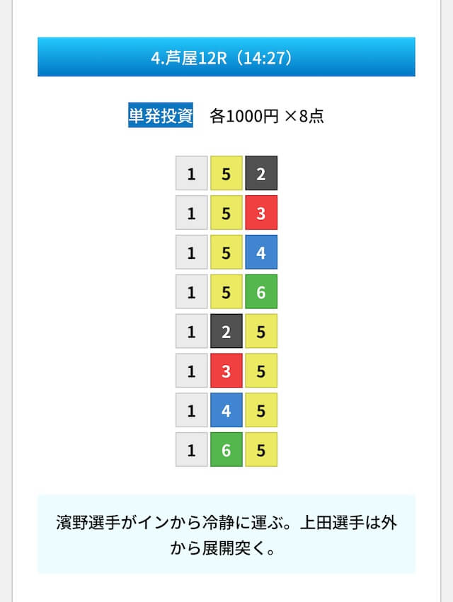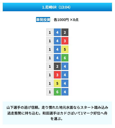 買い目は①④号艇を軸に置いて、②⑤号艇を絡めた組み合わせ。