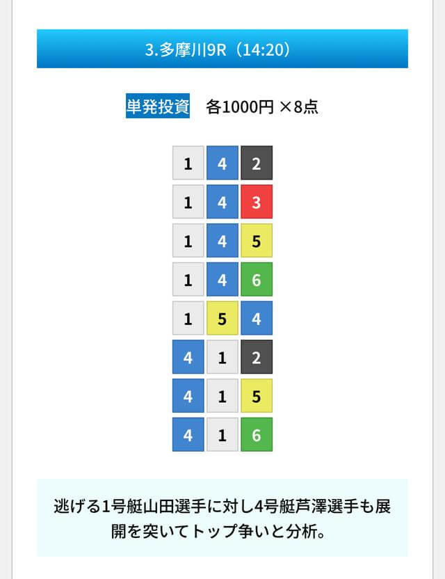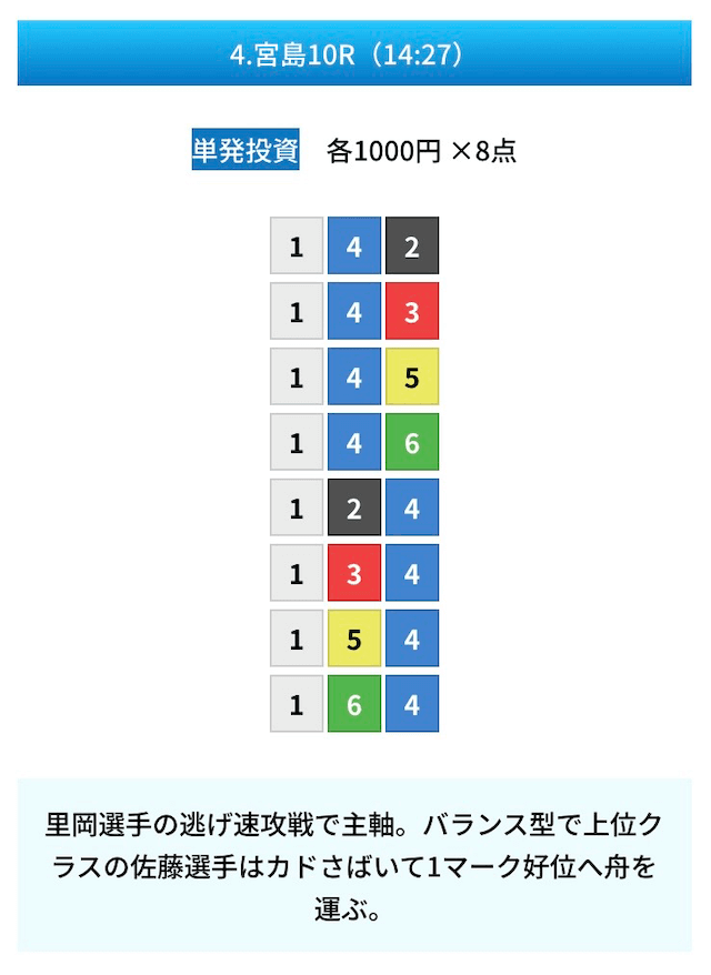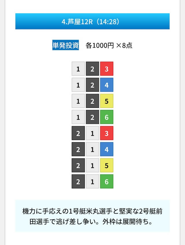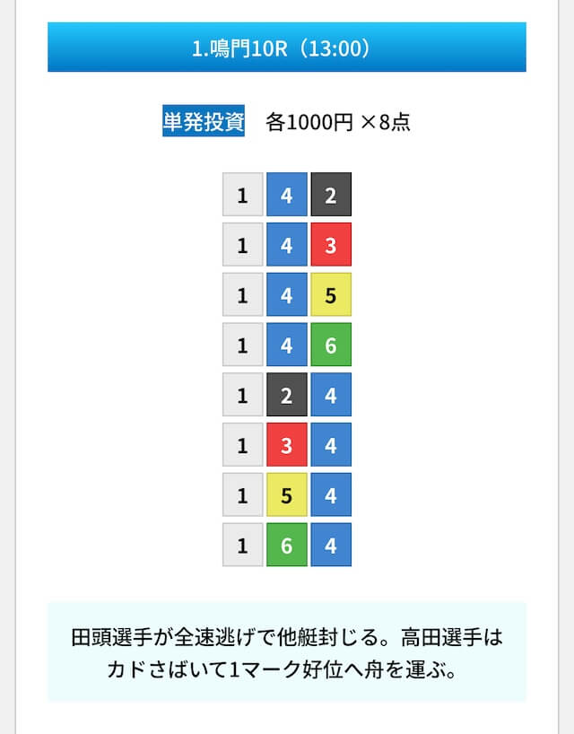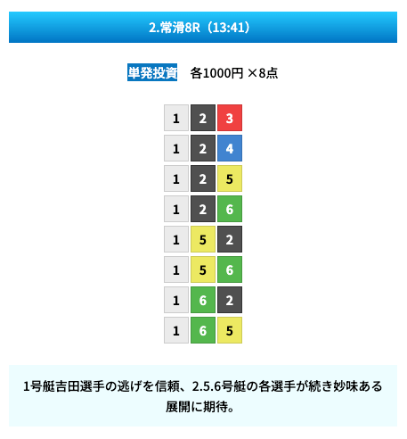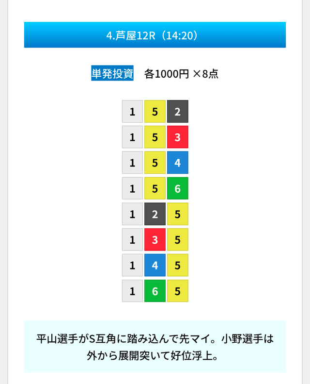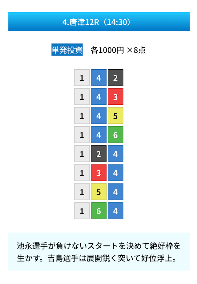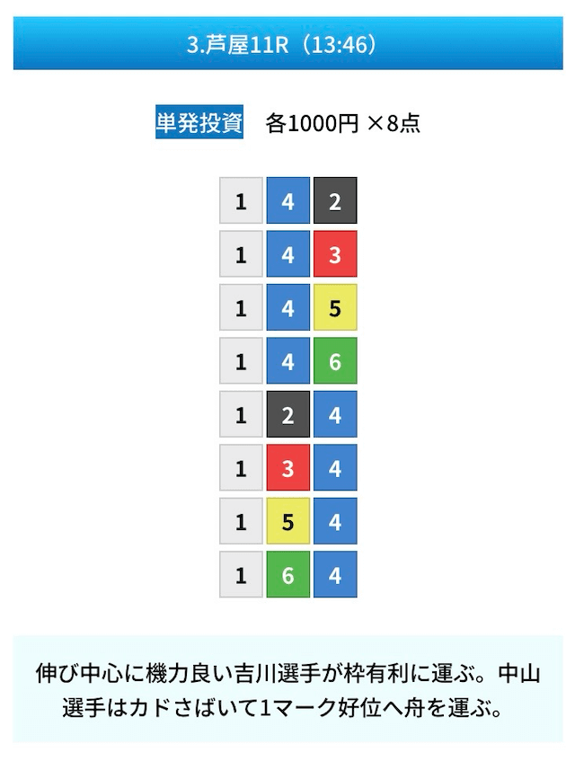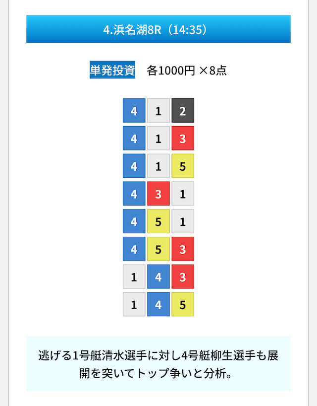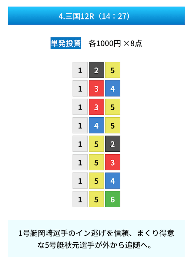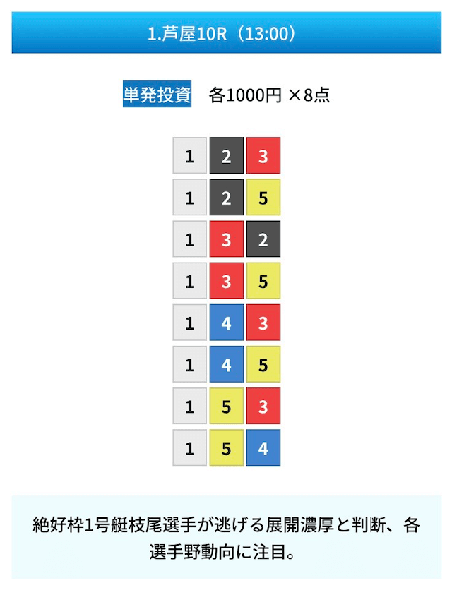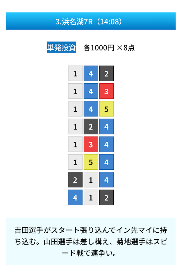 買い目は①④号艇を軸に置いて、②⑤号艇を絡めた組み合わせ。