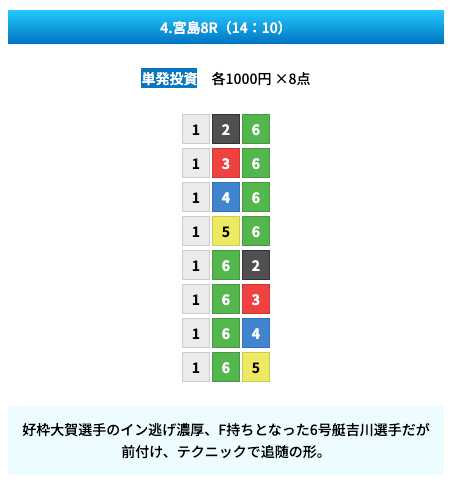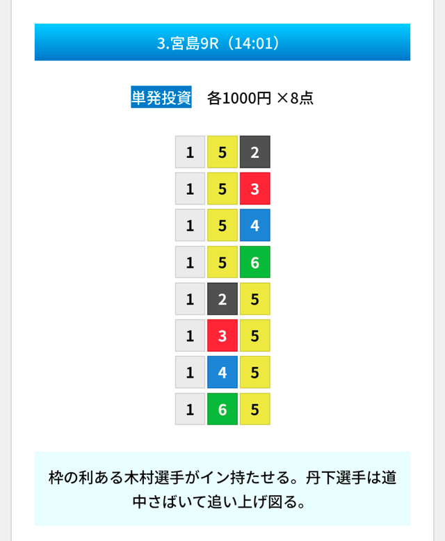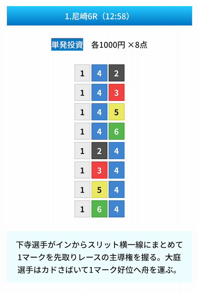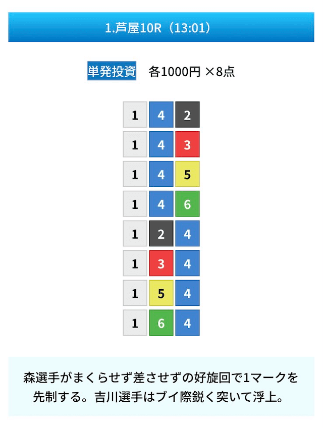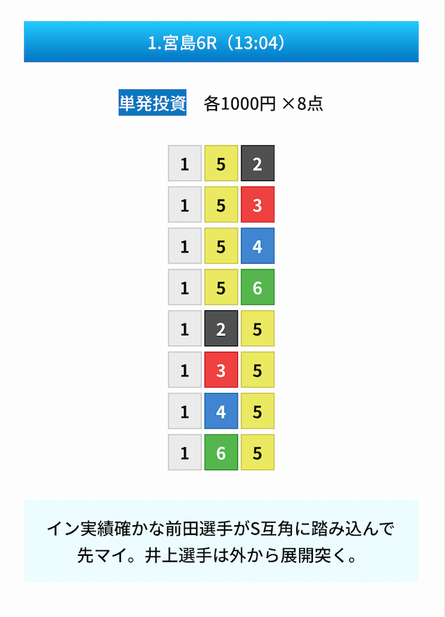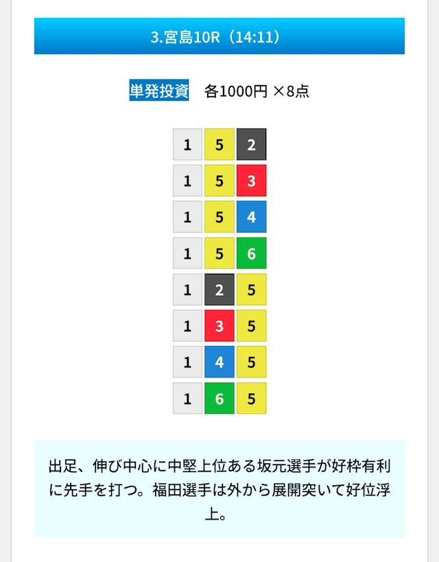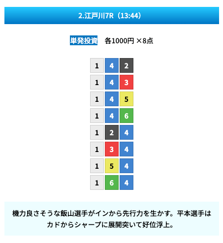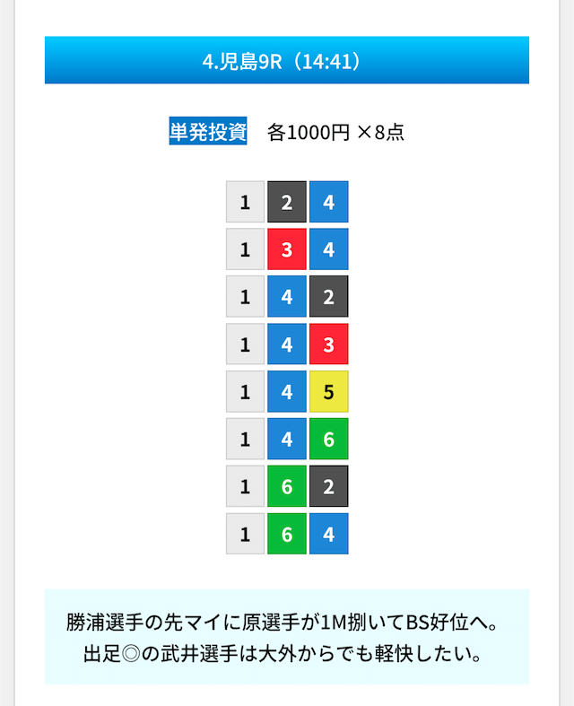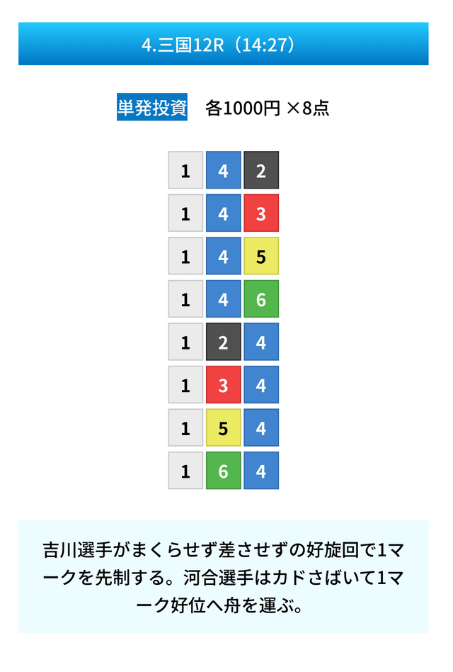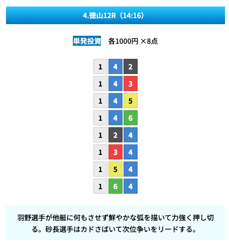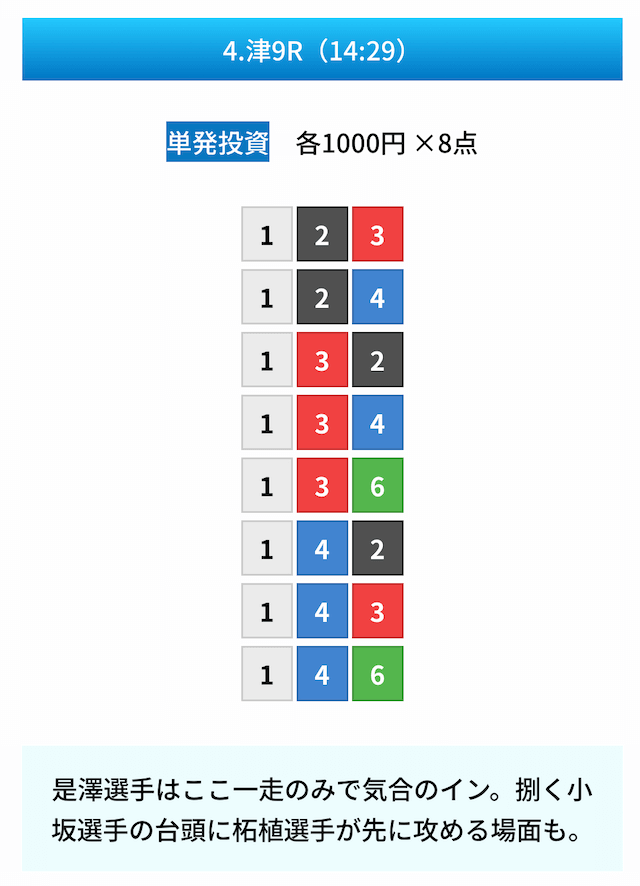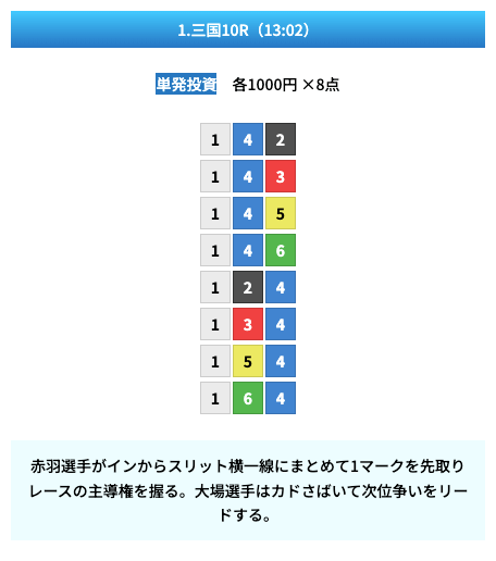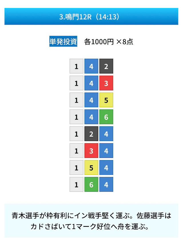 買い目は①④号艇を軸に置いて、②⑤号艇を絡めた組み合わせ。