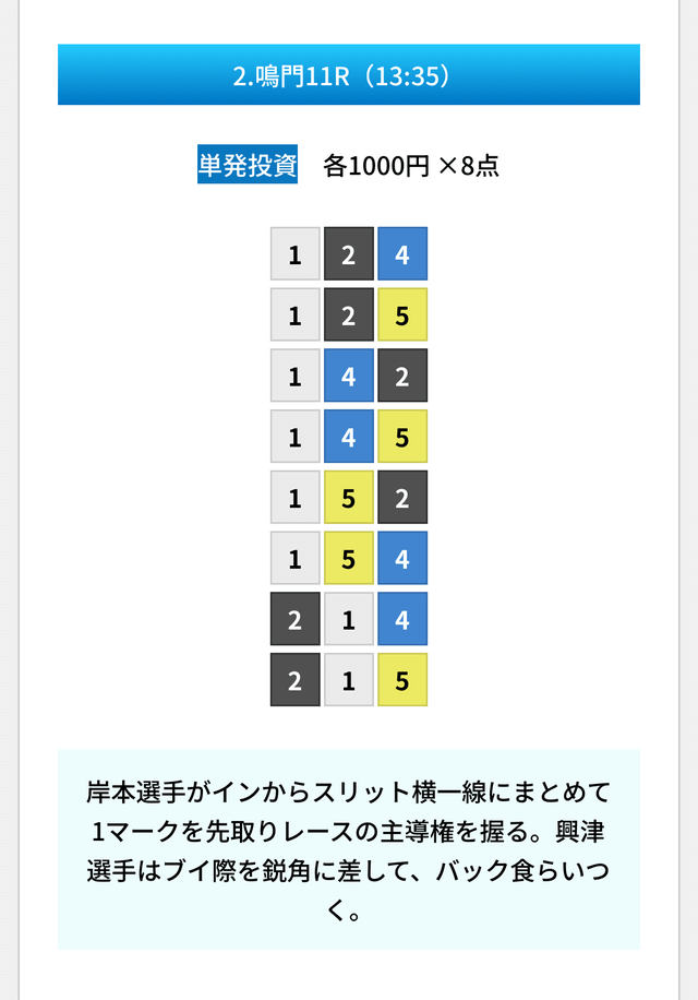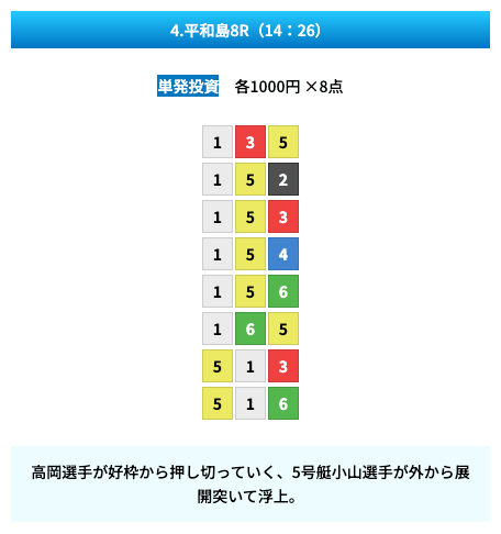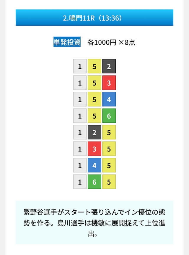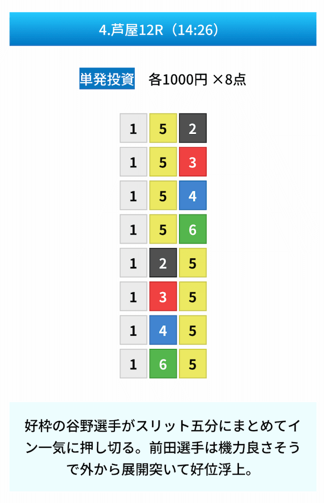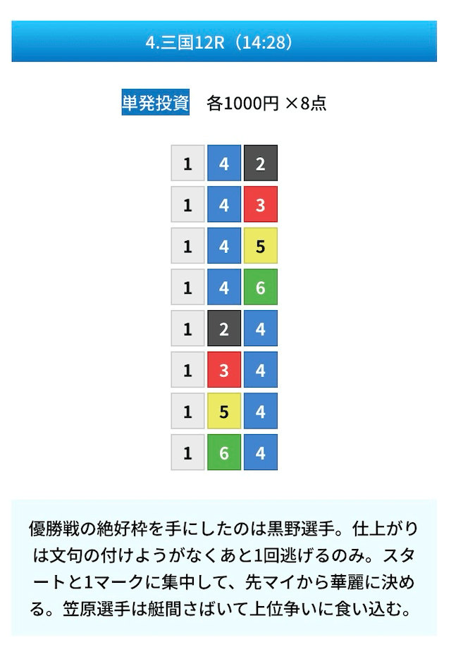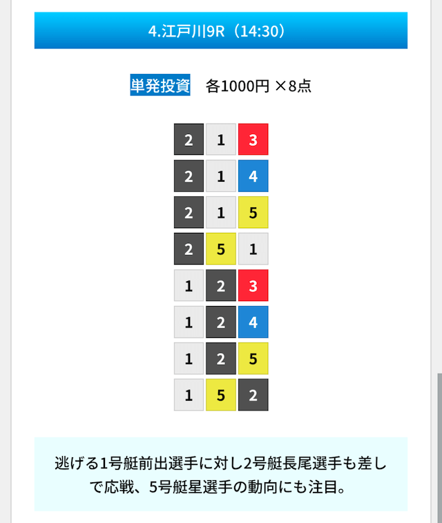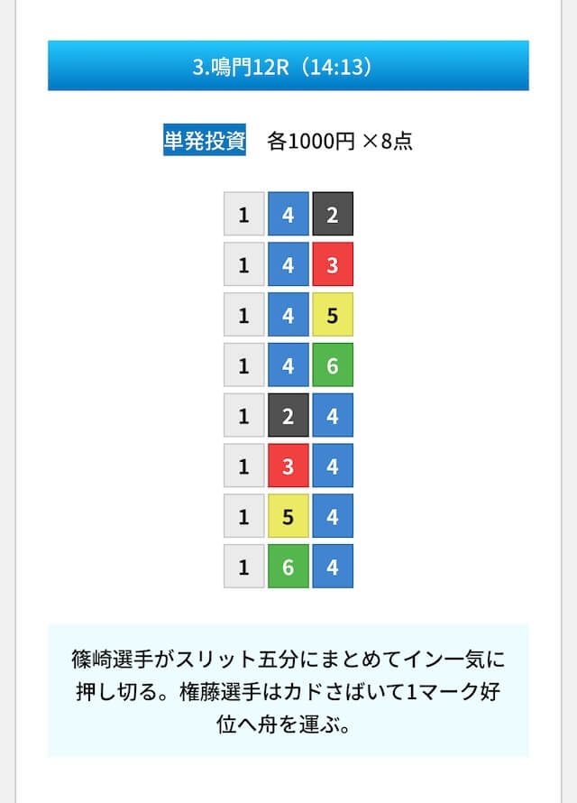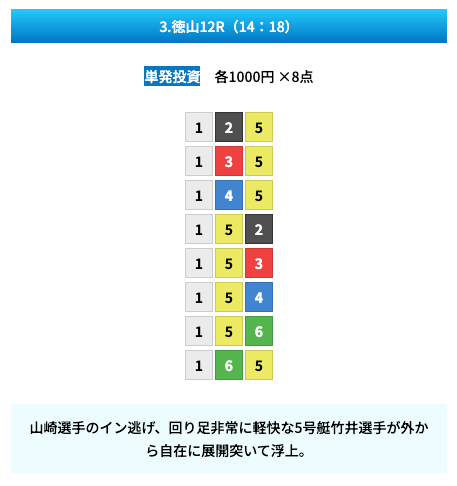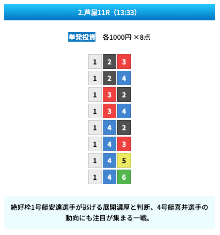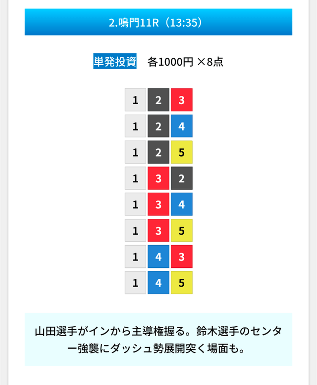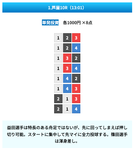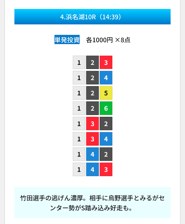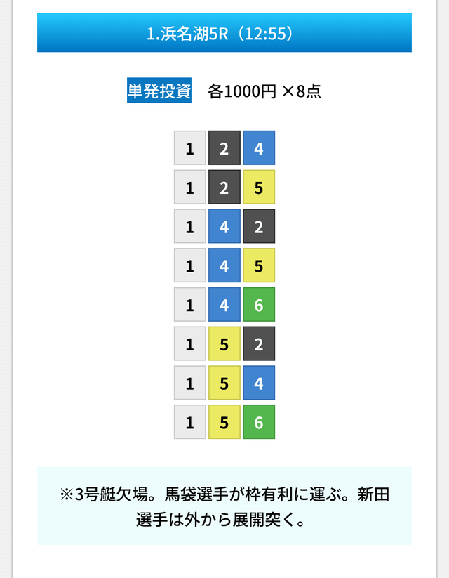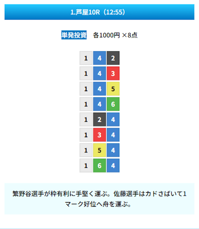 買い目は①④号艇を軸に置いて、②⑤号艇を絡めた組み合わせ。