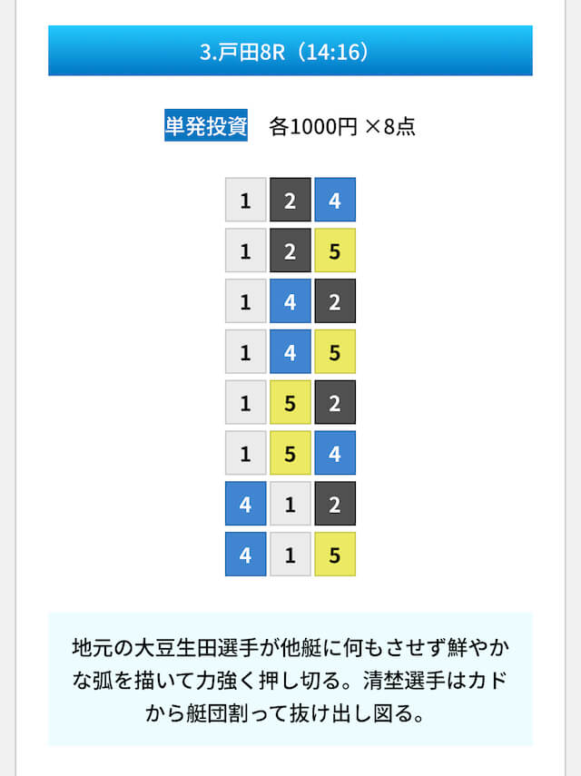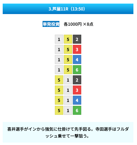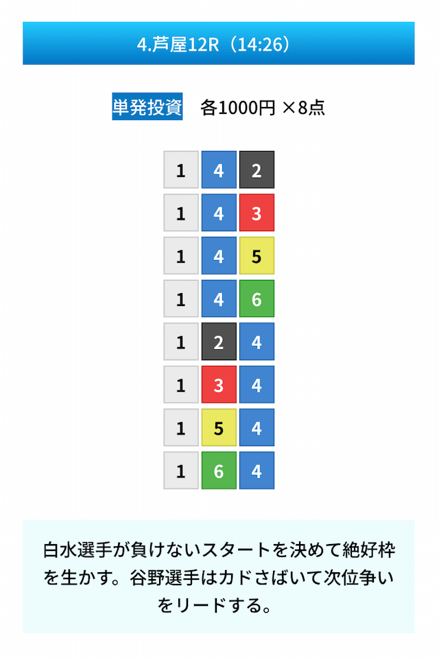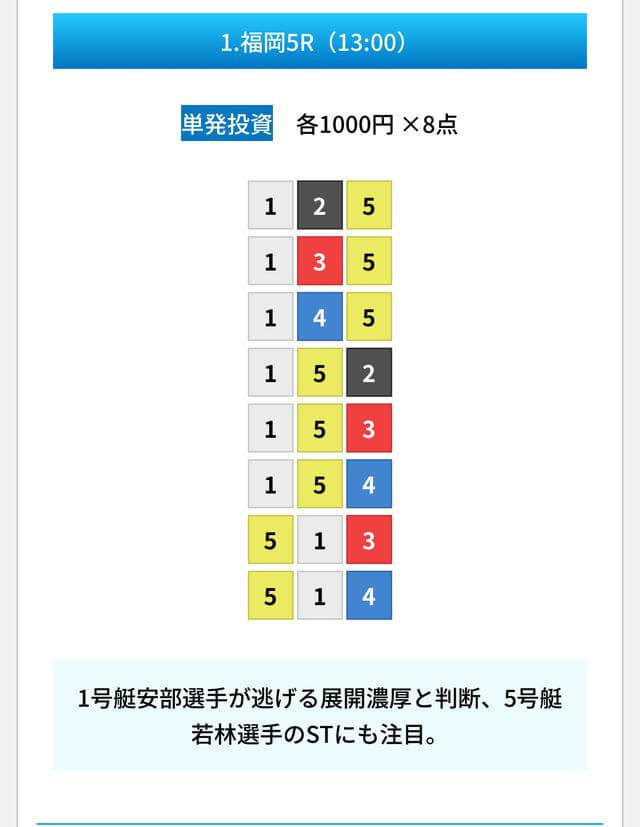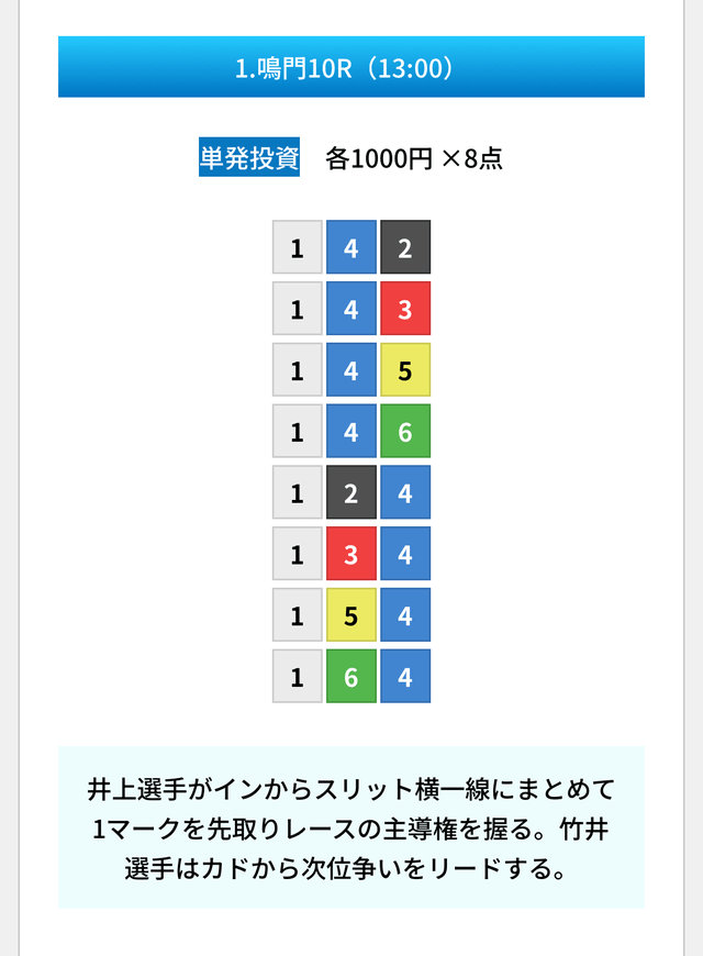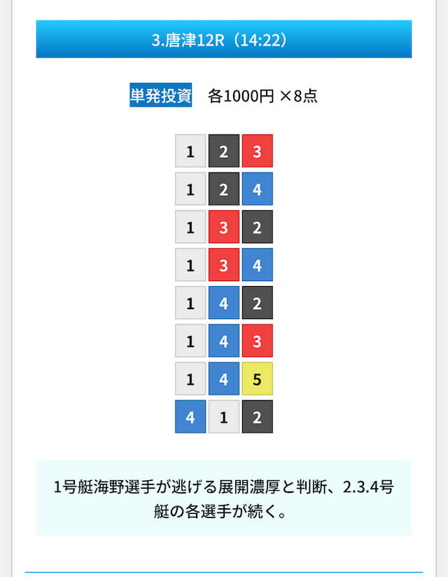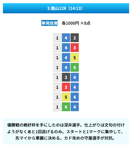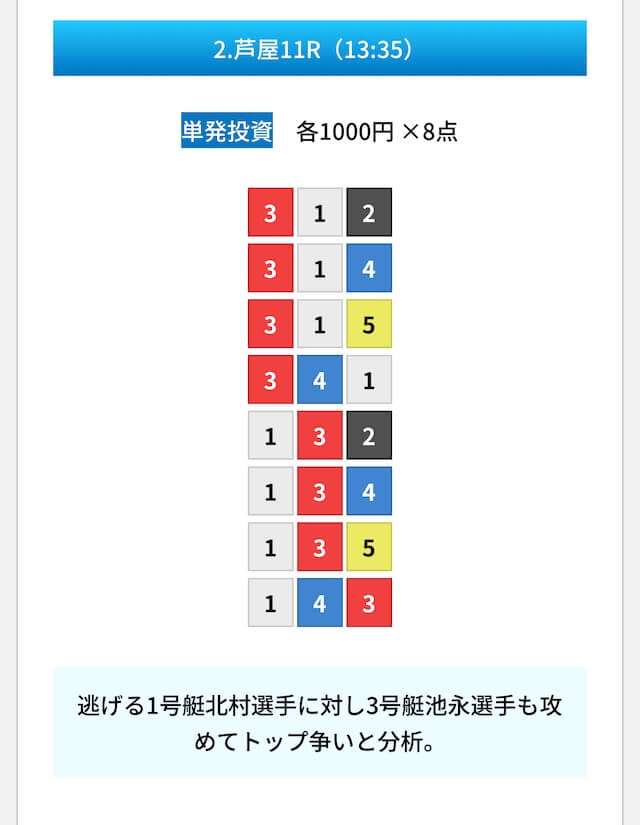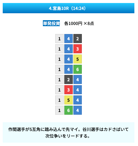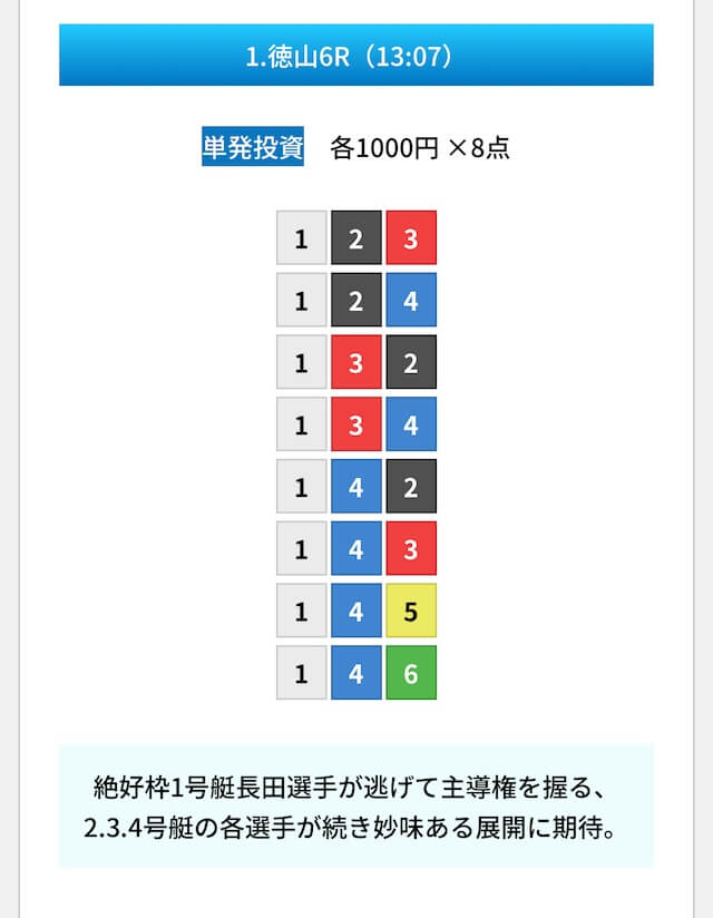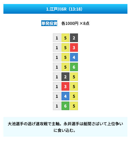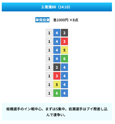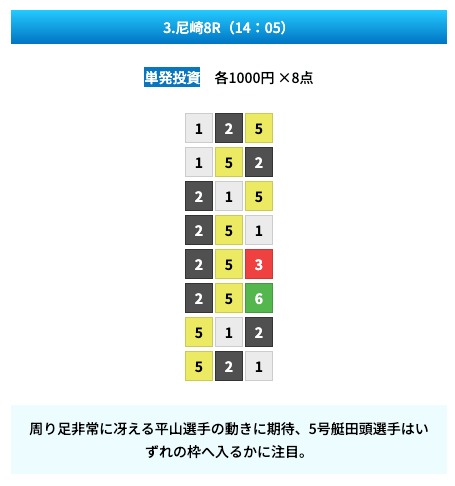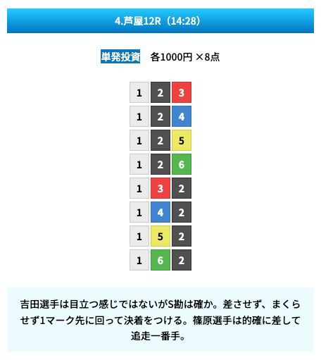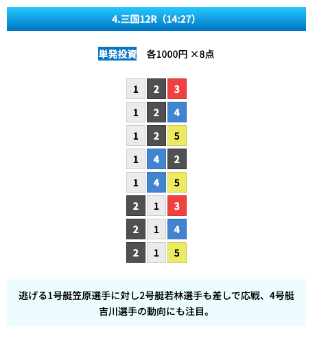 買い目は①④号艇を軸に置いて、②⑤号艇を絡めた組み合わせ。