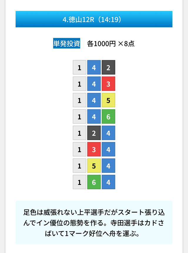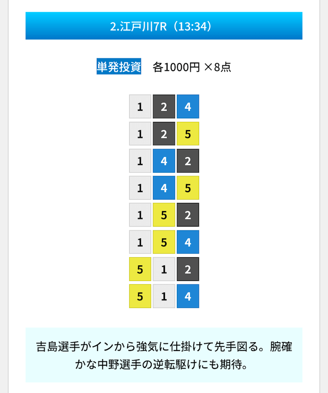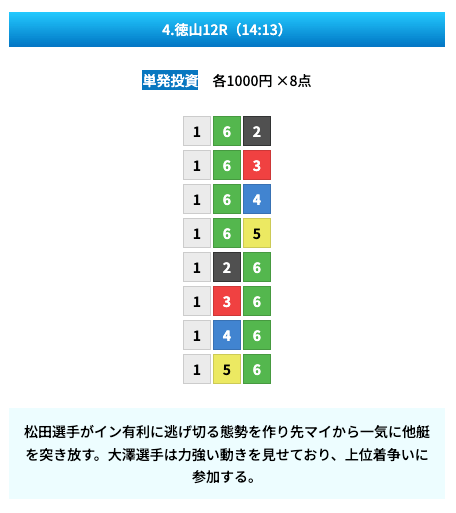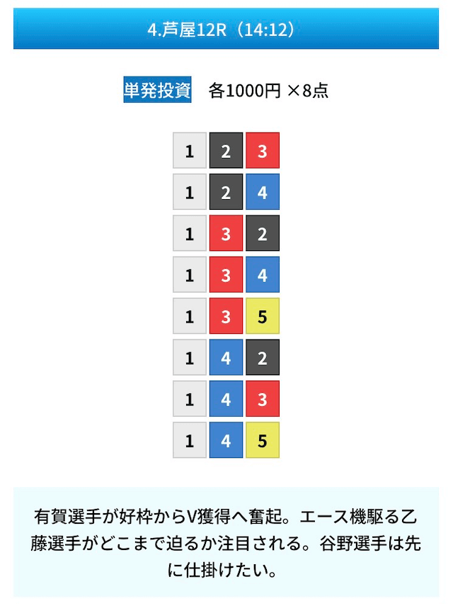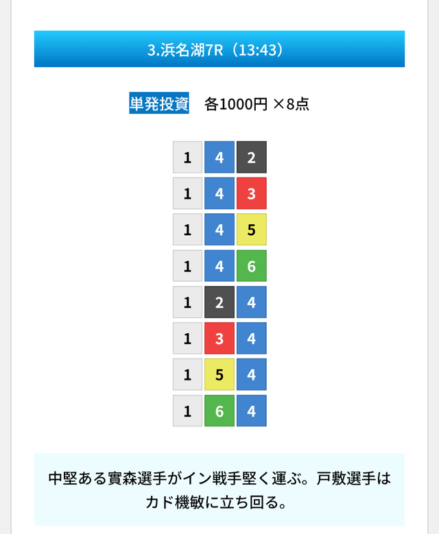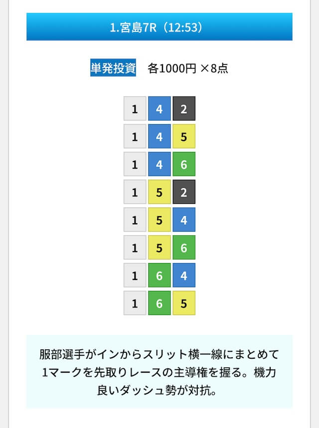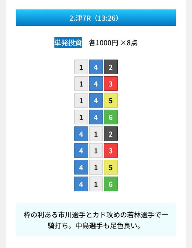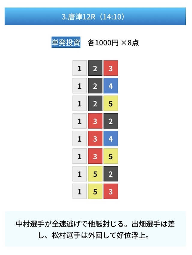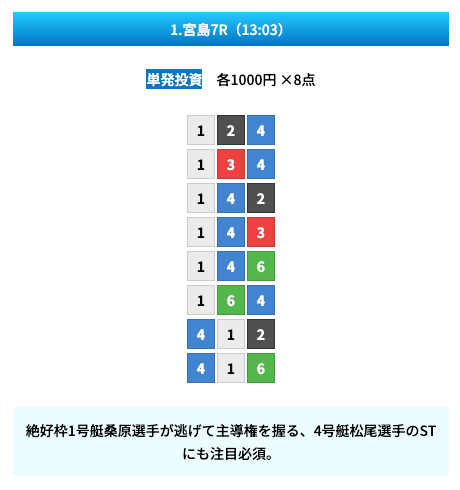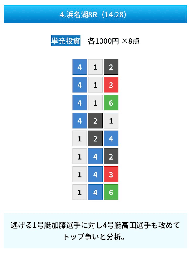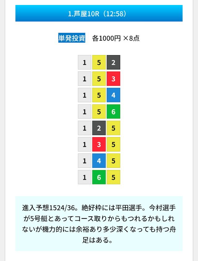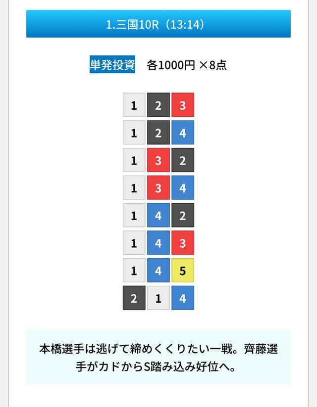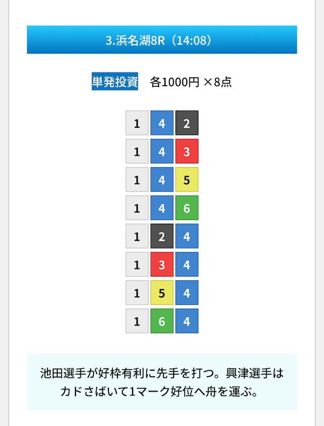 買い目は①④号艇を軸に置いて、②⑤号艇を絡めた組み合わせ。