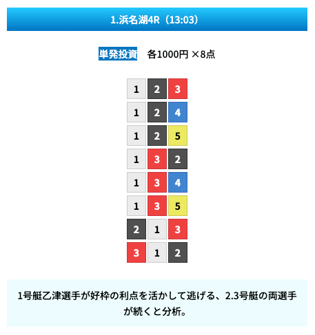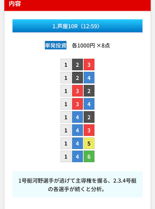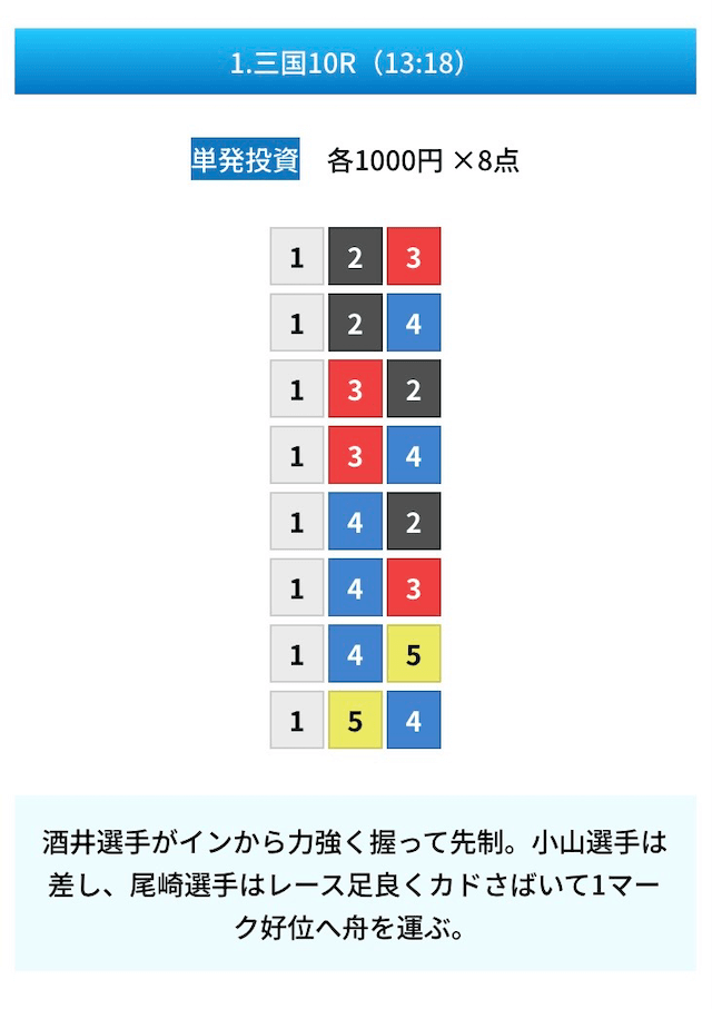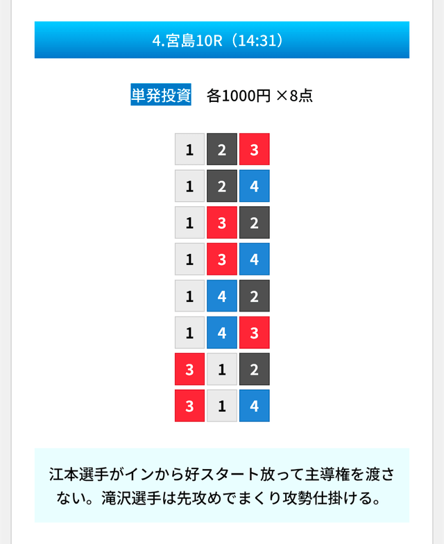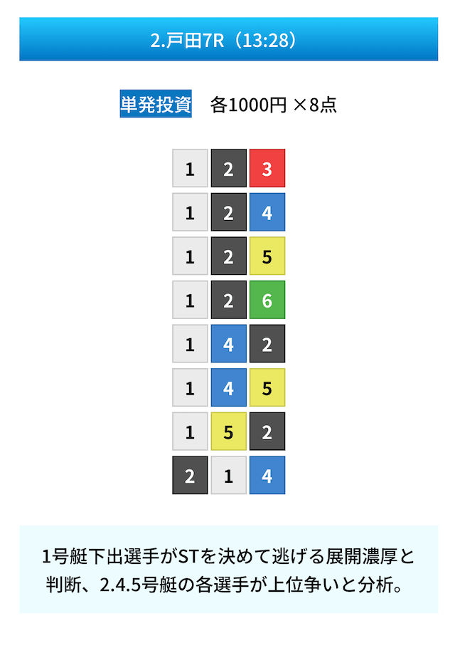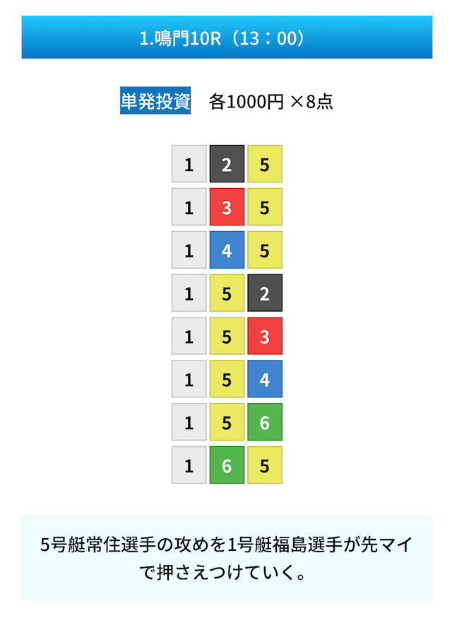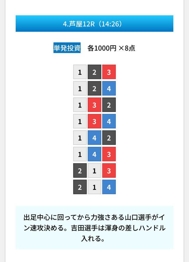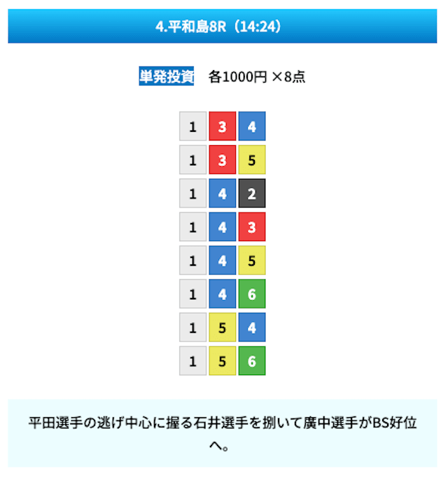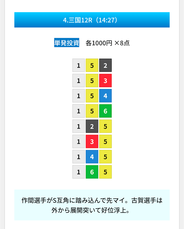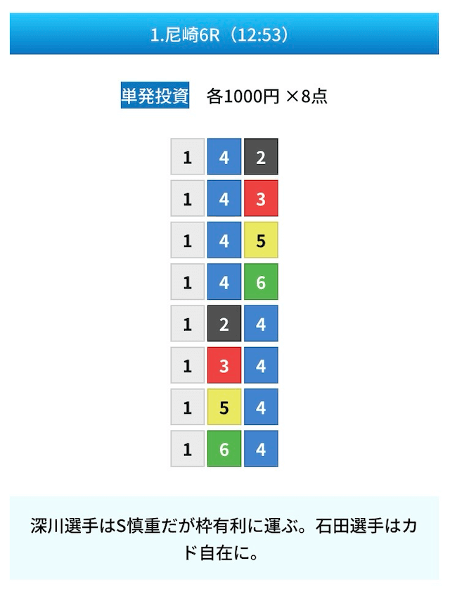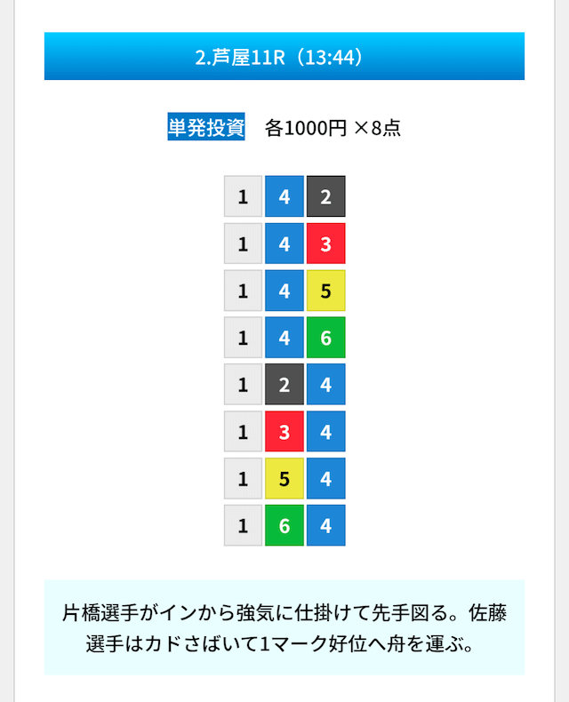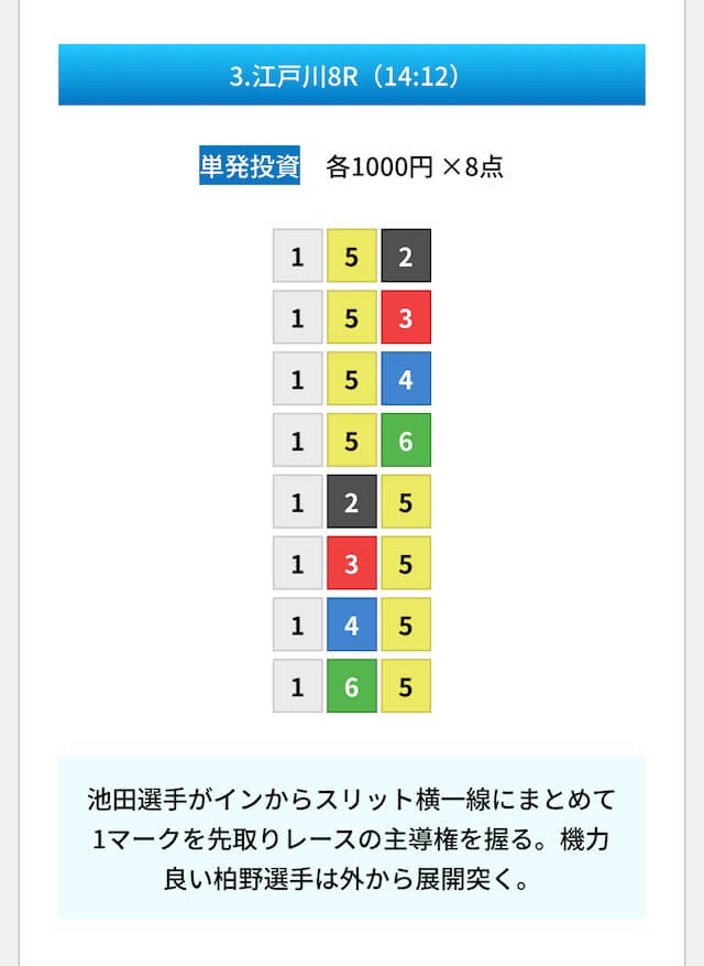 買い目は①④号艇を軸に置いて、②⑤号艇を絡めた組み合わせ。