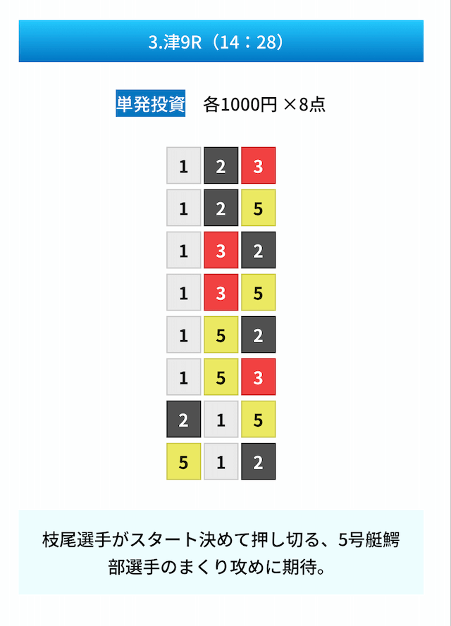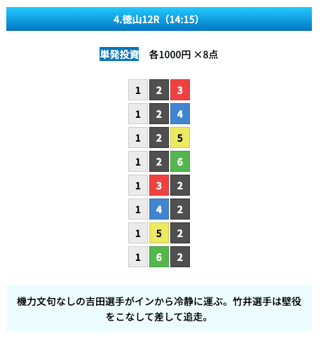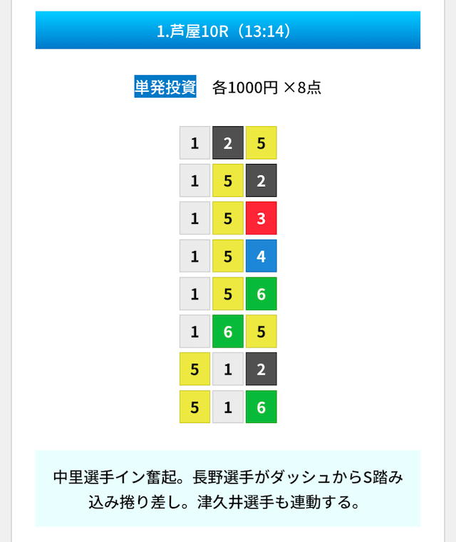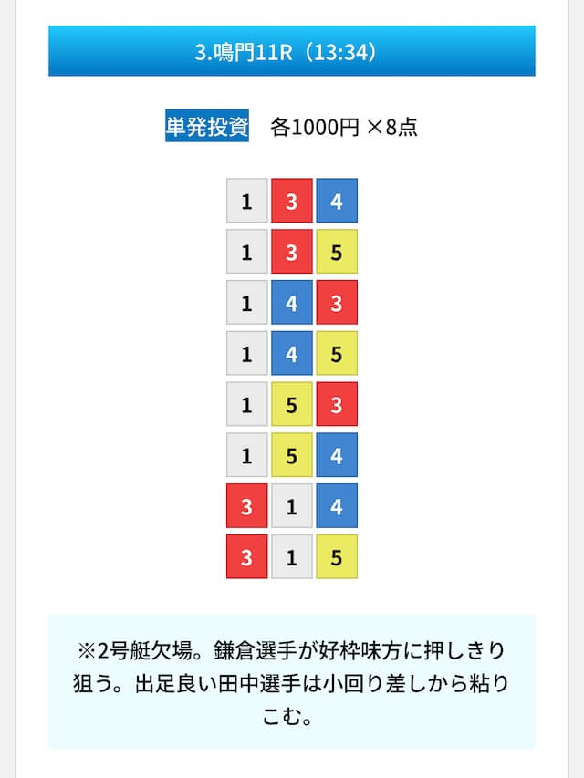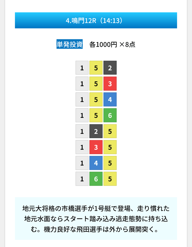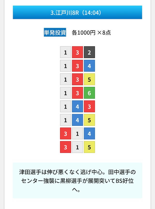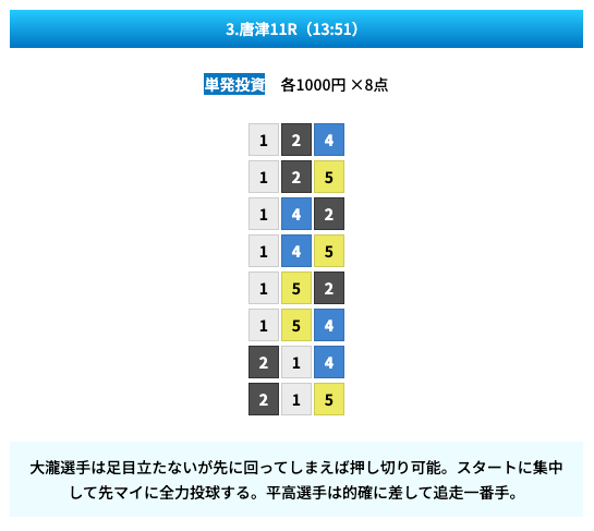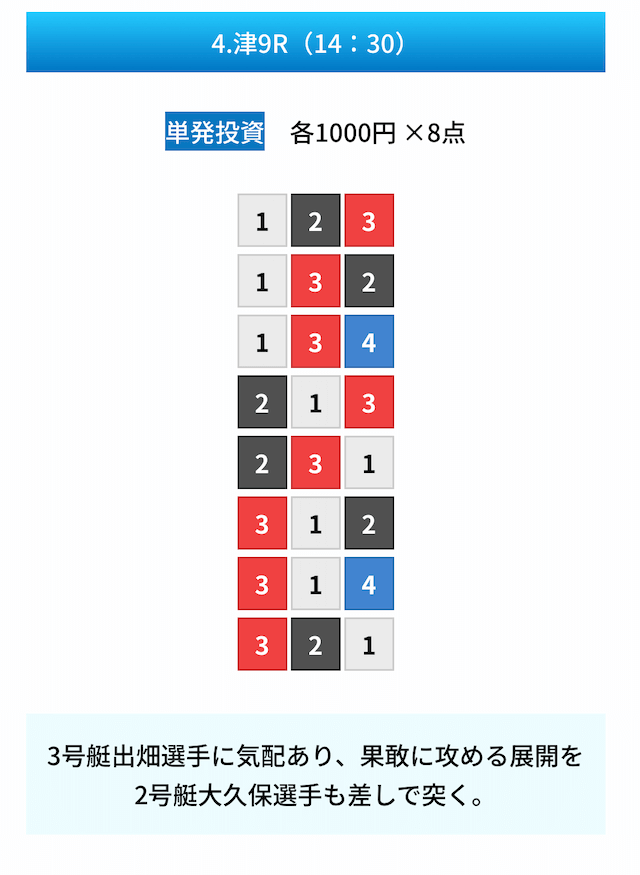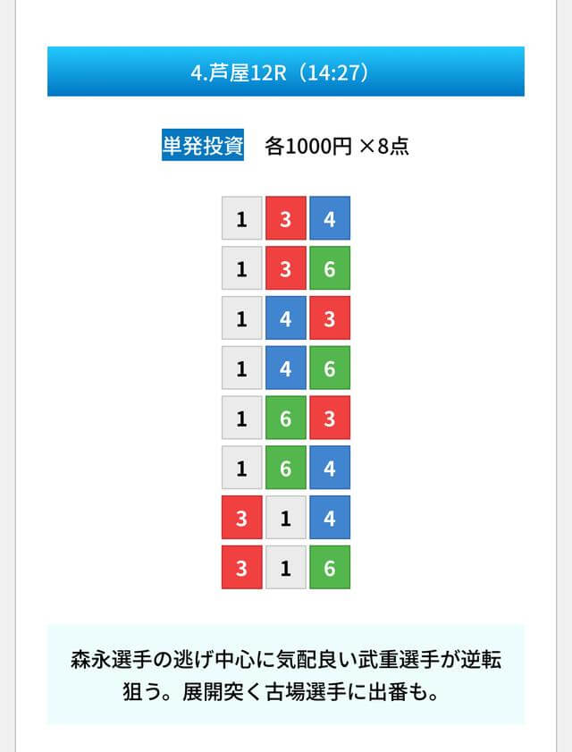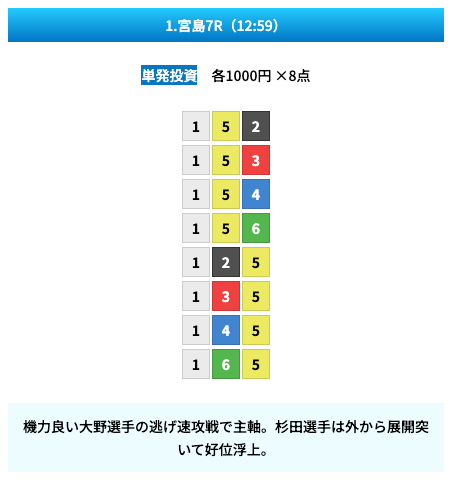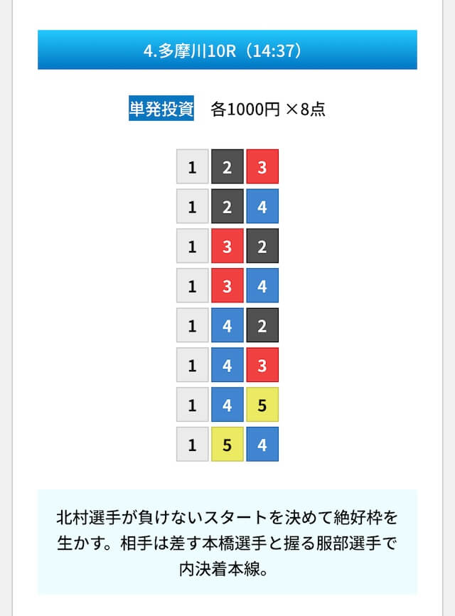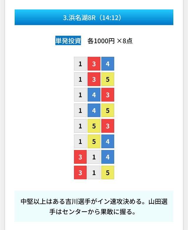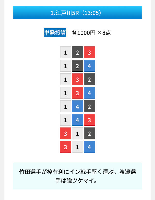 買い目は①④号艇を軸に置いて、②⑤号艇を絡めた組み合わせ。
