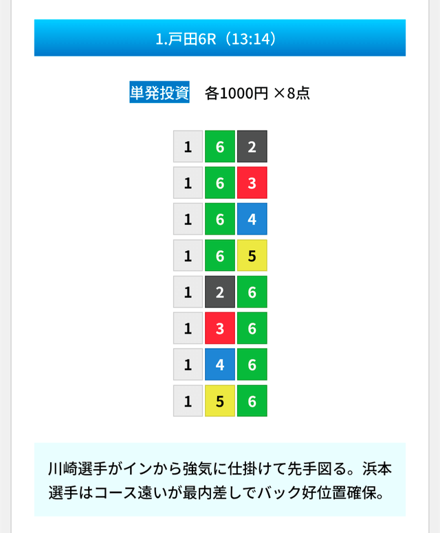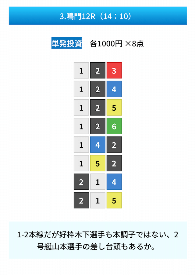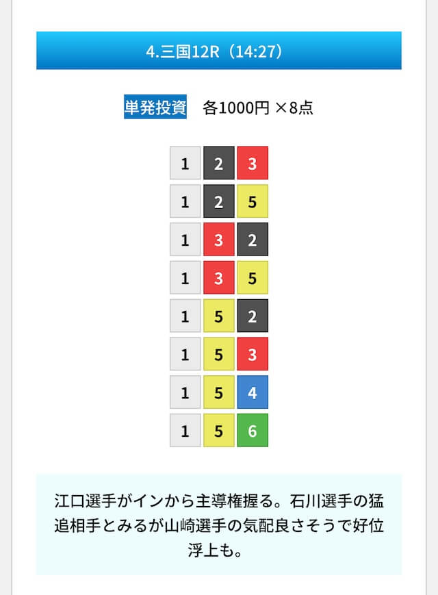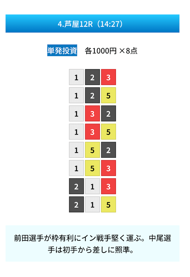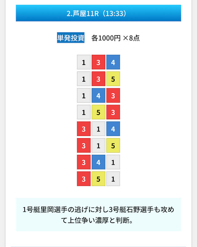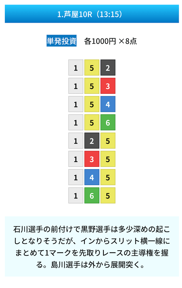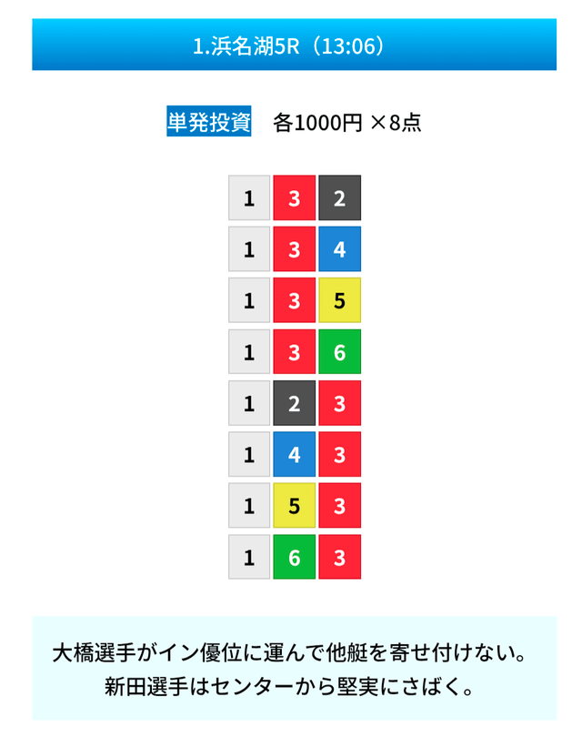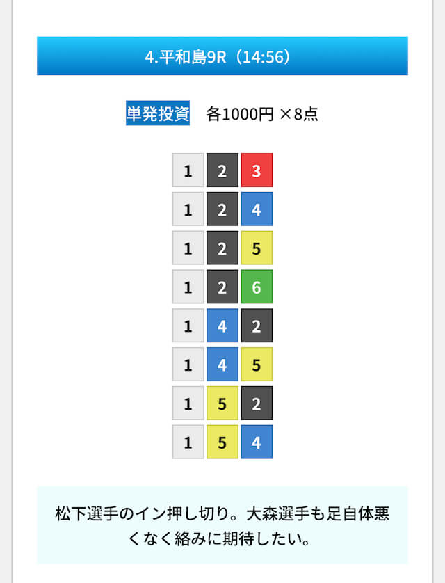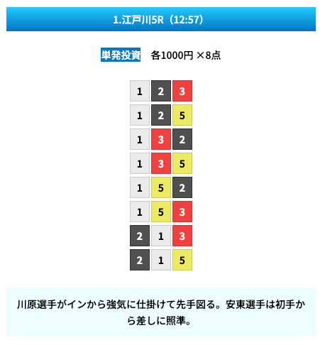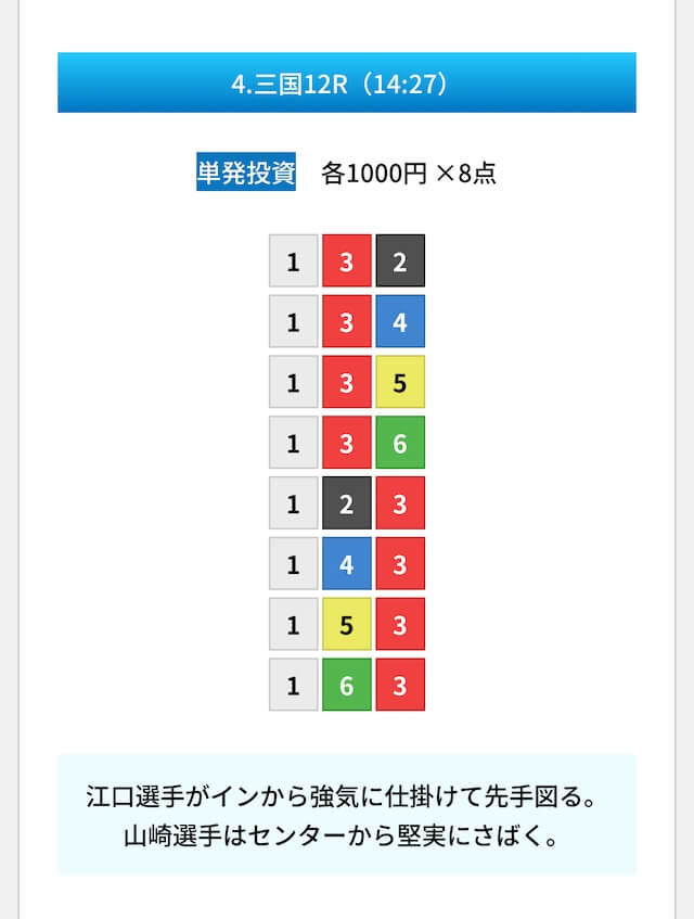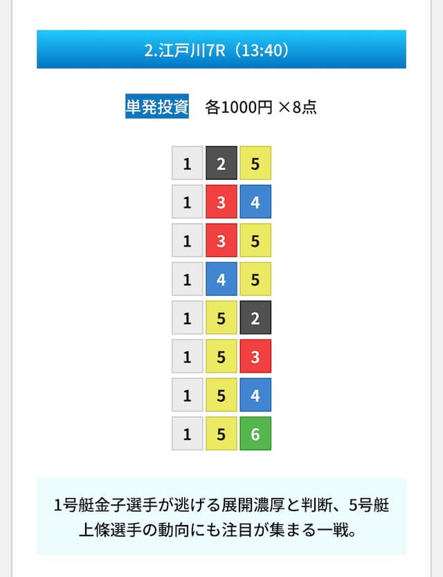買い目は①④号艇を軸に置いて、②⑤号艇を絡めた組み合わせ。