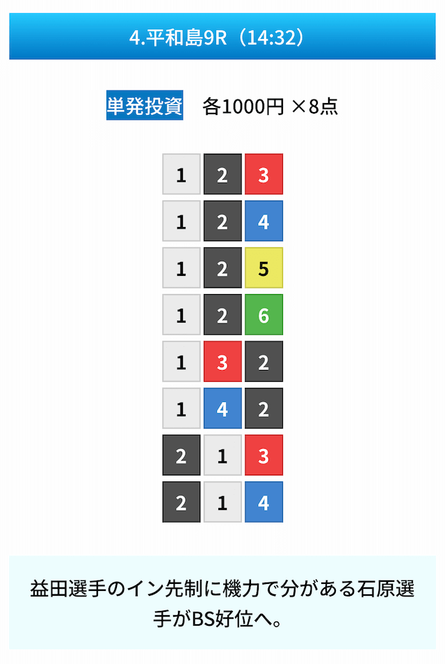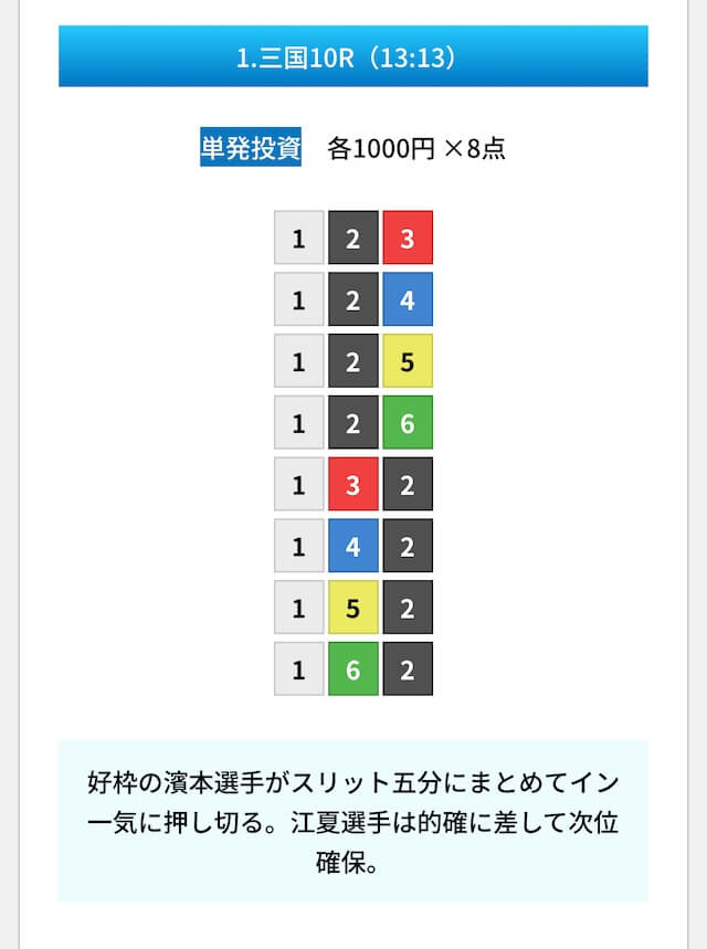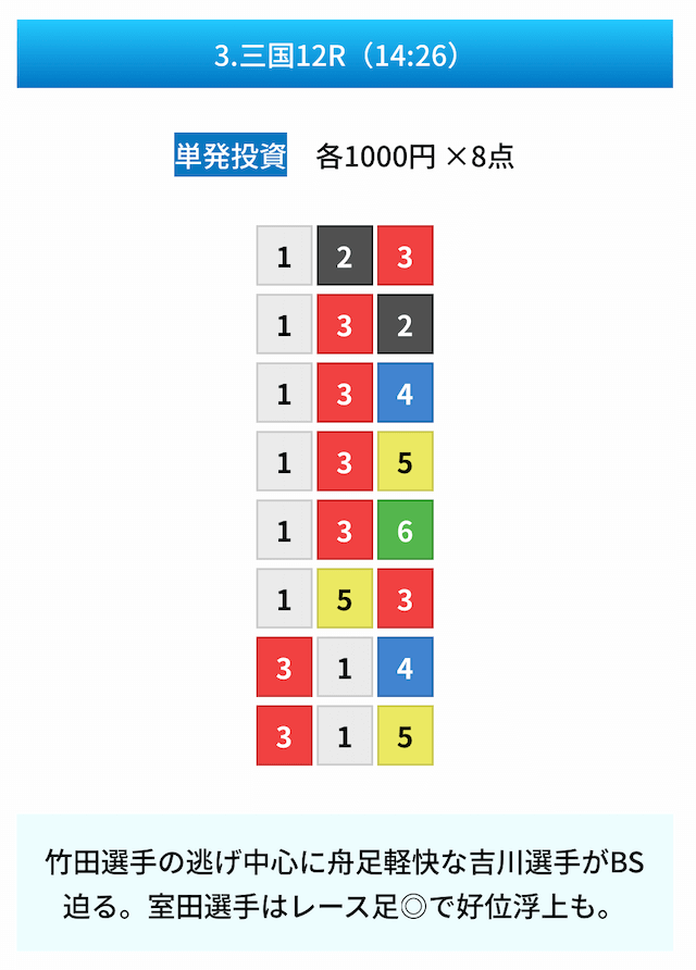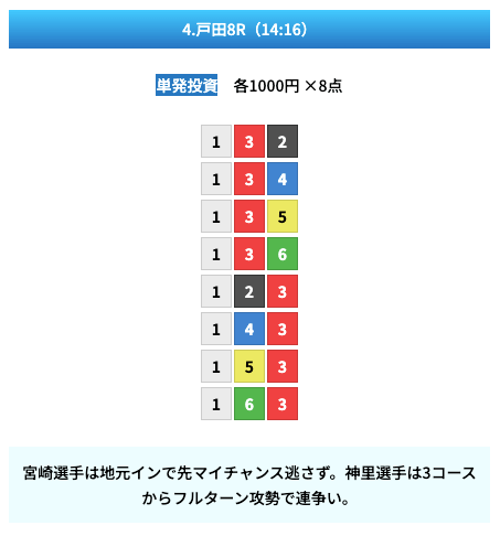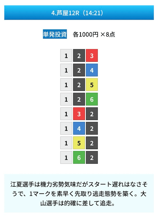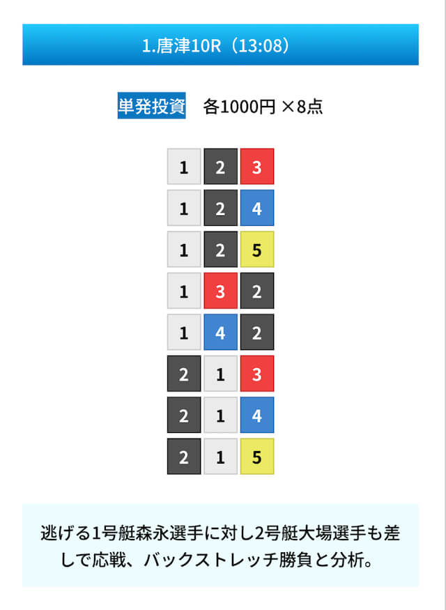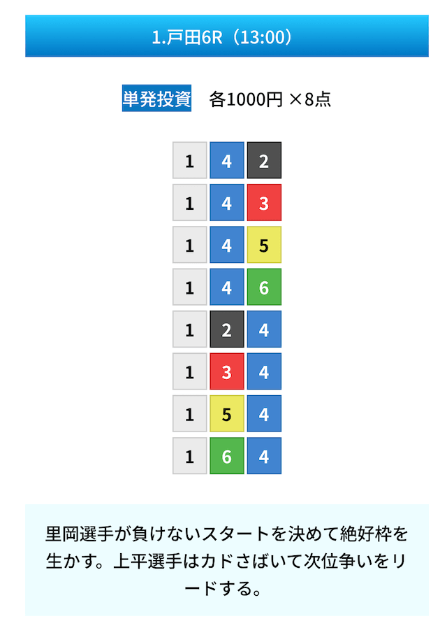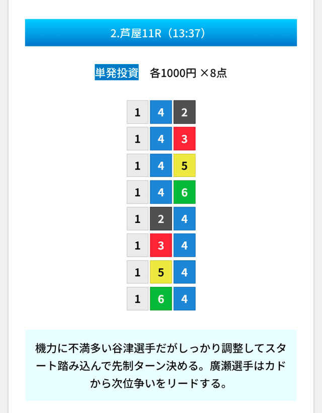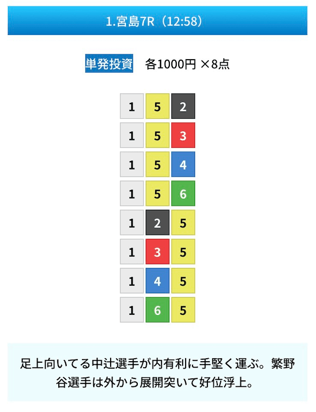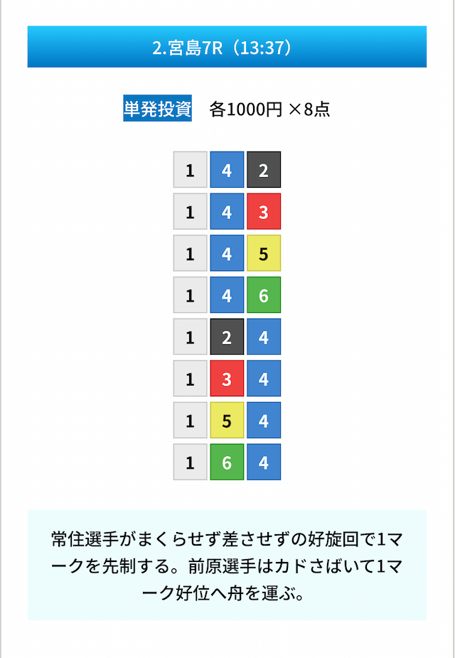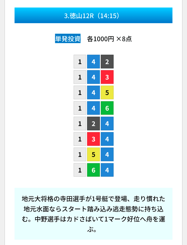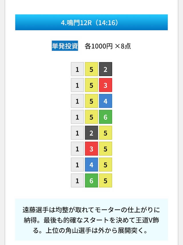 買い目は①④号艇を軸に置いて、②⑤号艇を絡めた組み合わせ。