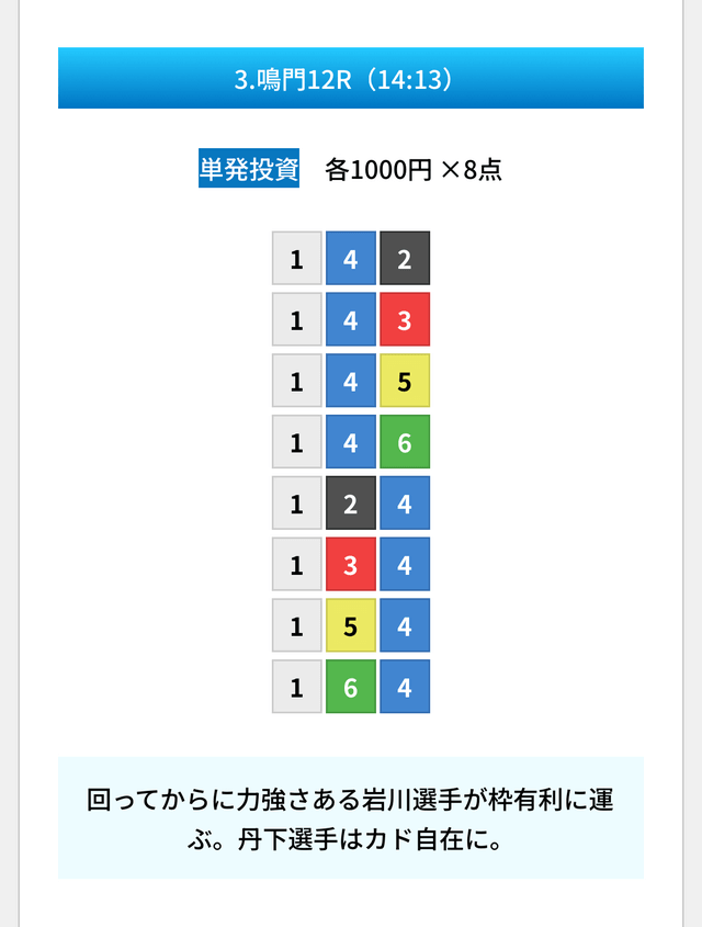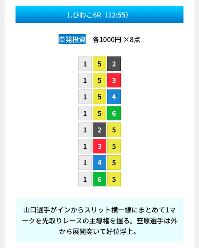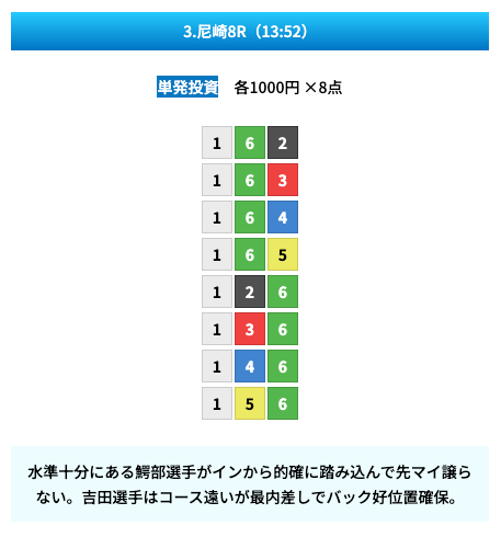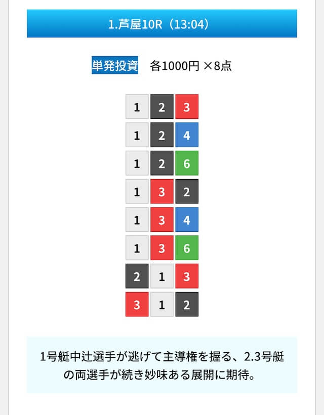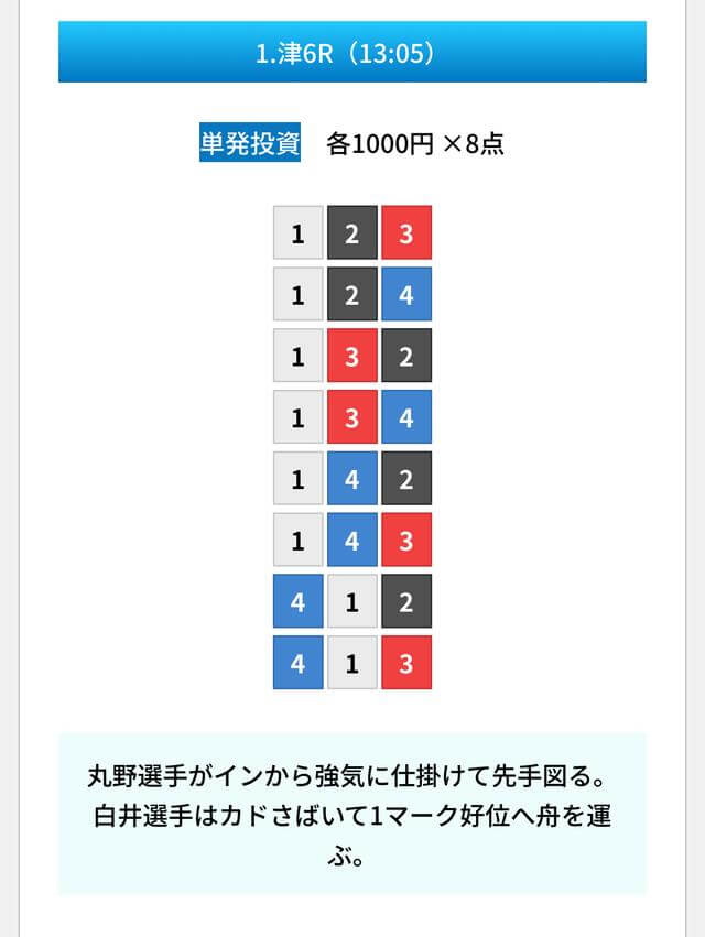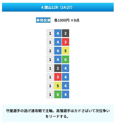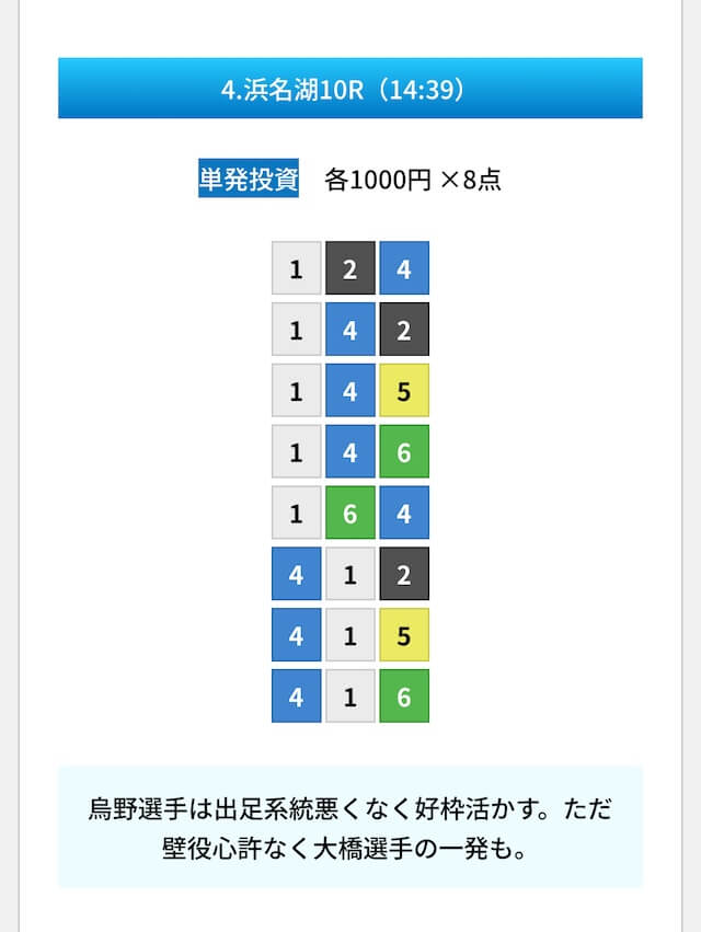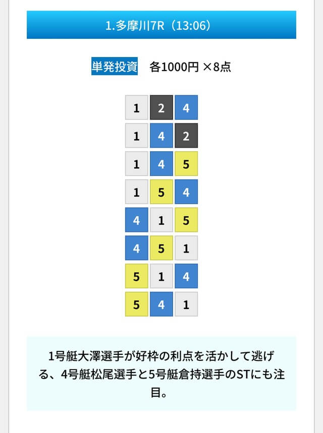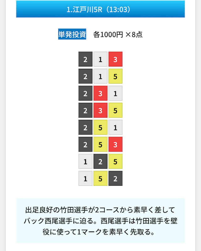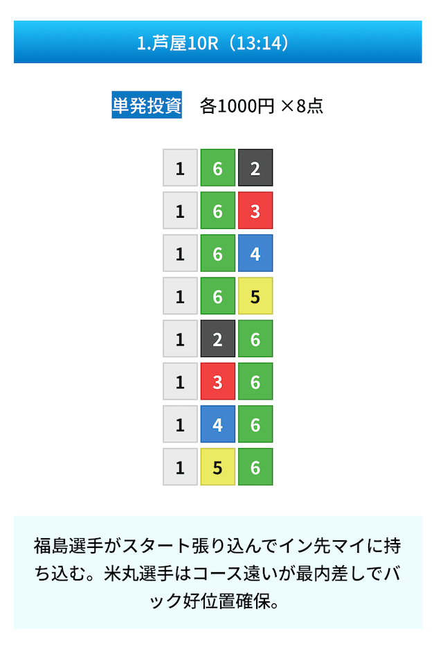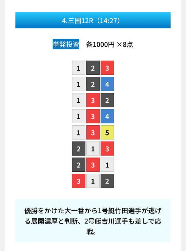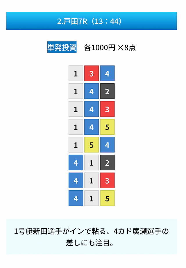 買い目は①④号艇を軸に置いて、②⑤号艇を絡めた組み合わせ。