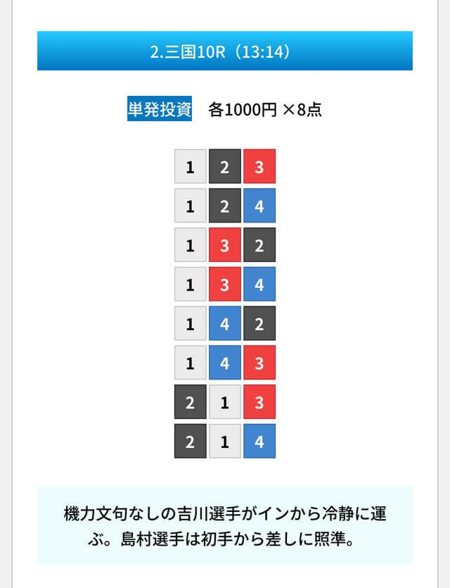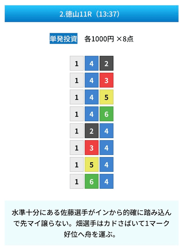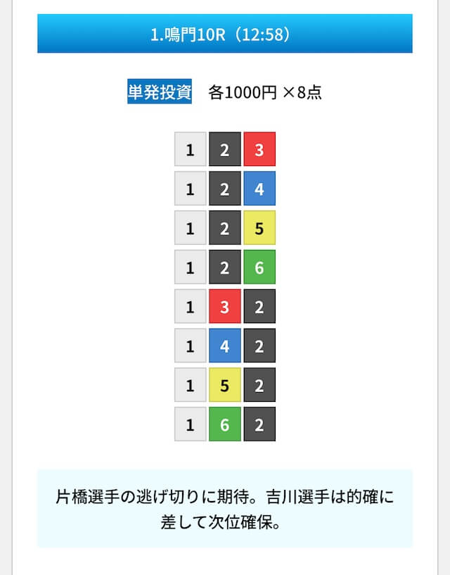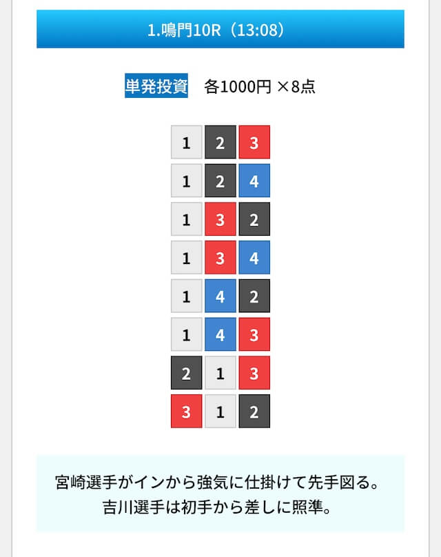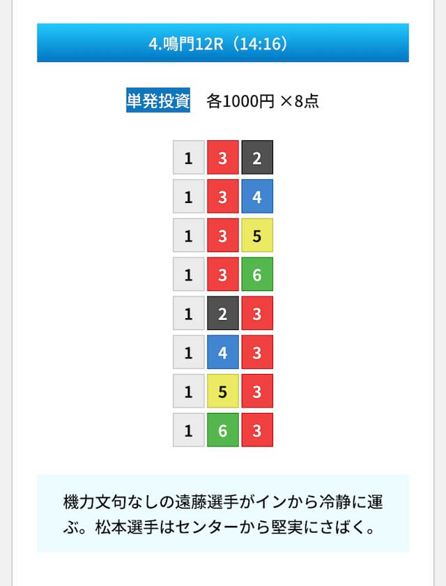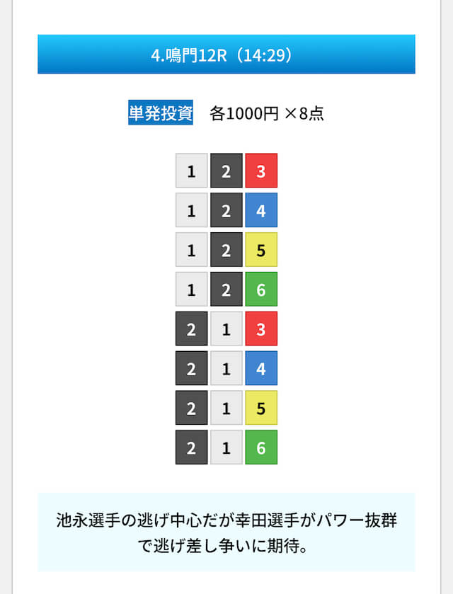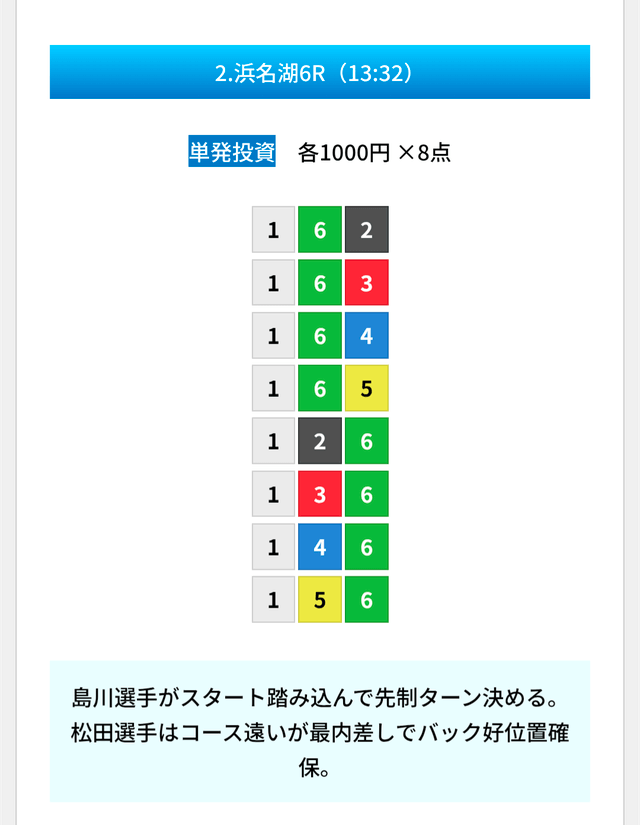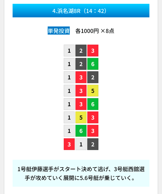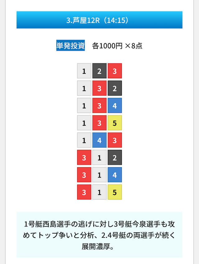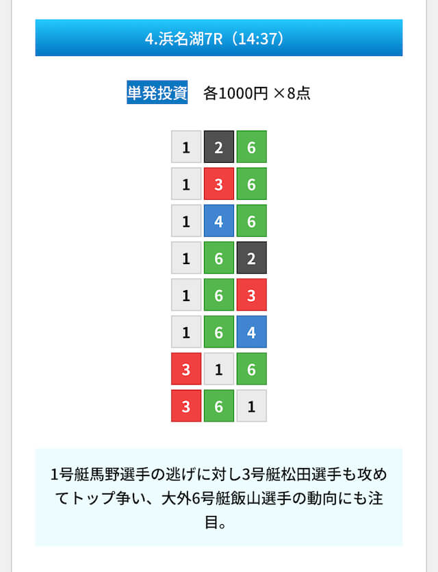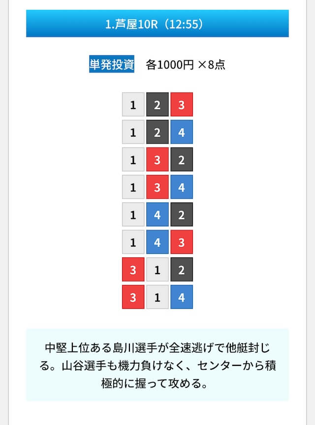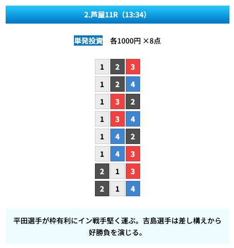 買い目は①④号艇を軸に置いて、②⑤号艇を絡めた組み合わせ。