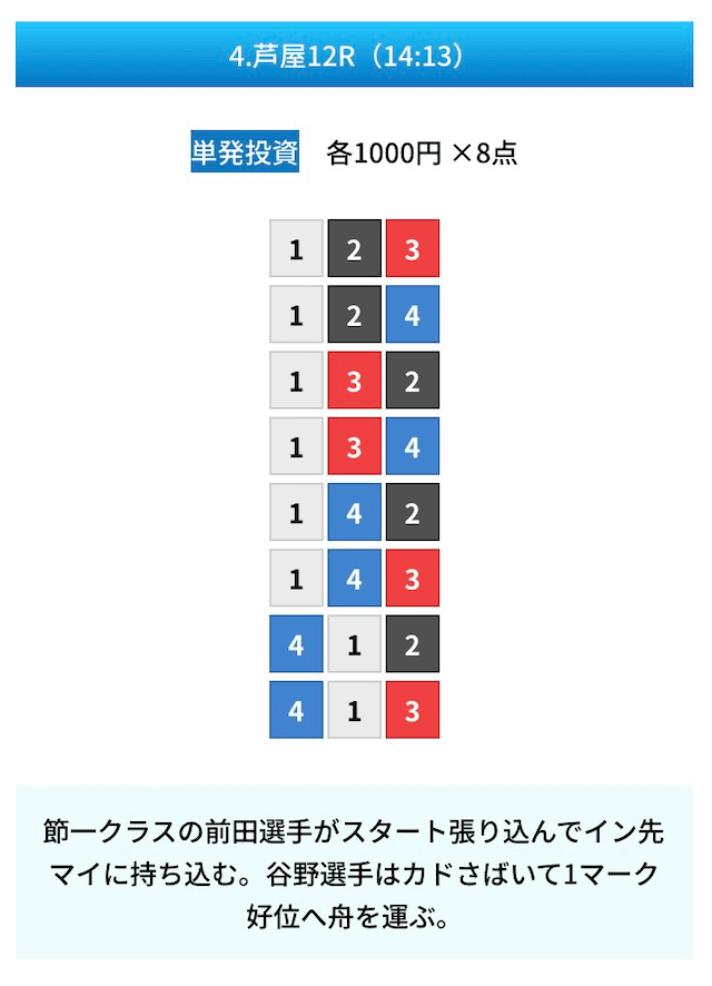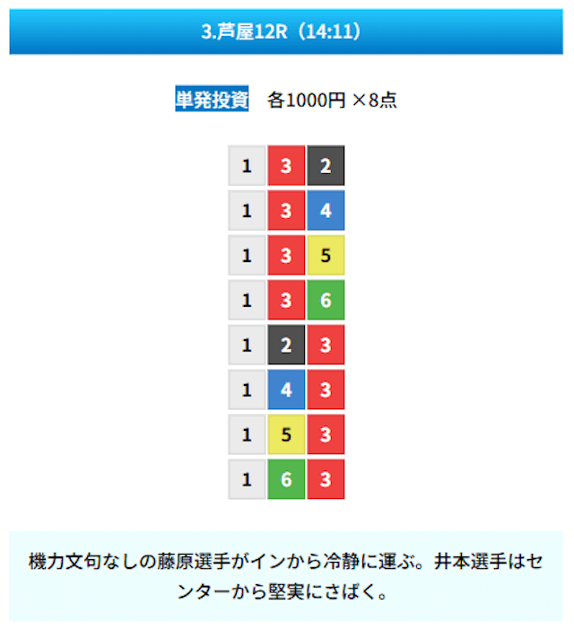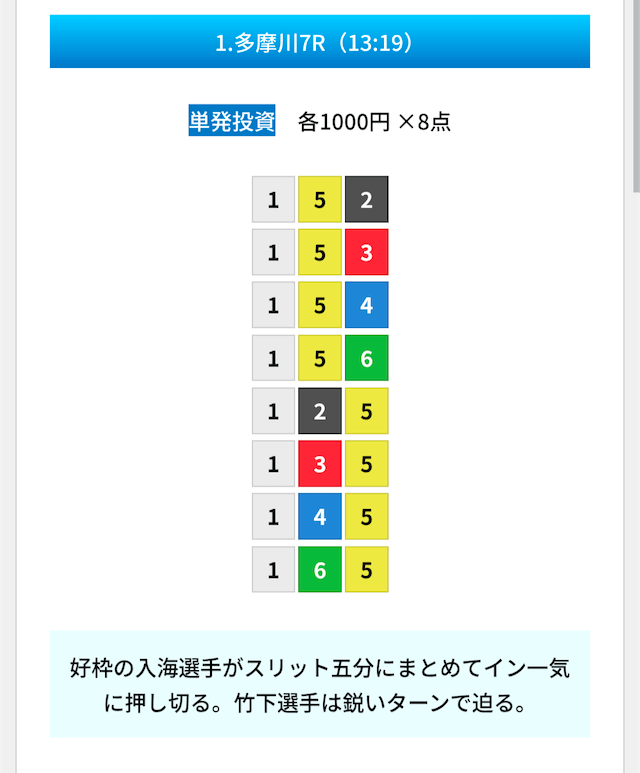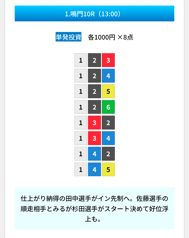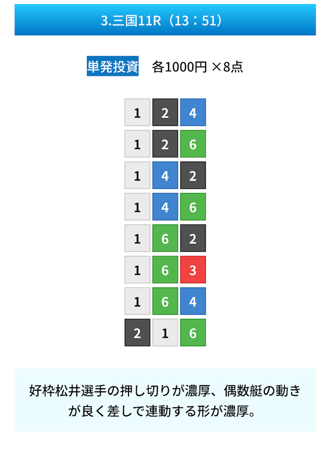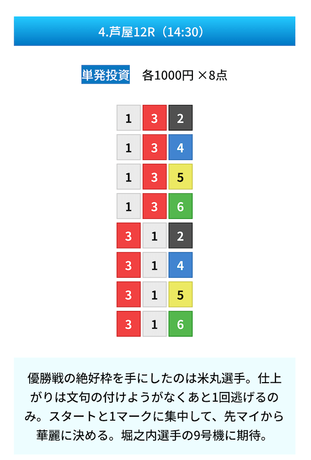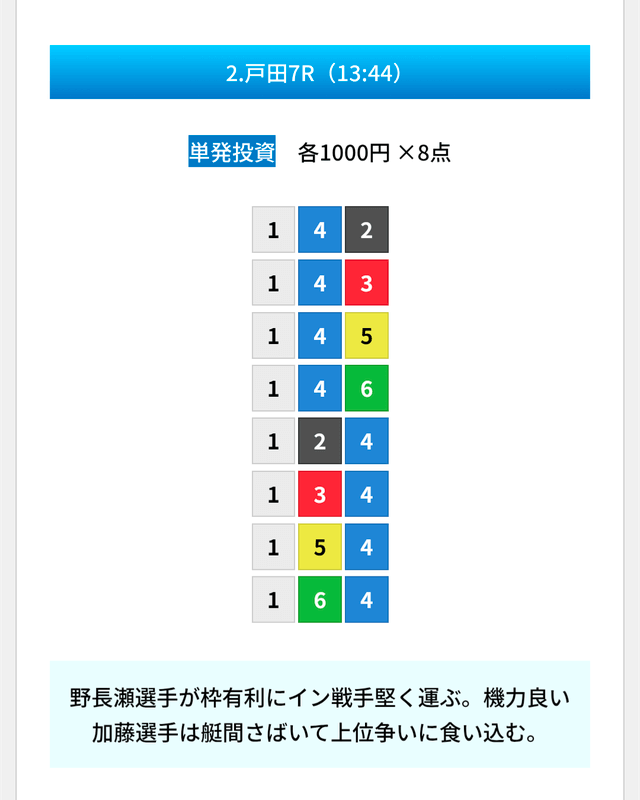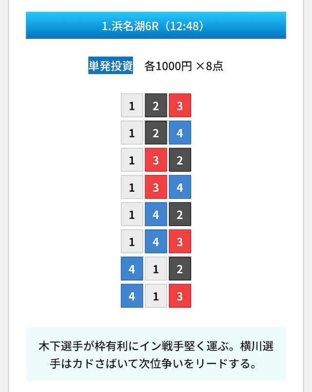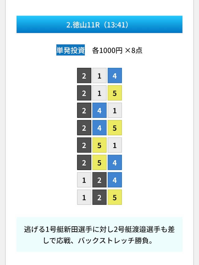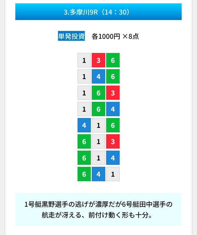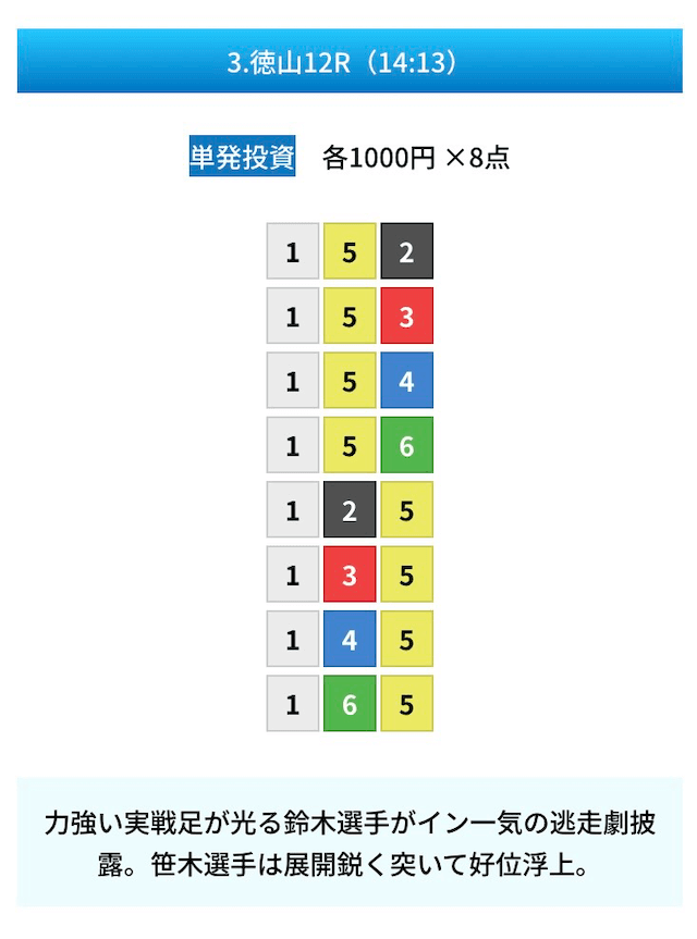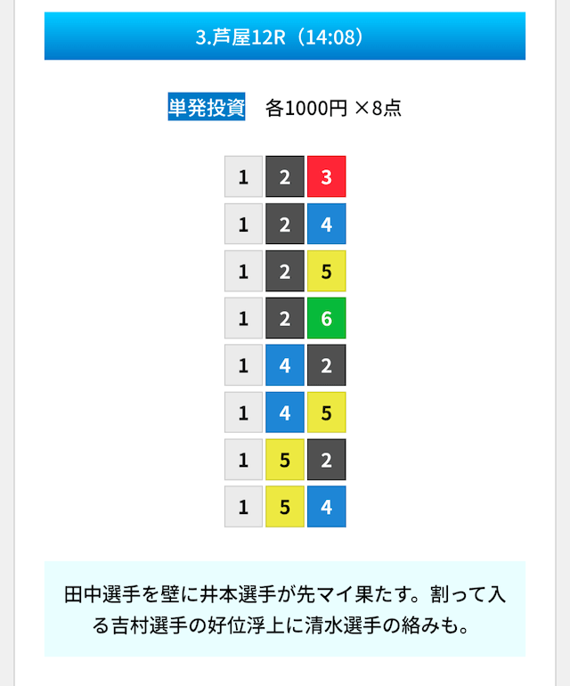 買い目は①④号艇を軸に置いて、②⑤号艇を絡めた組み合わせ。