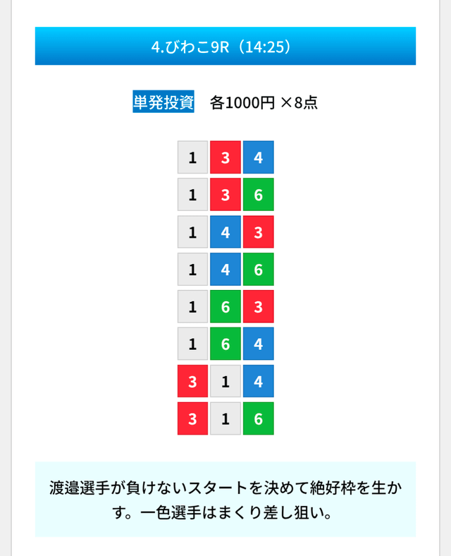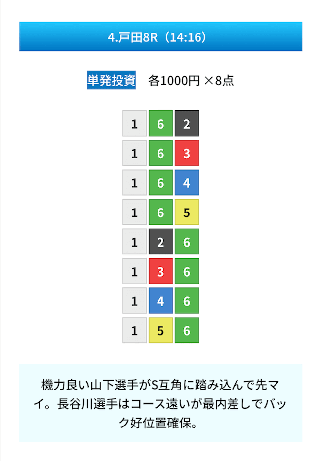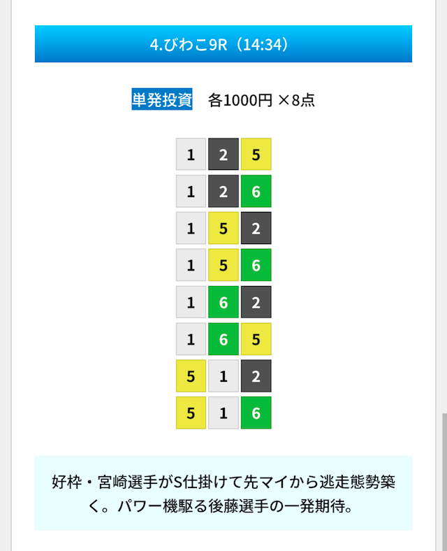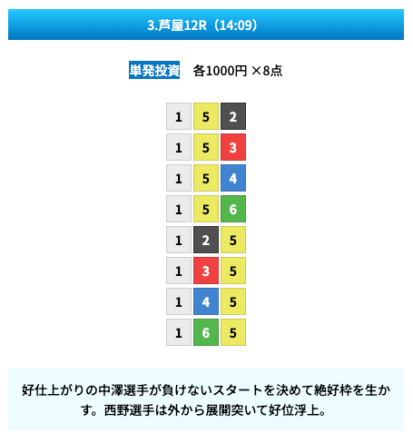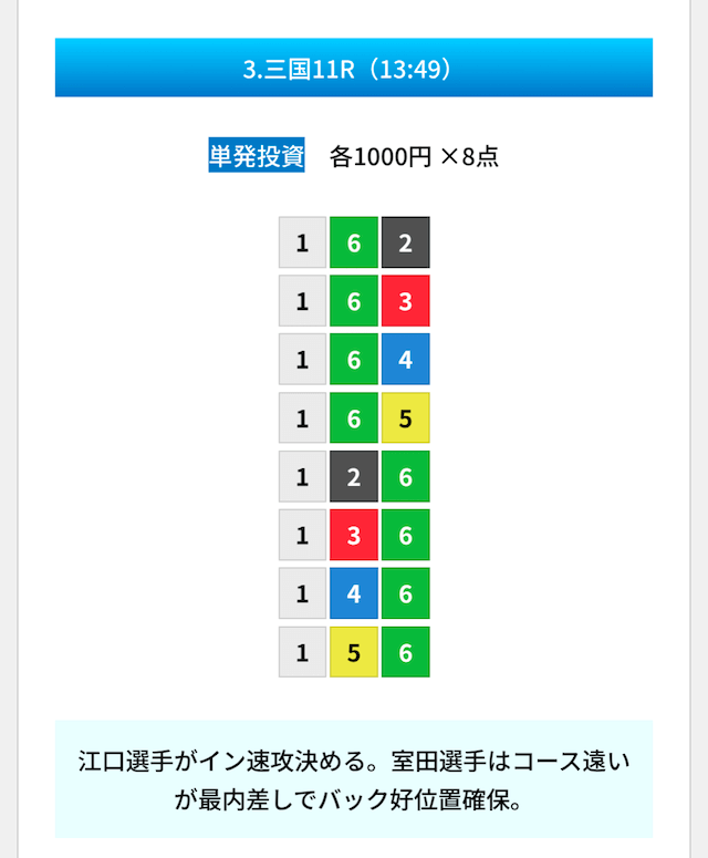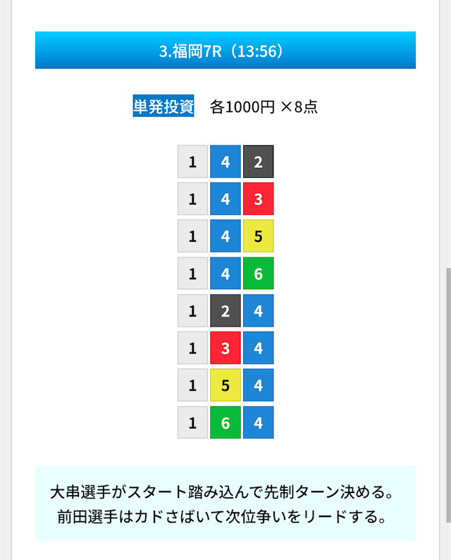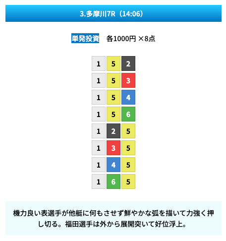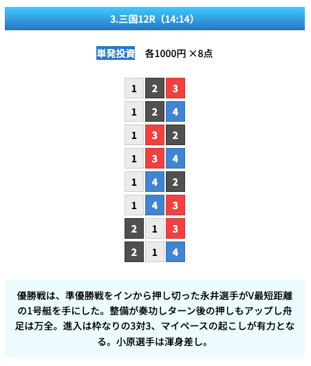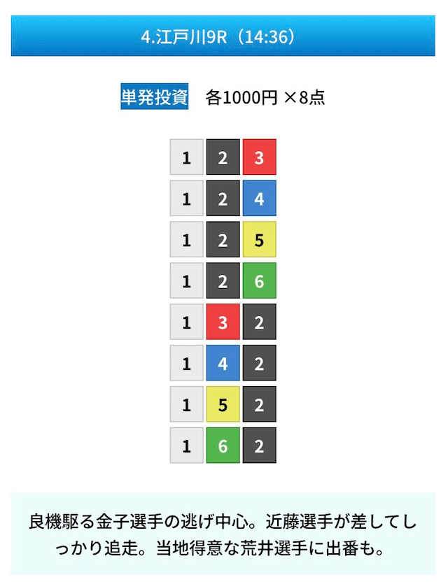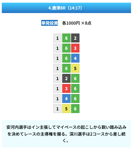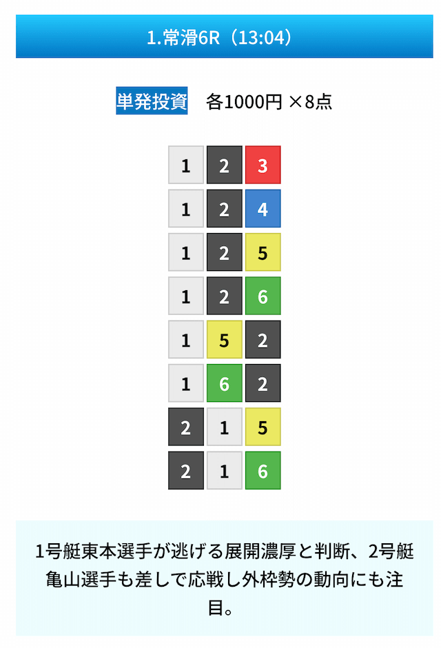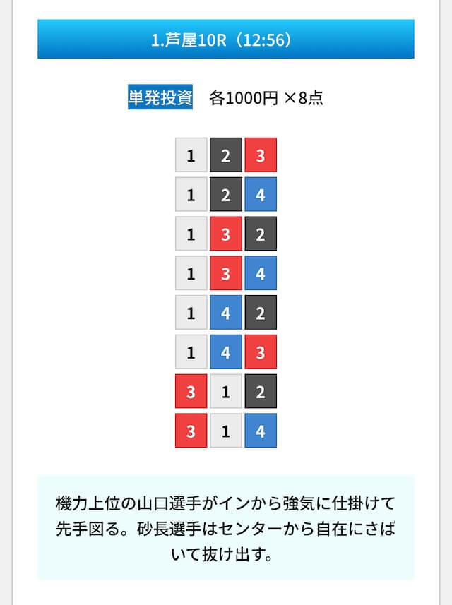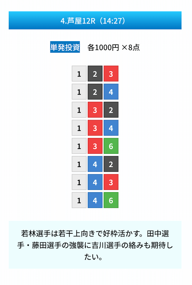 買い目は①④号艇を軸に置いて、②⑤号艇を絡めた組み合わせ。