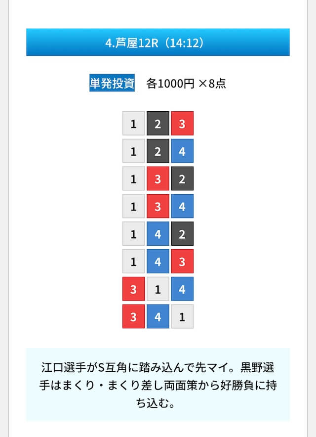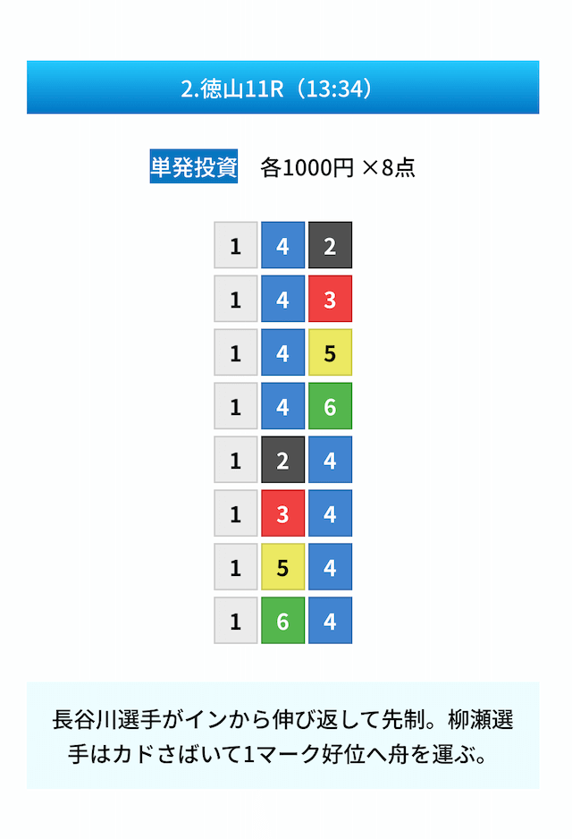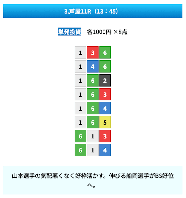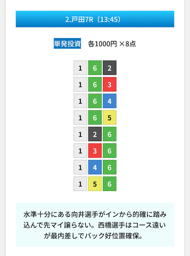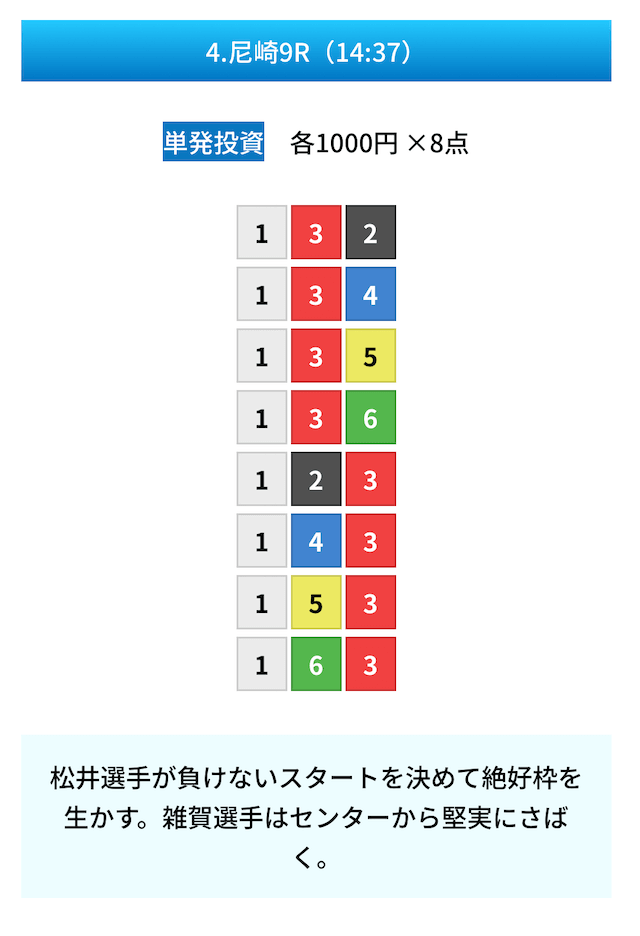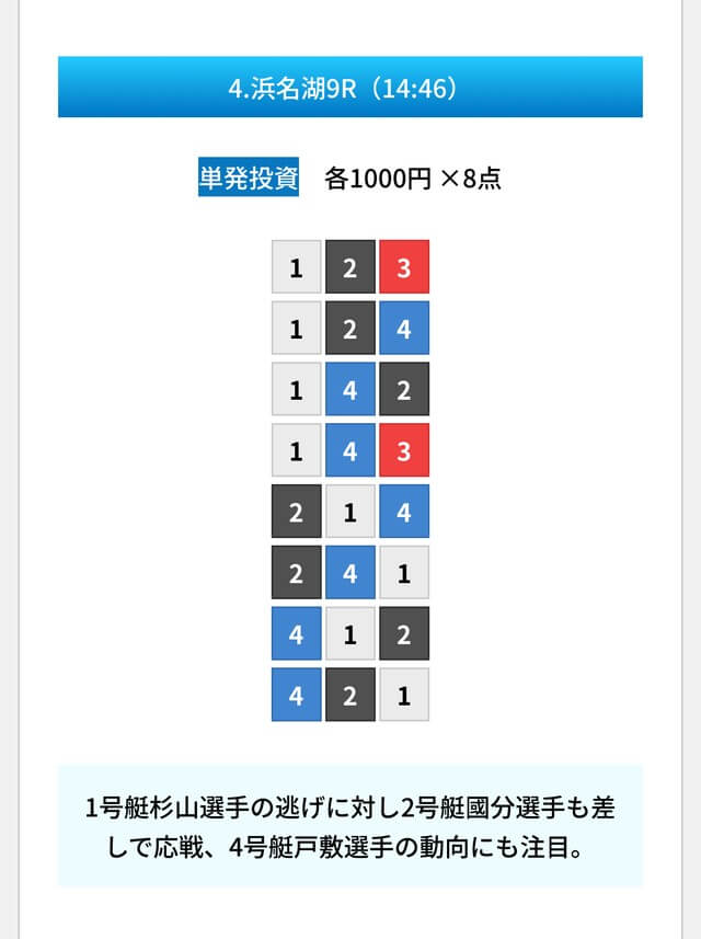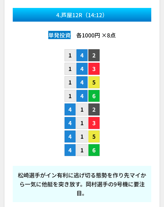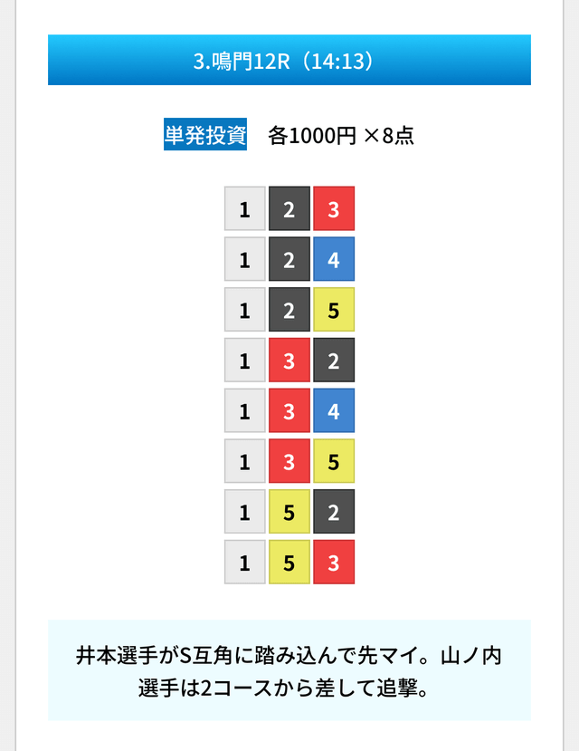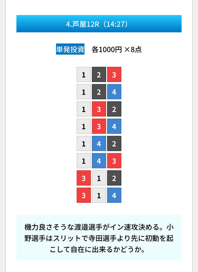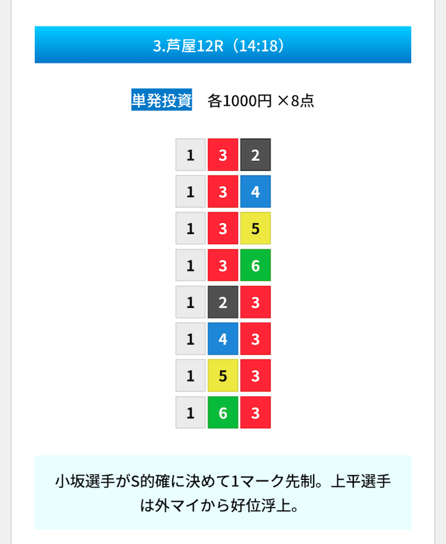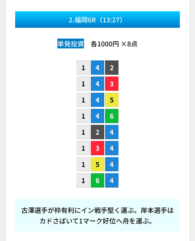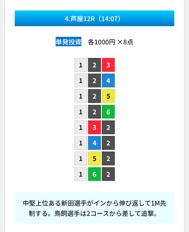 買い目は①④号艇を軸に置いて、②⑤号艇を絡めた組み合わせ。