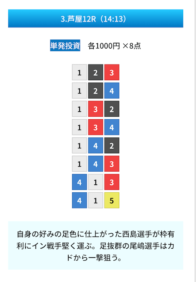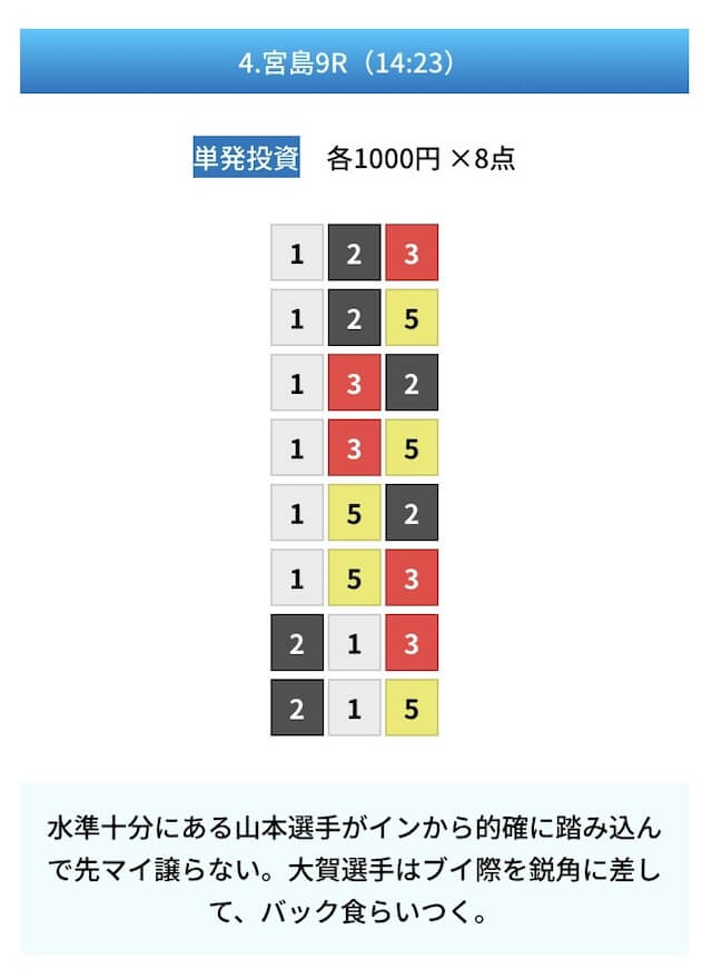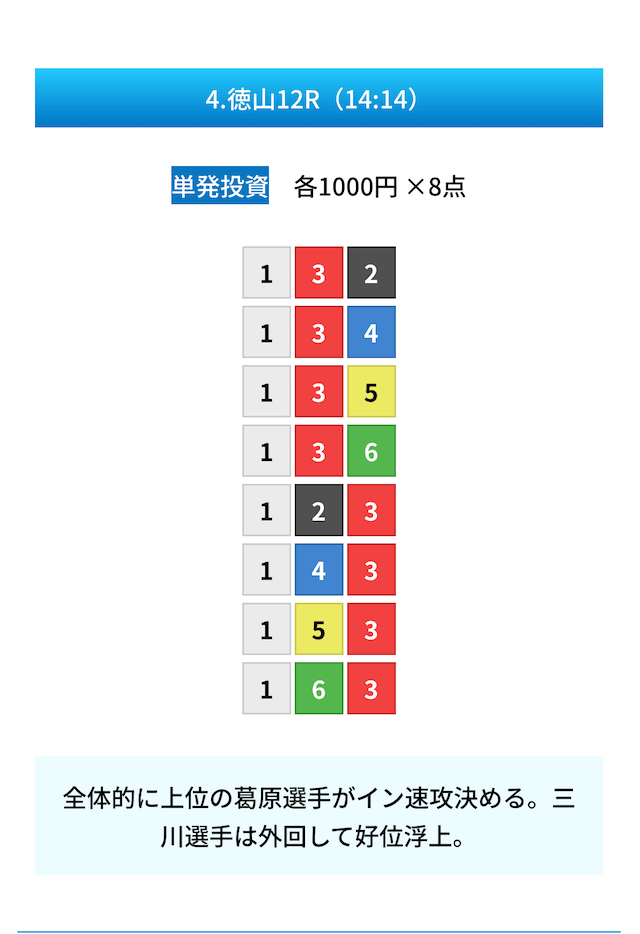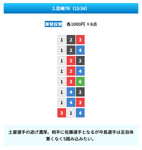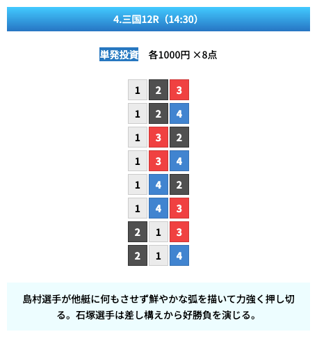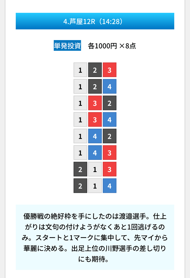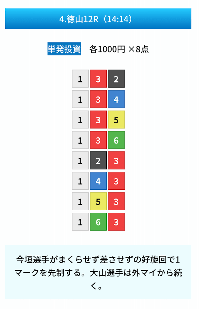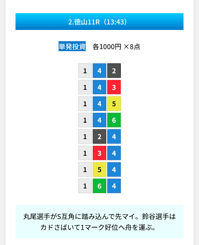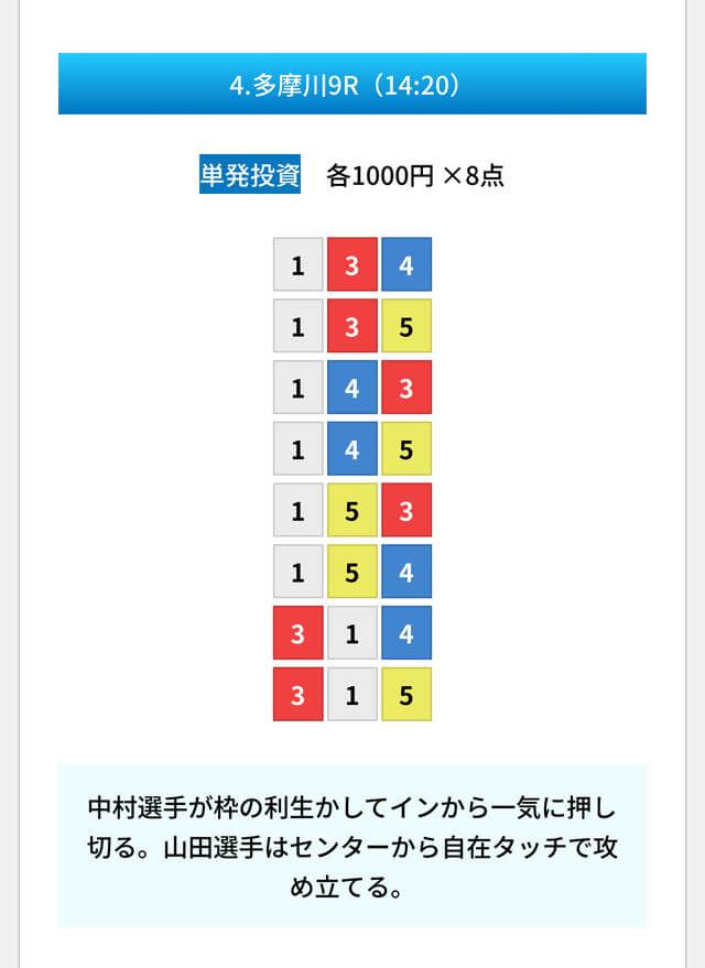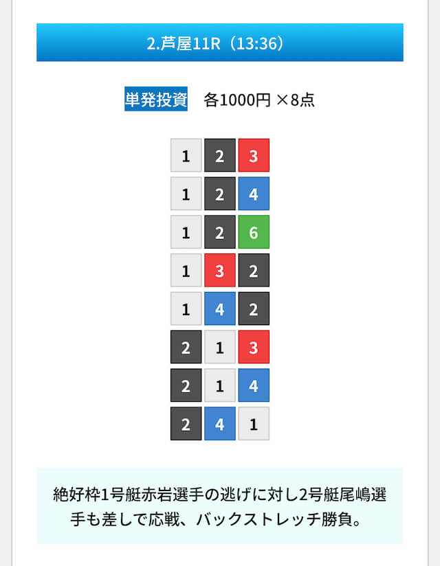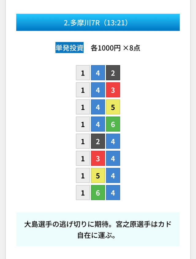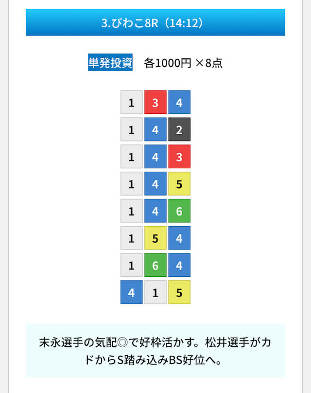 買い目は①④号艇を軸に置いて、②⑤号艇を絡めた組み合わせ。