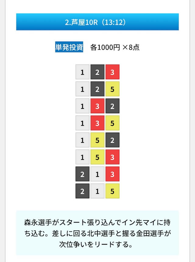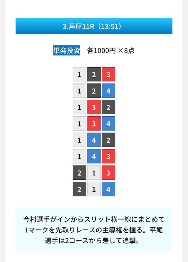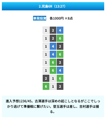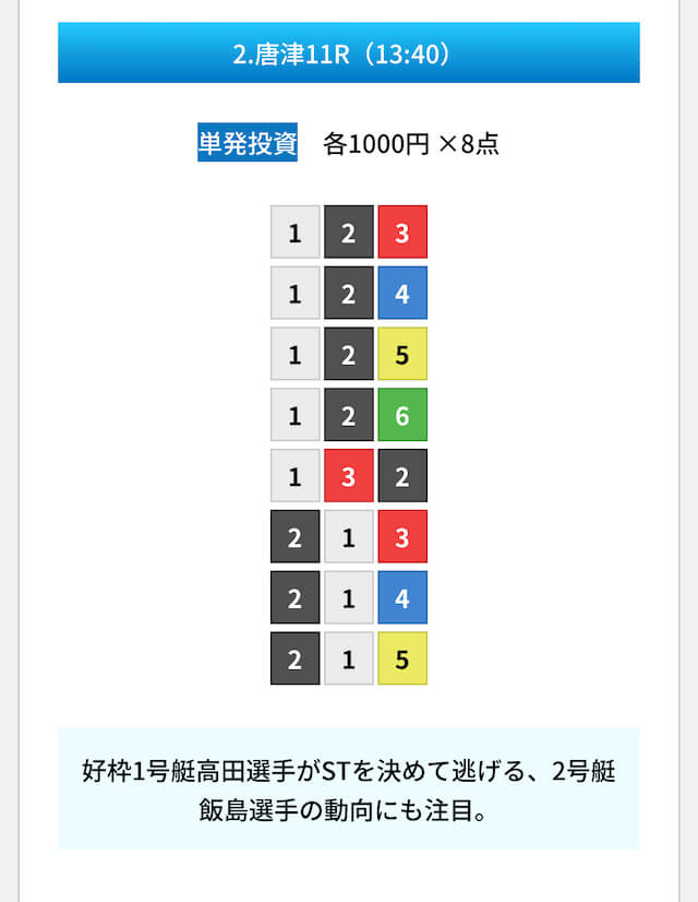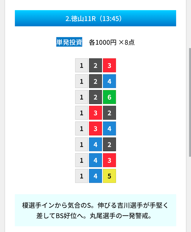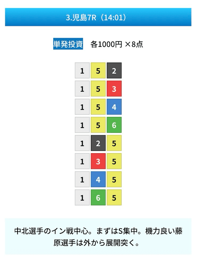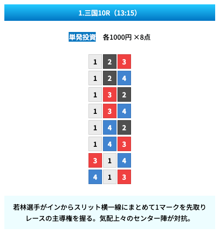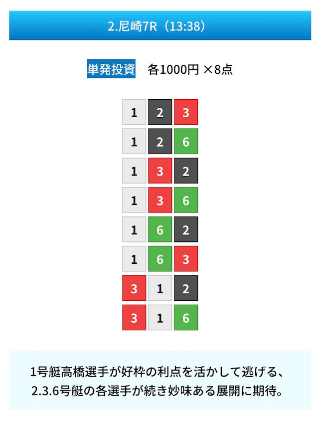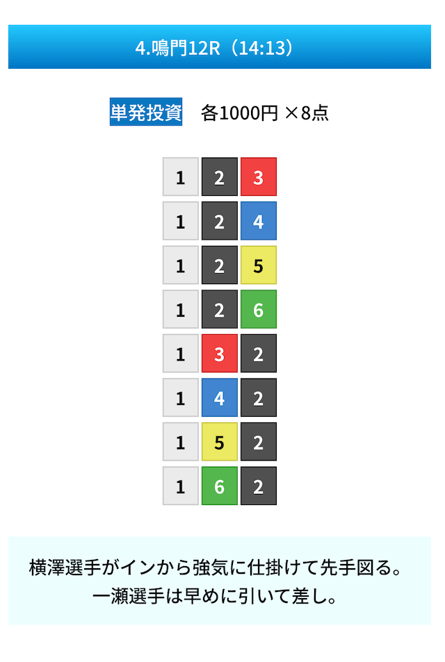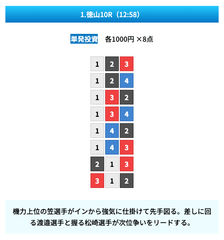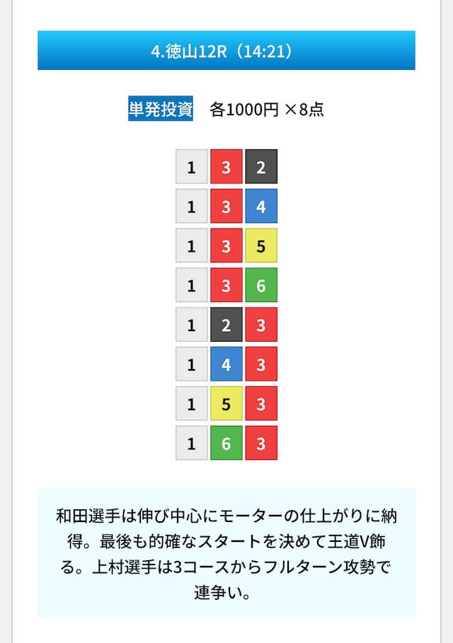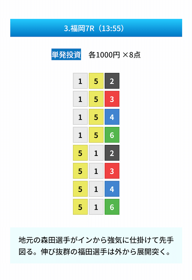 買い目は①④号艇を軸に置いて、②⑤号艇を絡めた組み合わせ。
