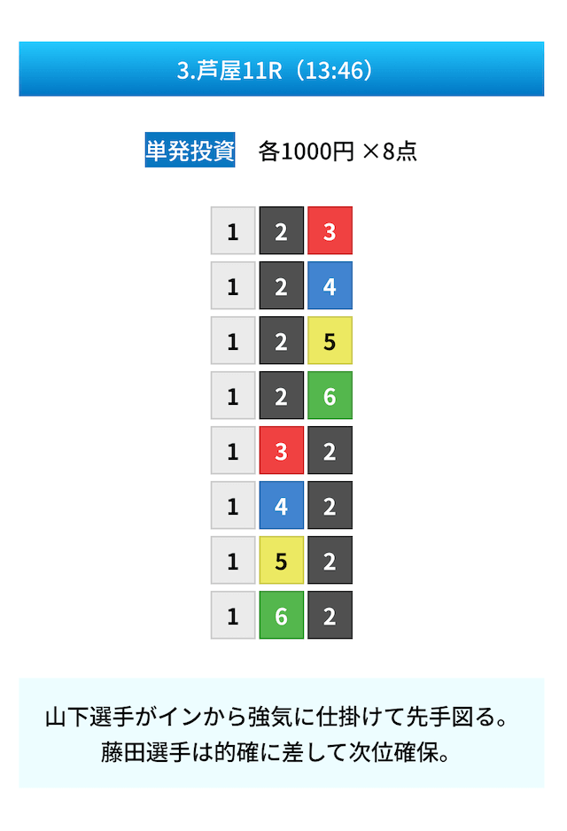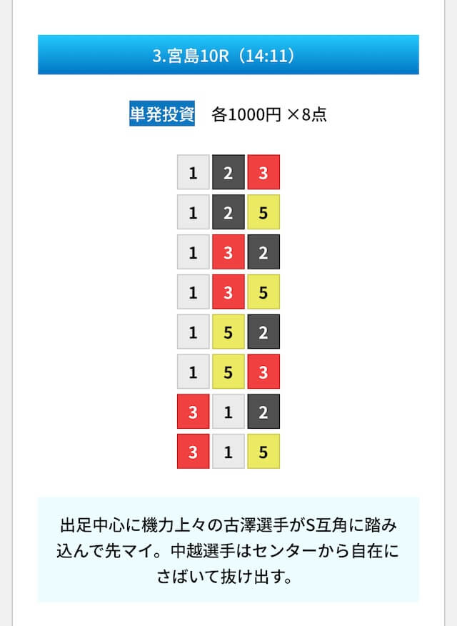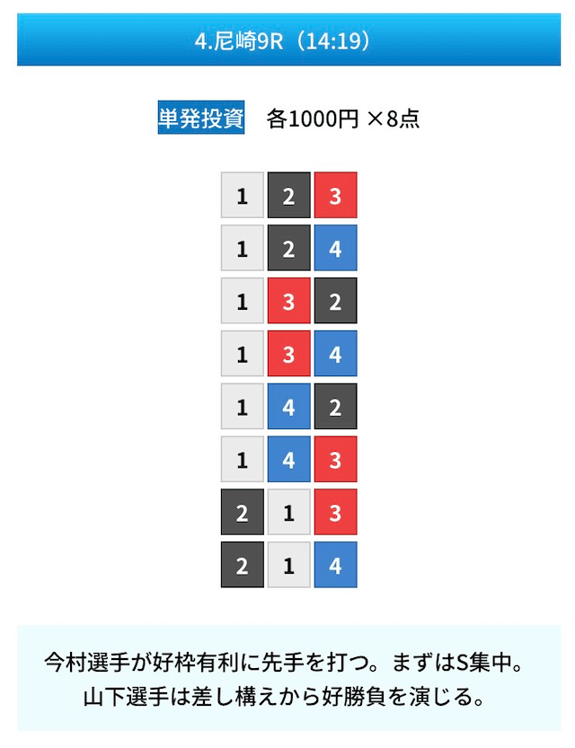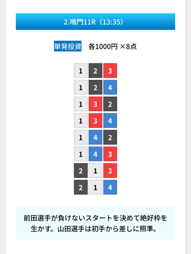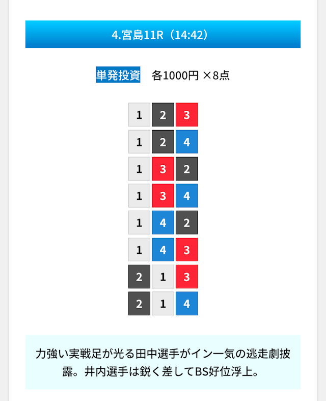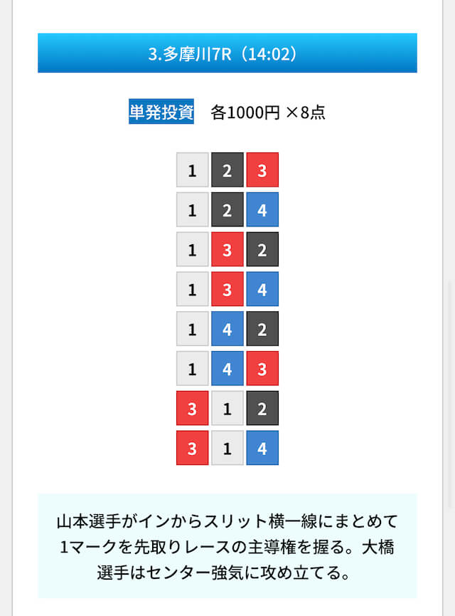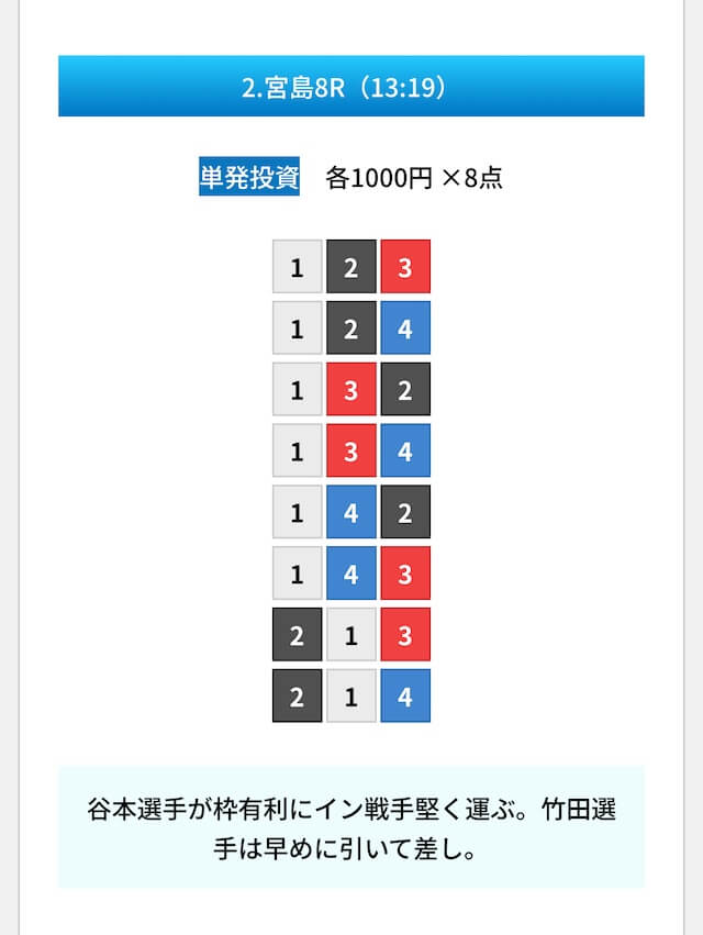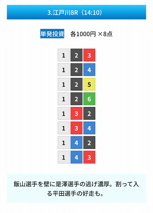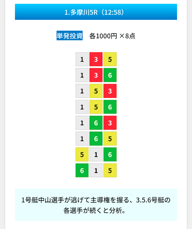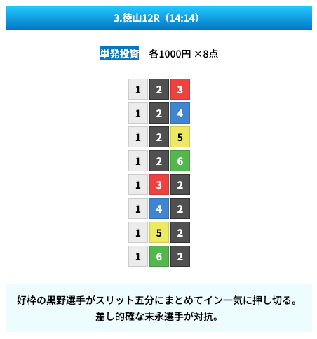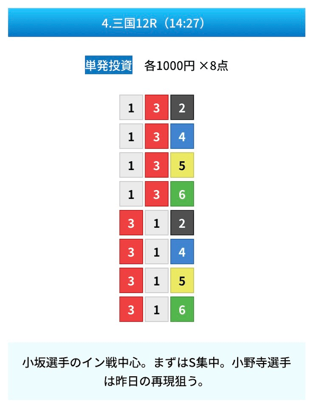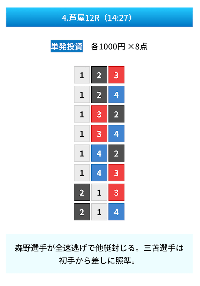 買い目は①④号艇を軸に置いて、②⑤号艇を絡めた組み合わせ。