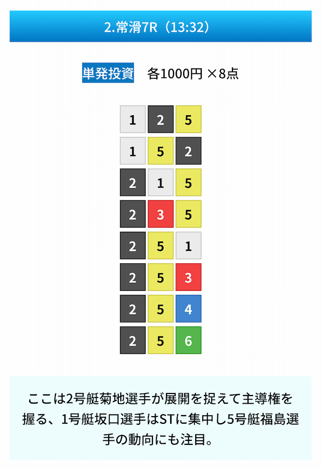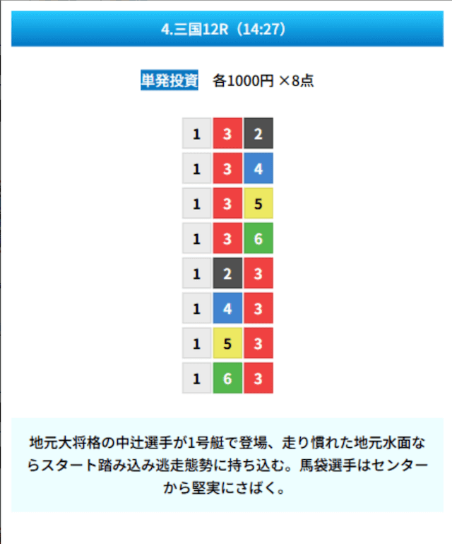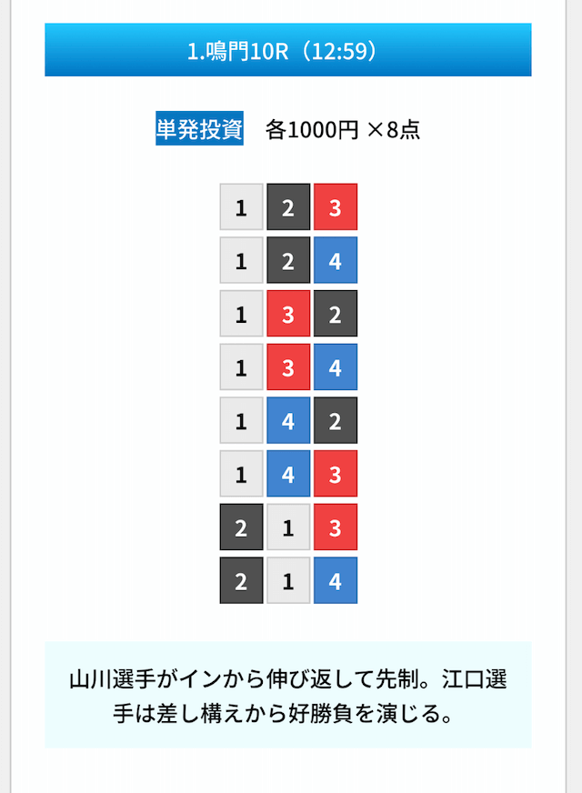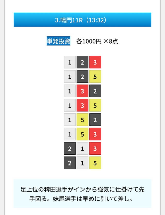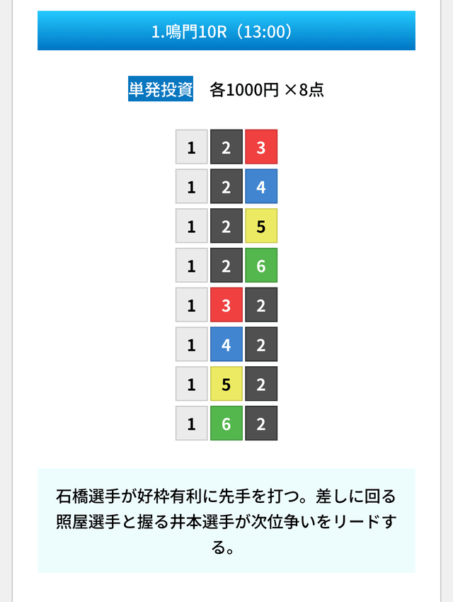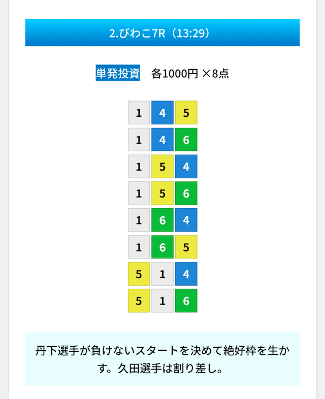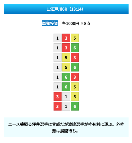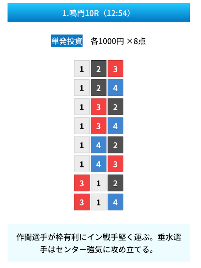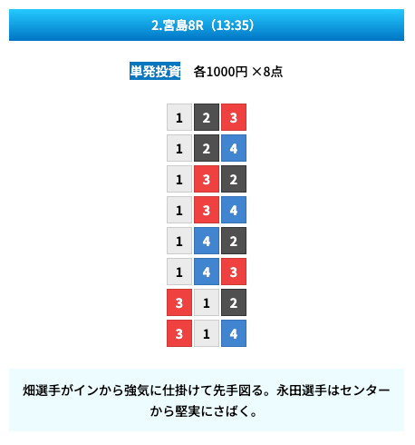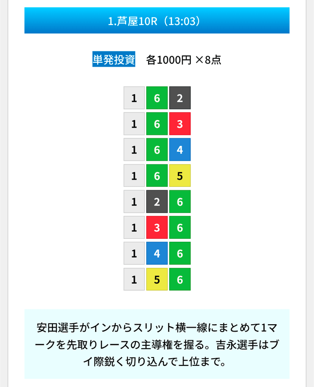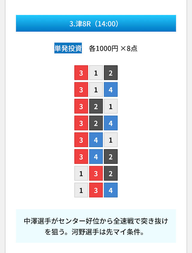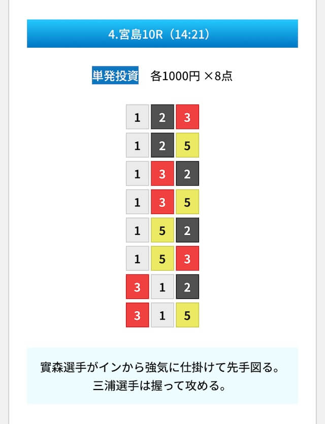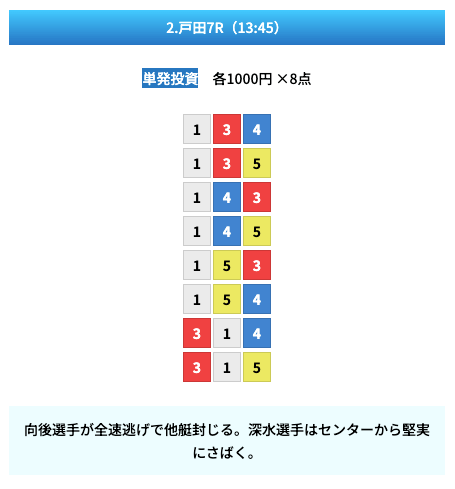 買い目は①④号艇を軸に置いて、②⑤号艇を絡めた組み合わせ。