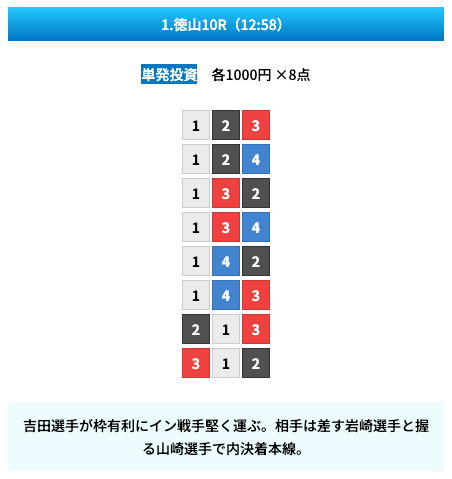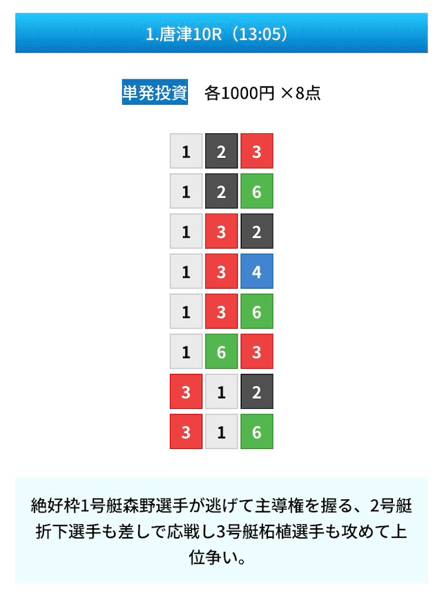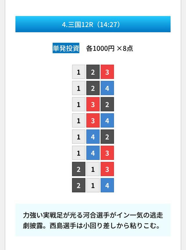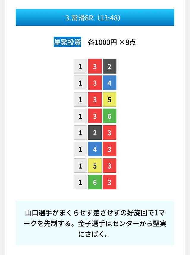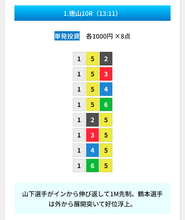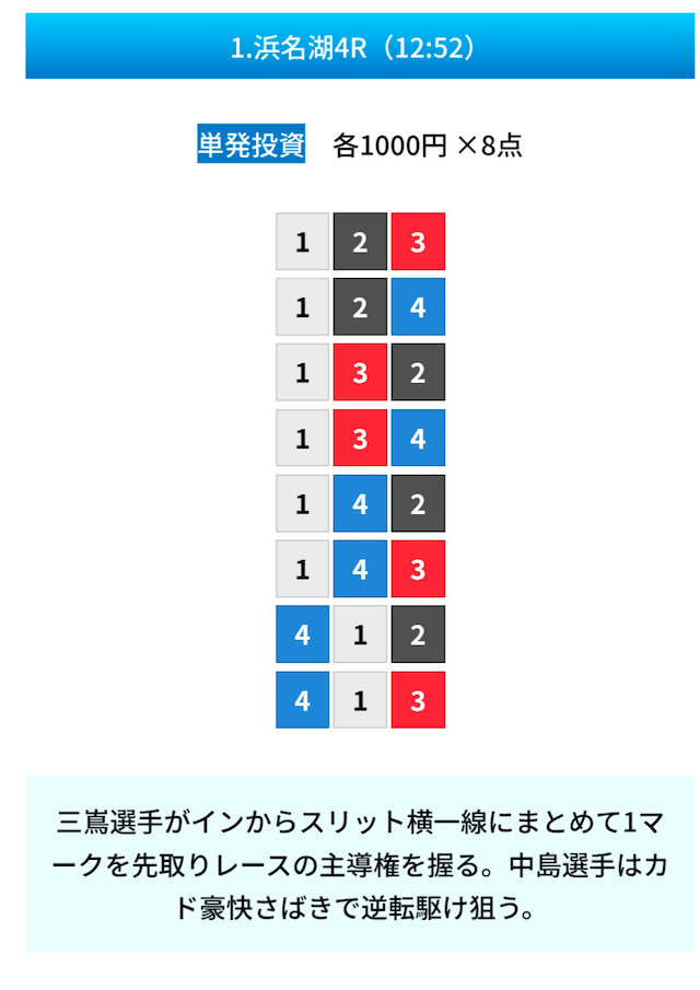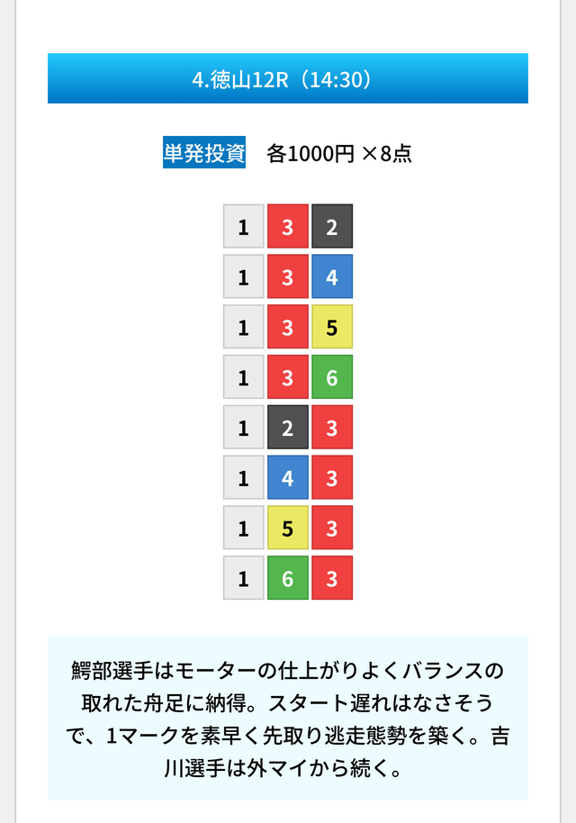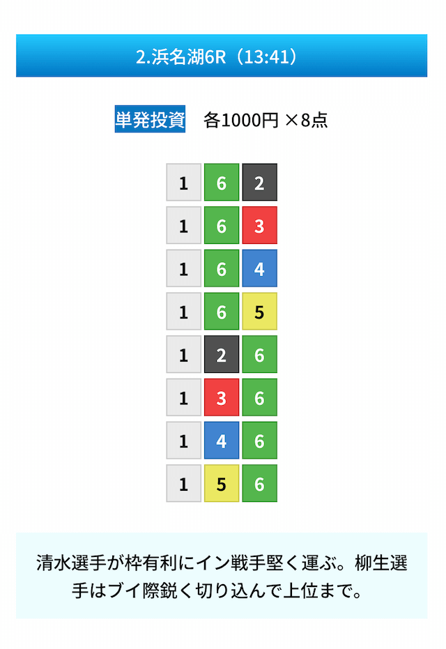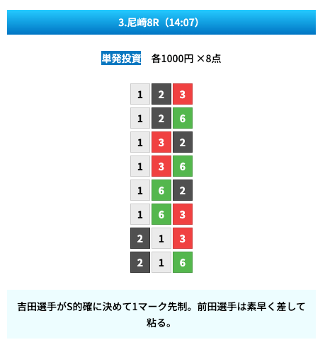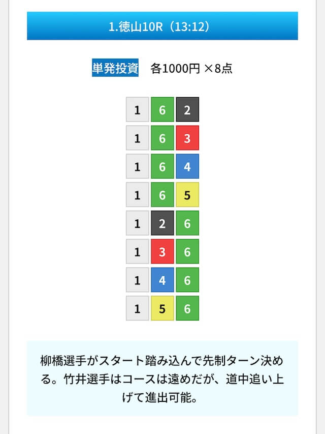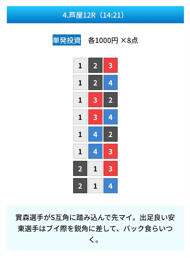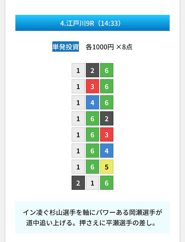 買い目は①④号艇を軸に置いて、②⑤号艇を絡めた組み合わせ。