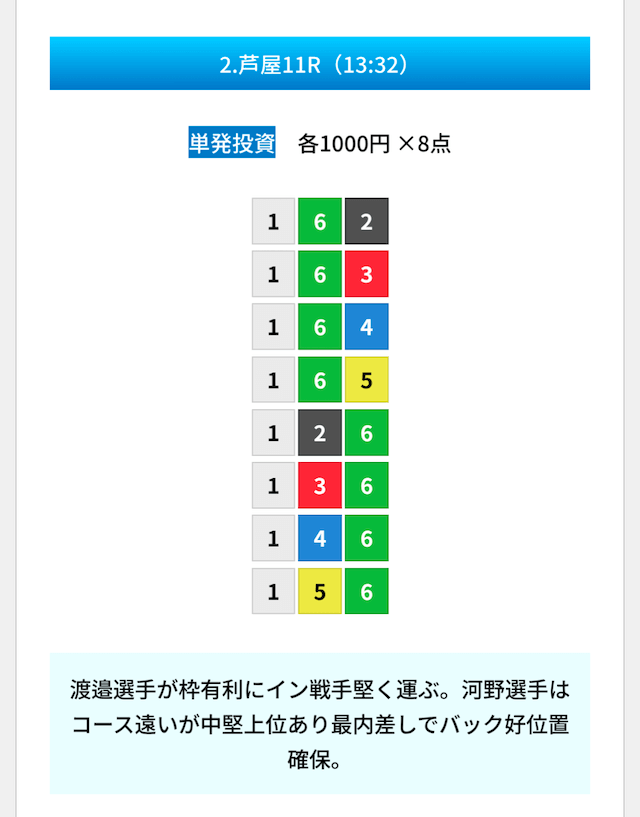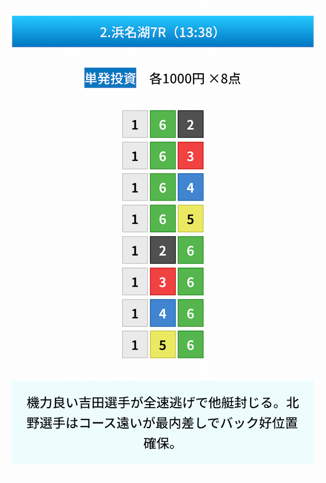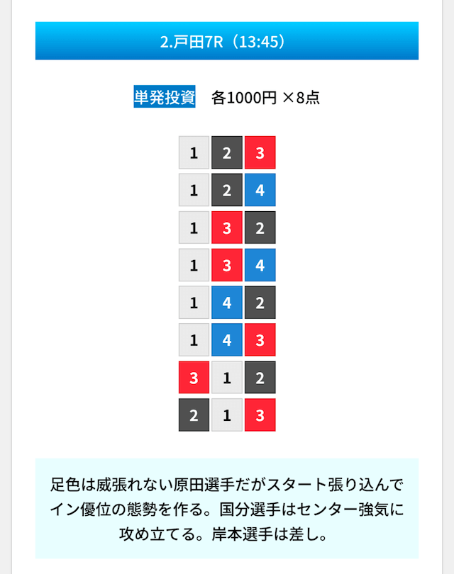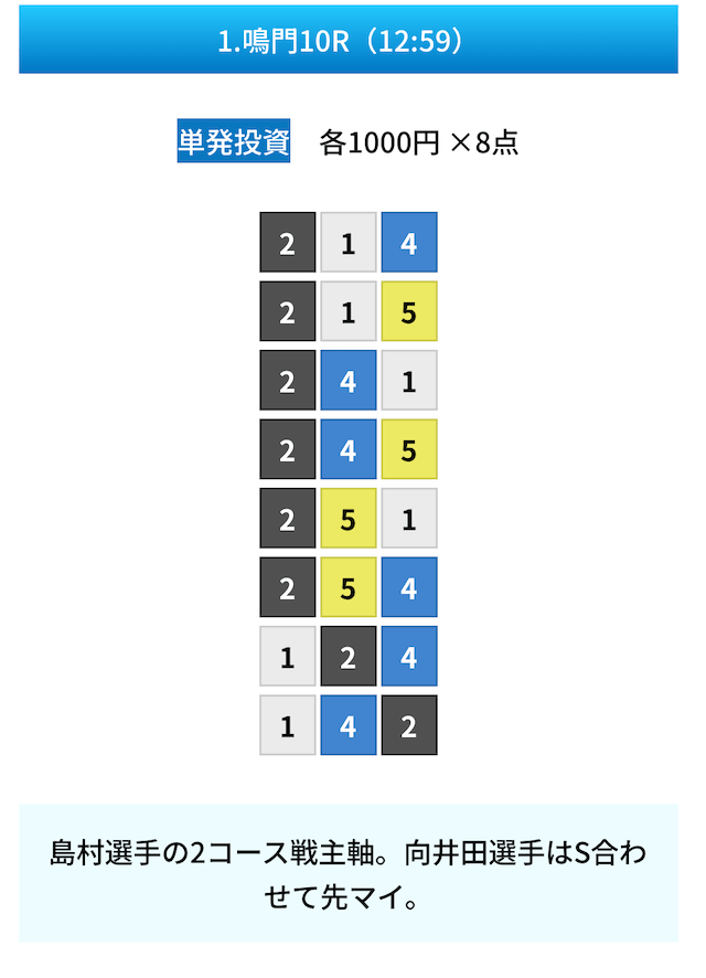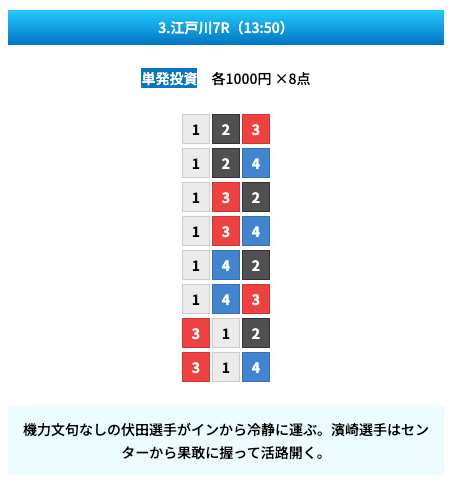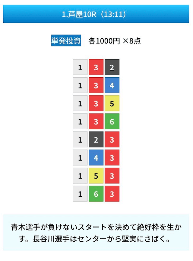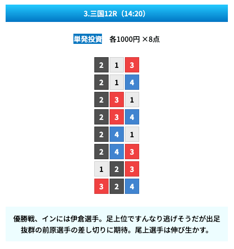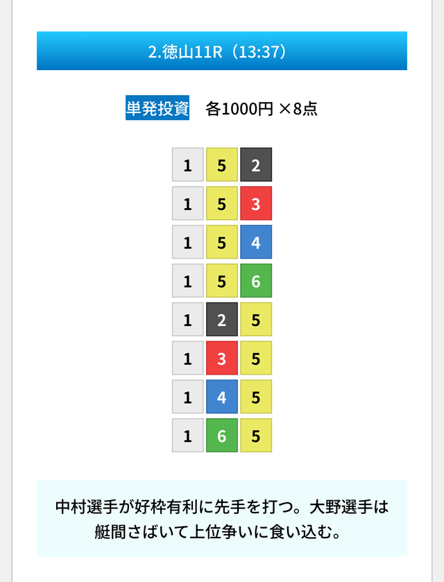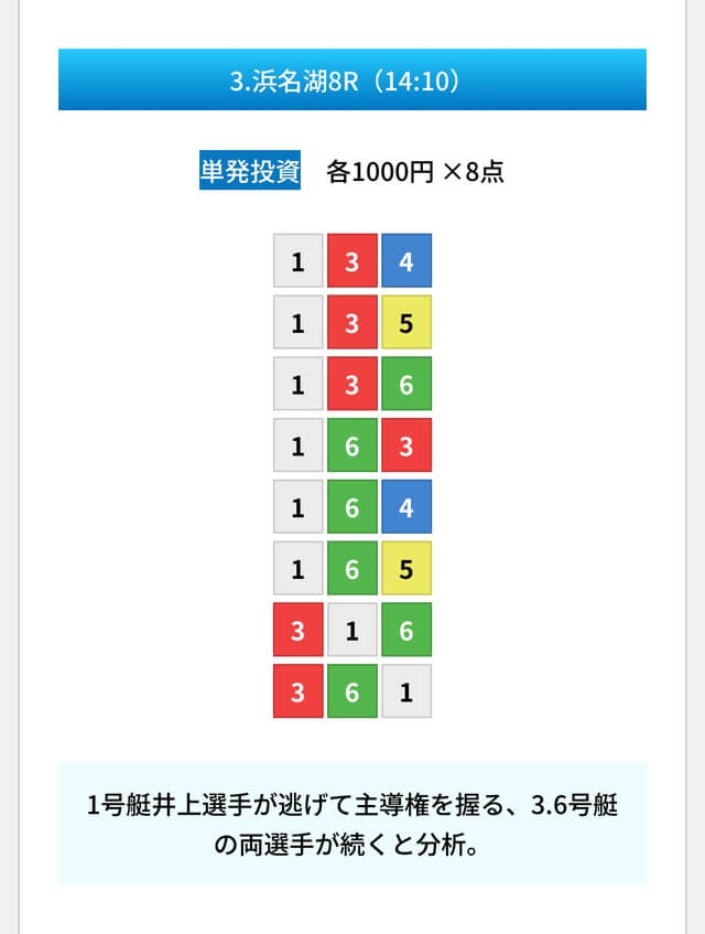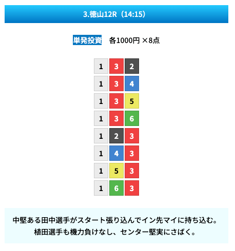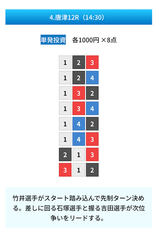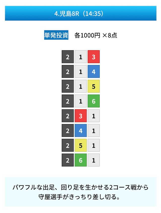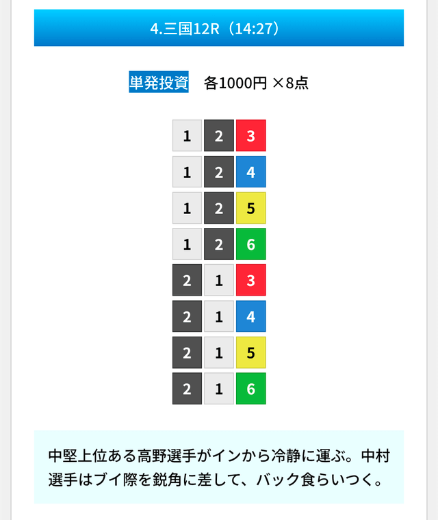 買い目は①④号艇を軸に置いて、②⑤号艇を絡めた組み合わせ。