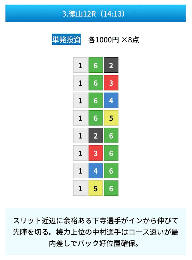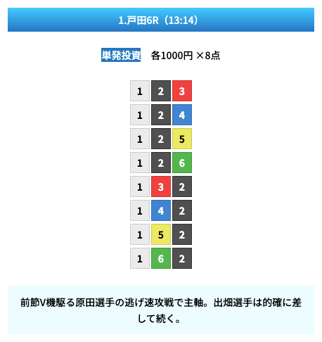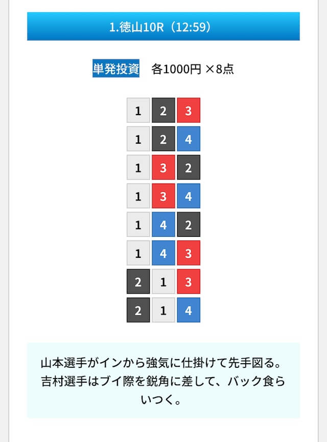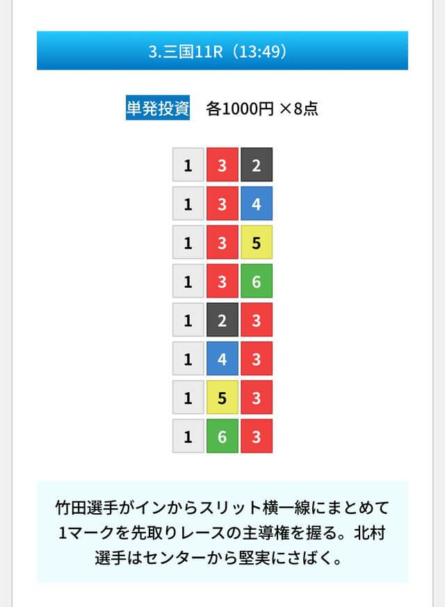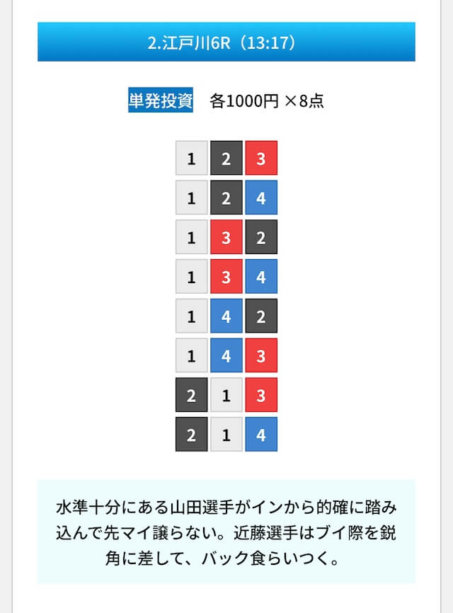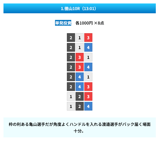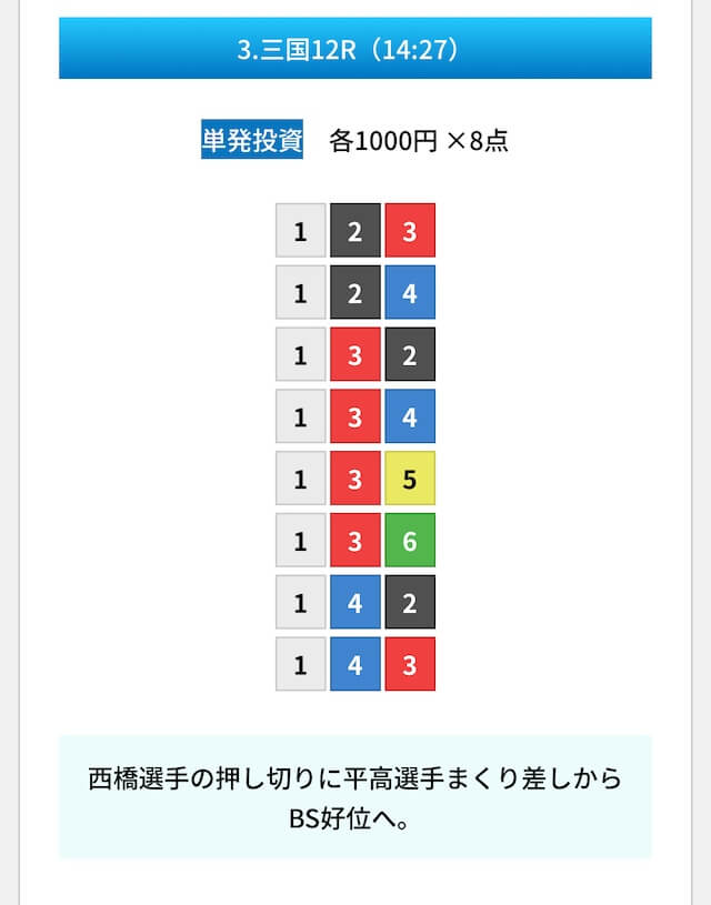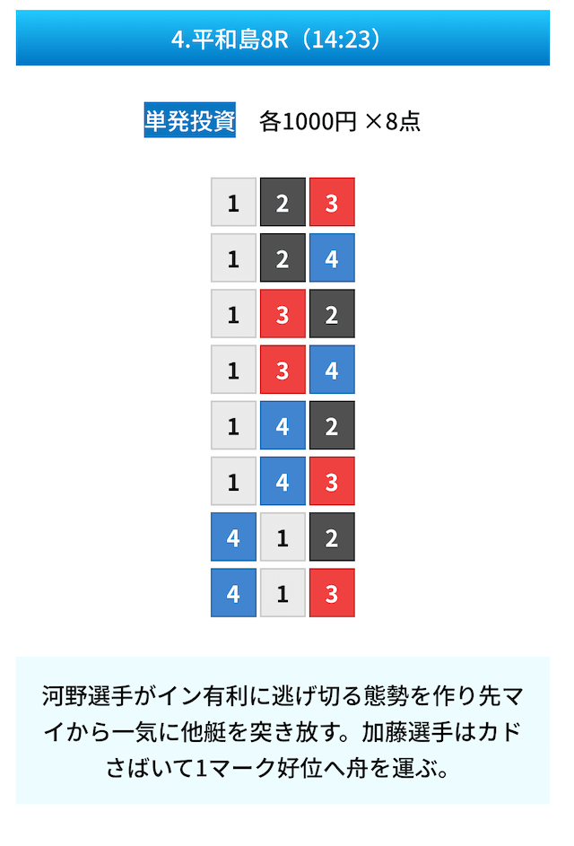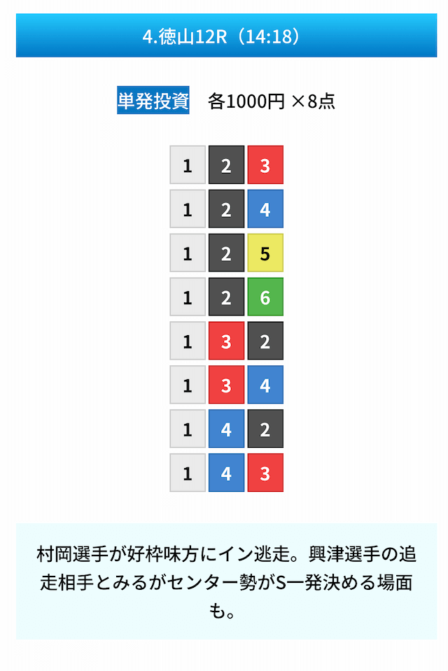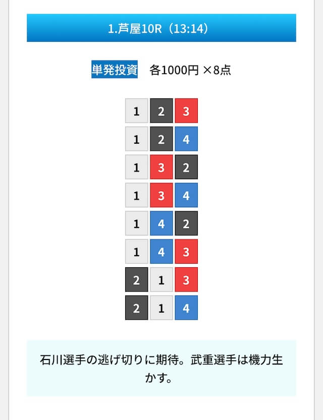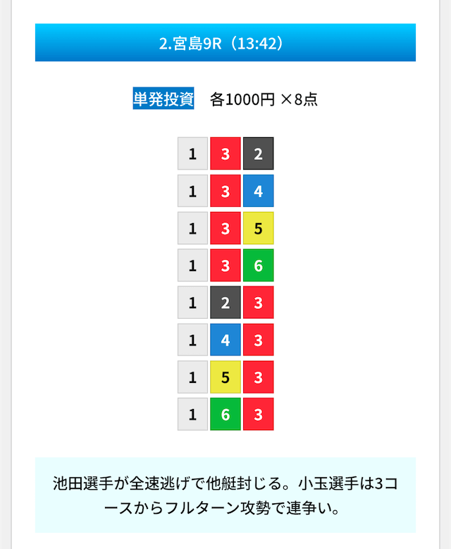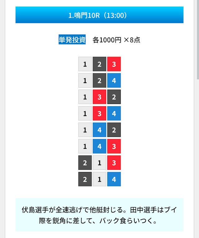 買い目は①④号艇を軸に置いて、②⑤号艇を絡めた組み合わせ。