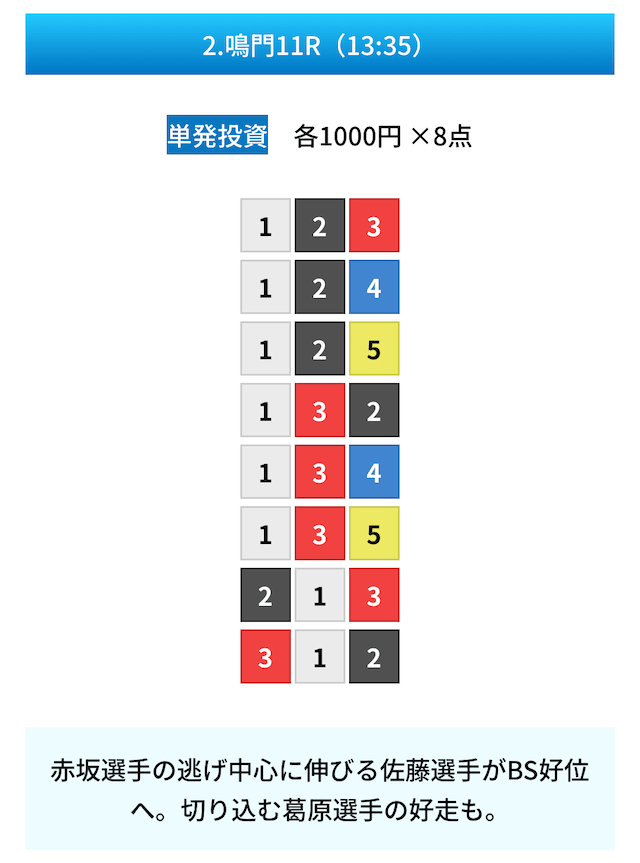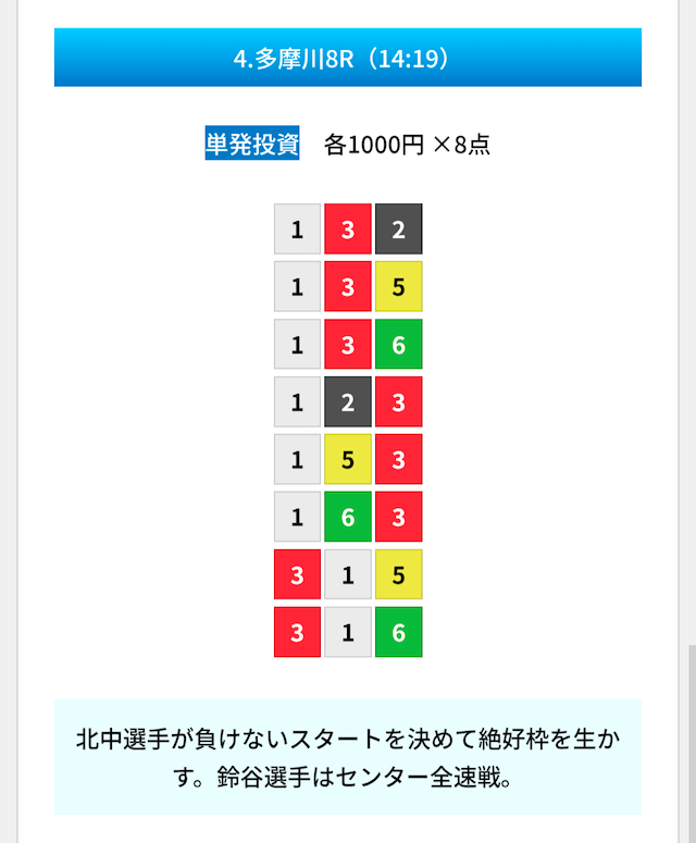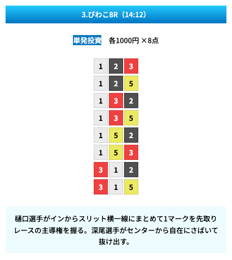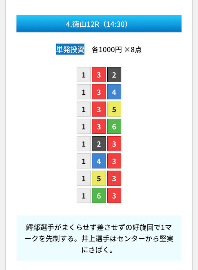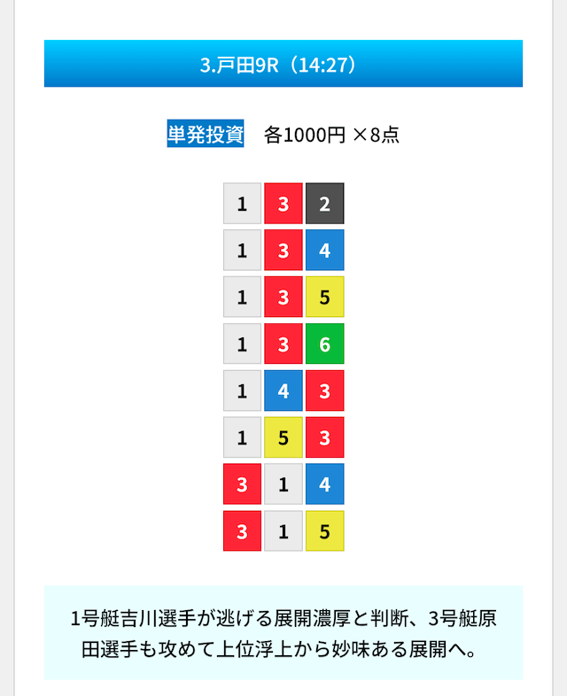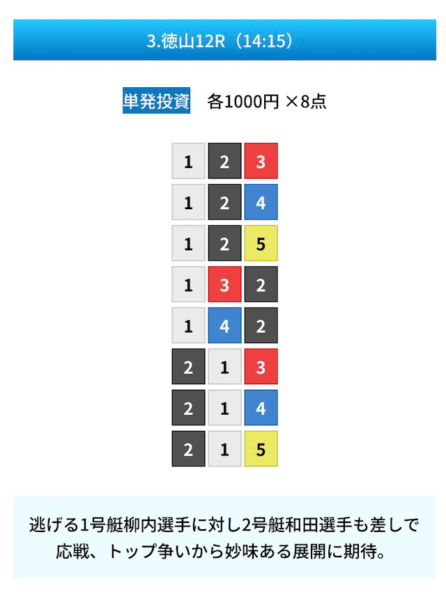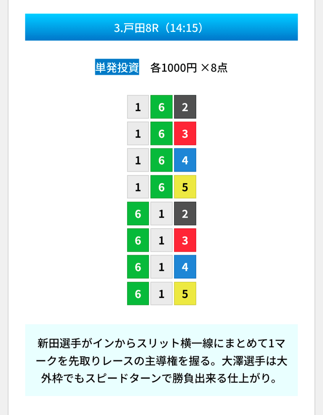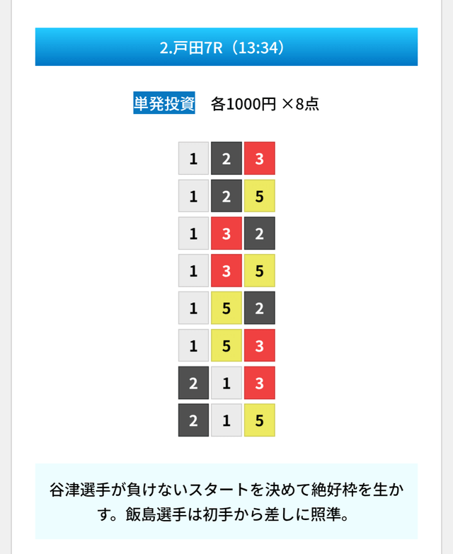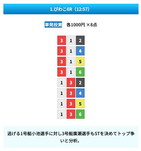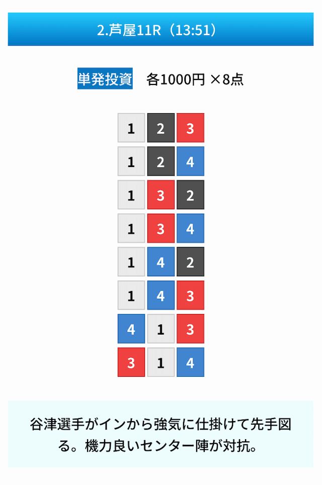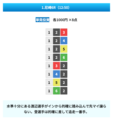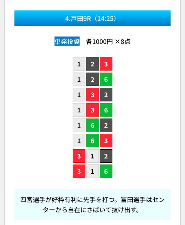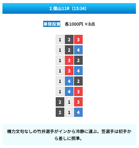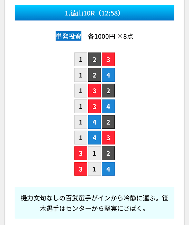買い目は①④号艇を軸に置いて、②⑤号艇を絡めた組み合わせ。