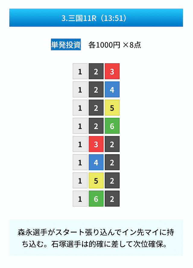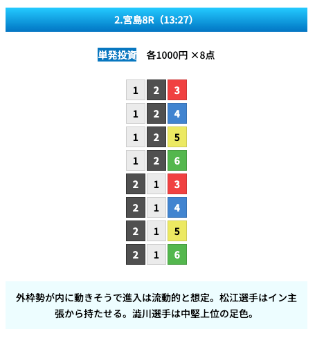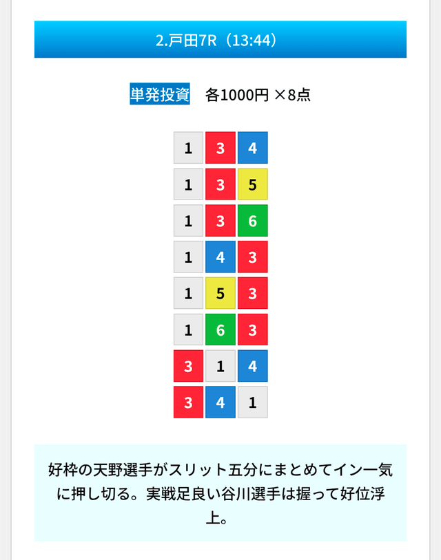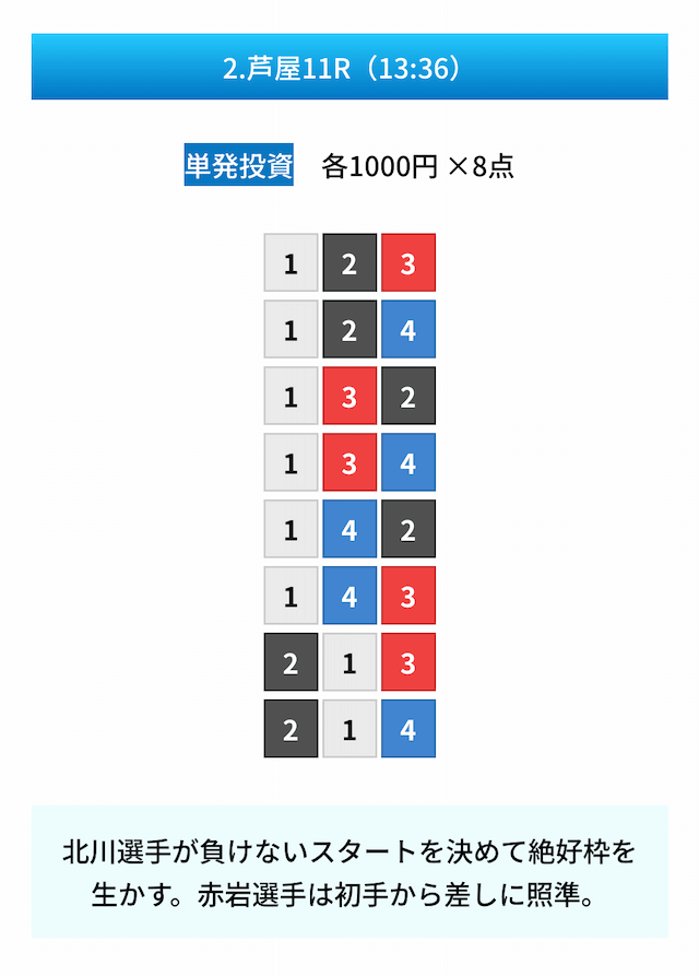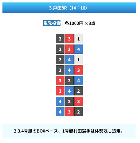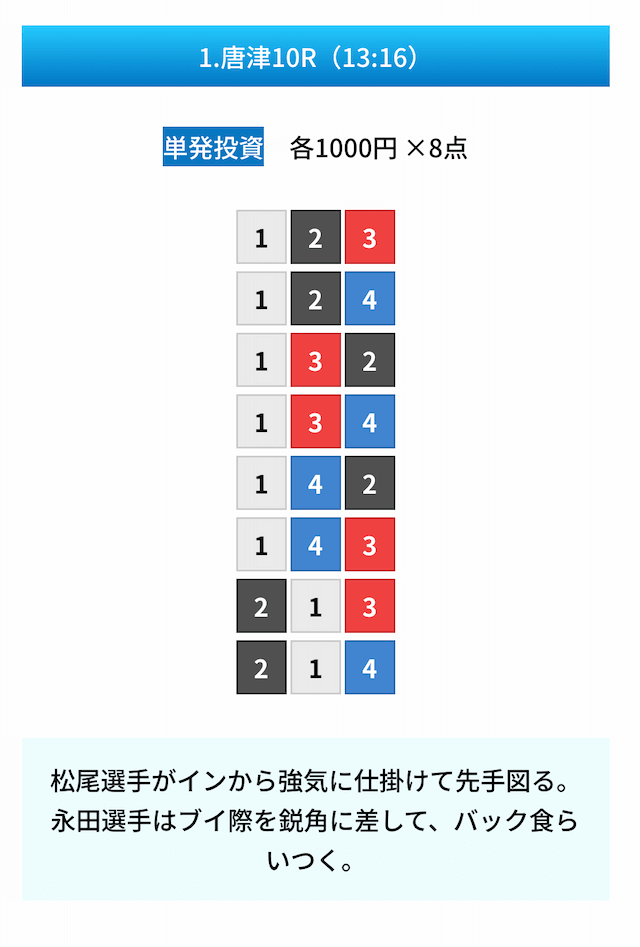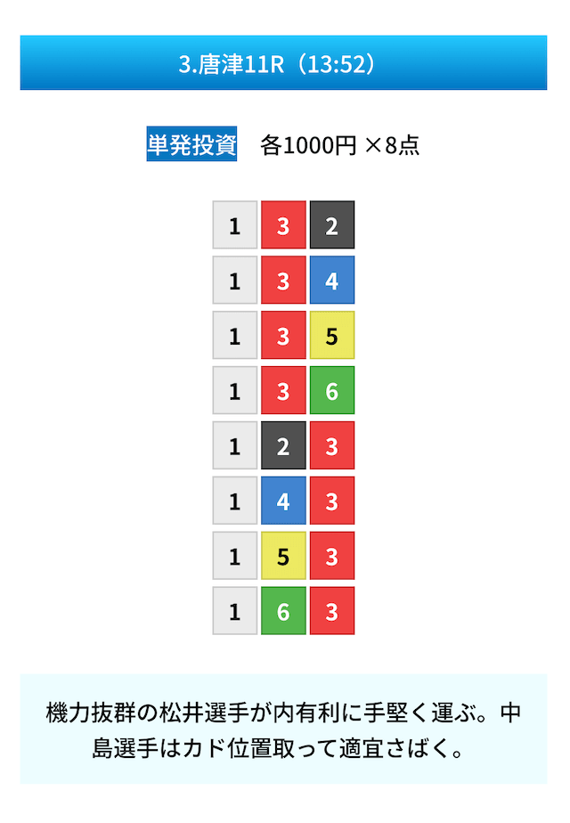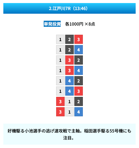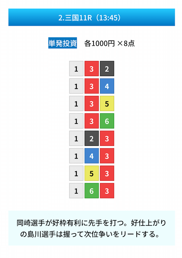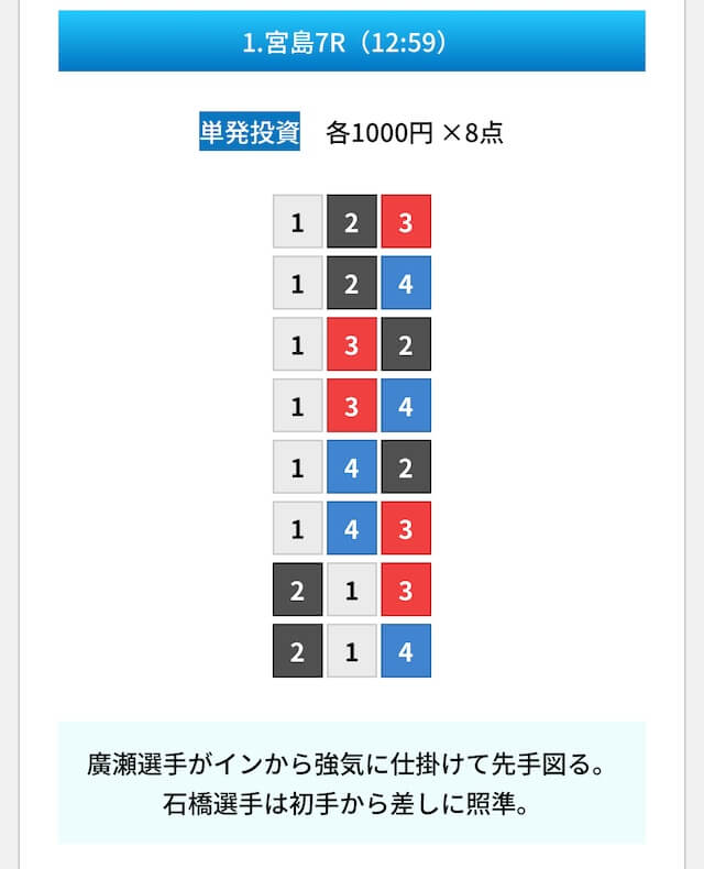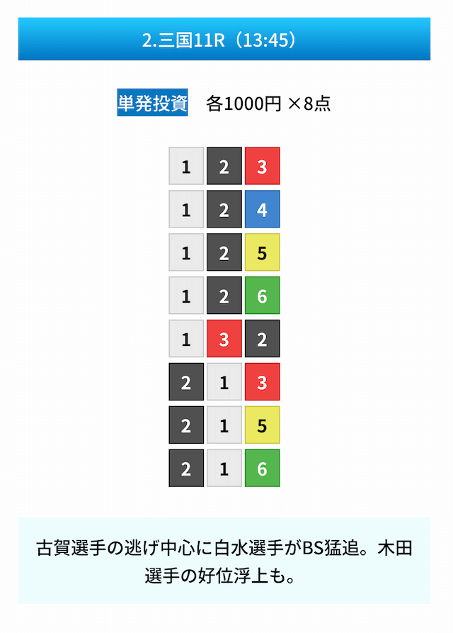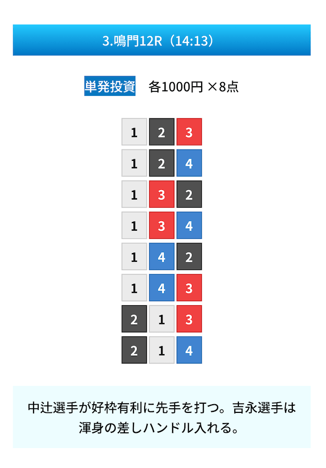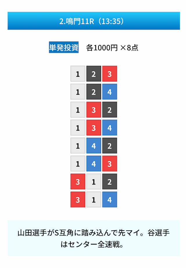 買い目は①④号艇を軸に置いて、②⑤号艇を絡めた組み合わせ。