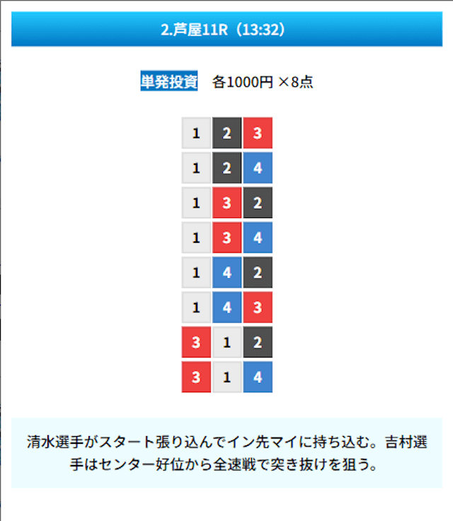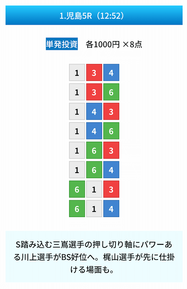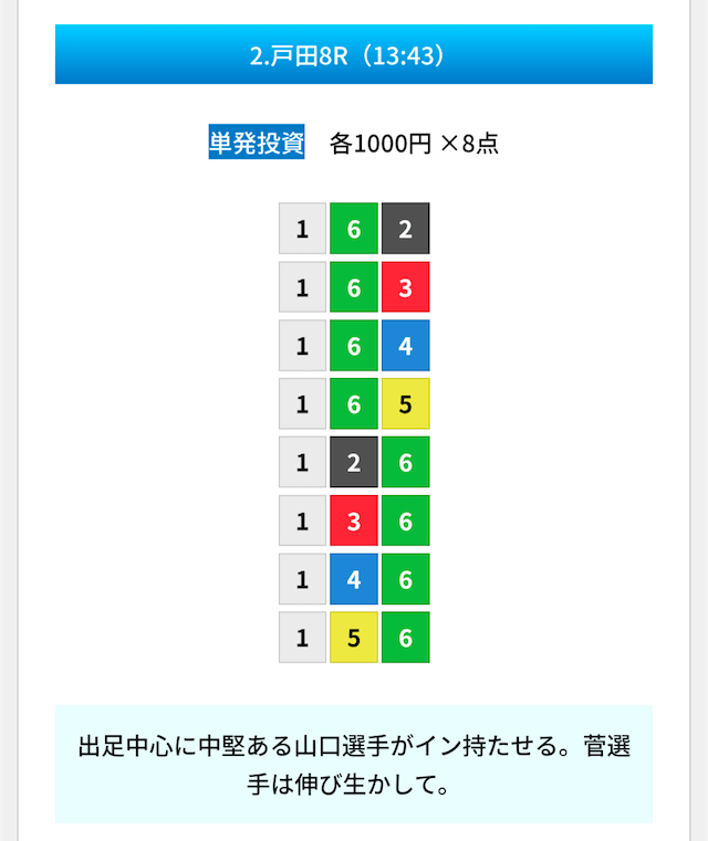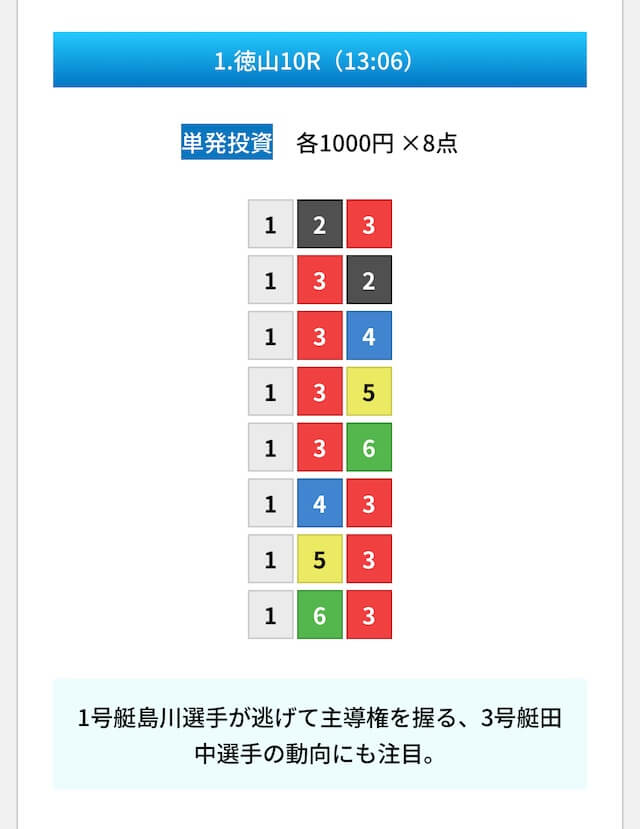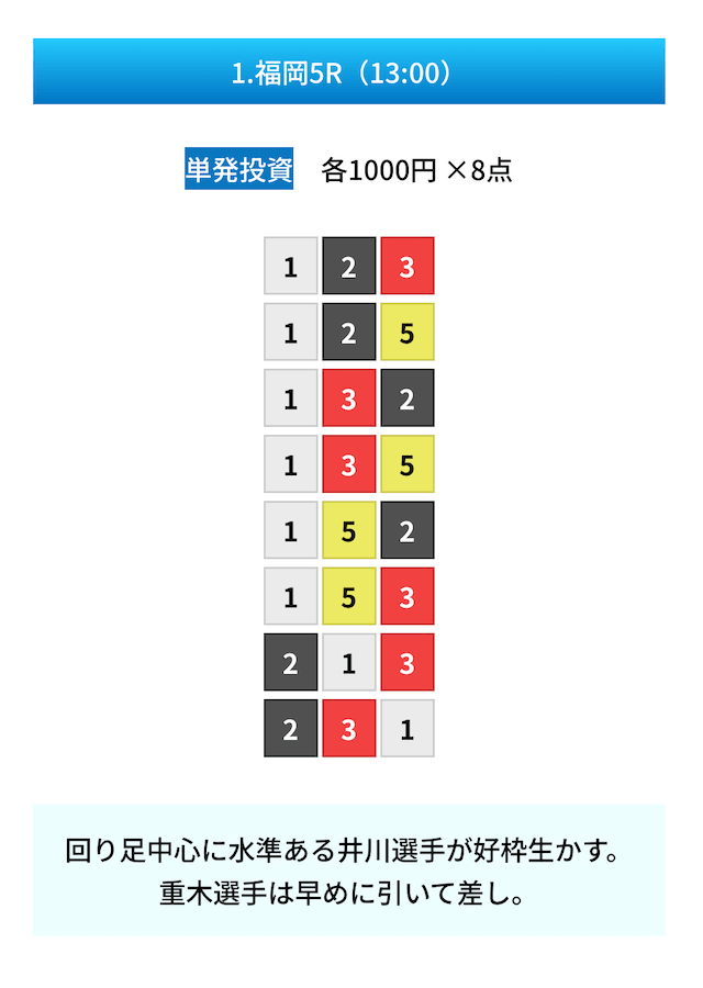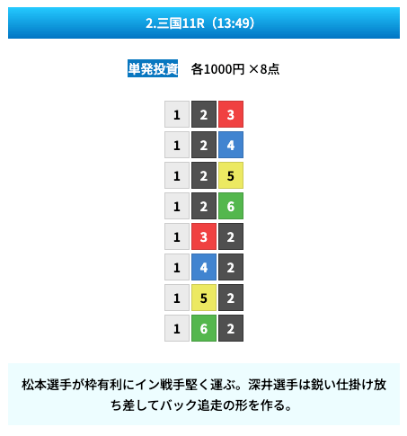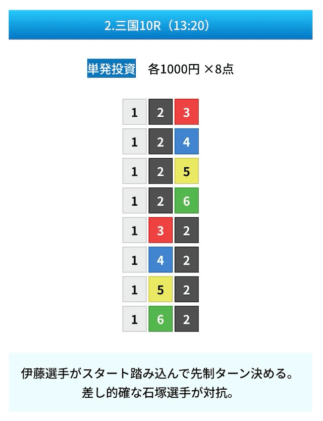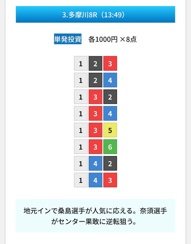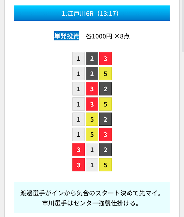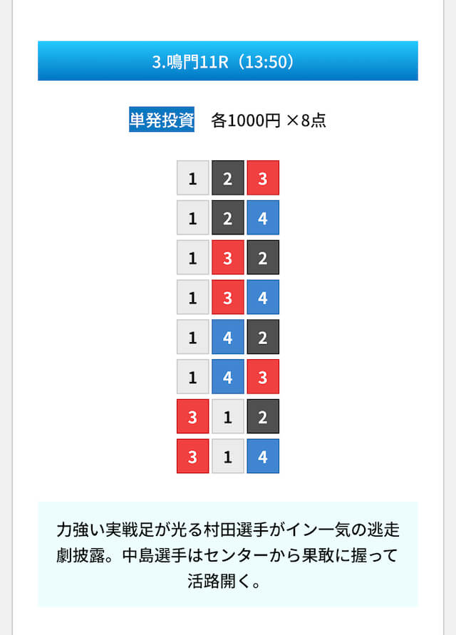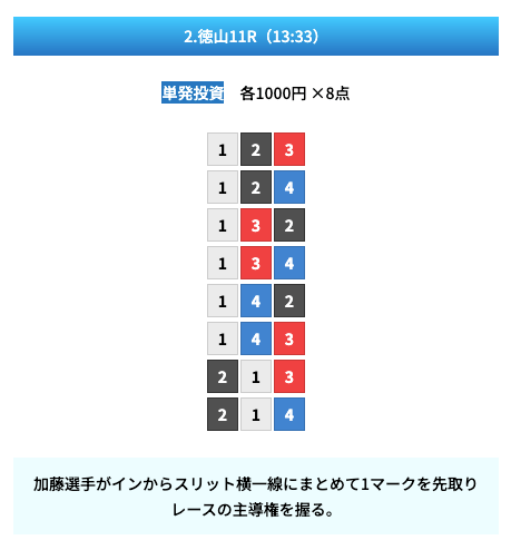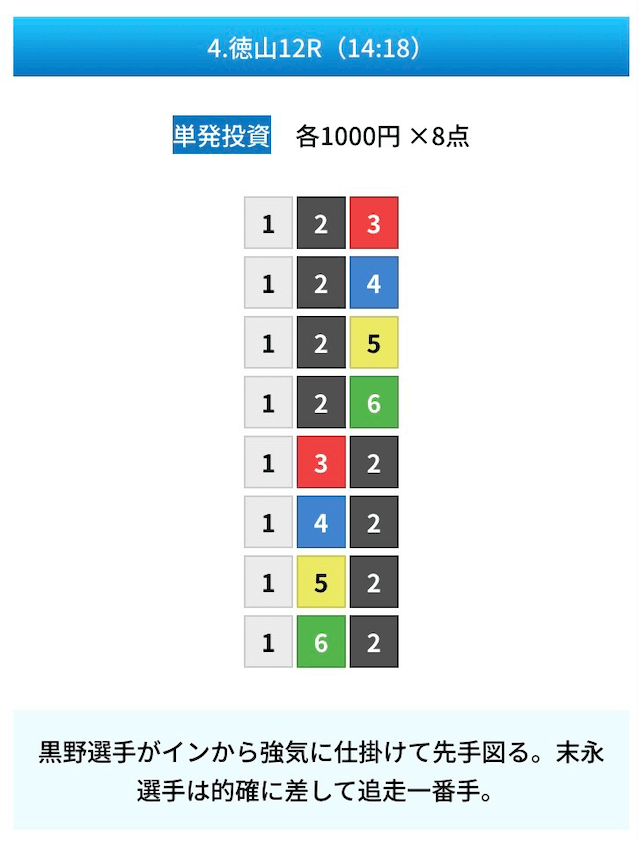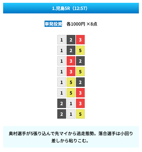 買い目は①④号艇を軸に置いて、②⑤号艇を絡めた組み合わせ。