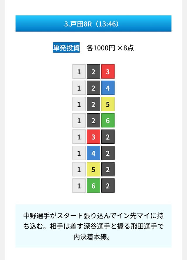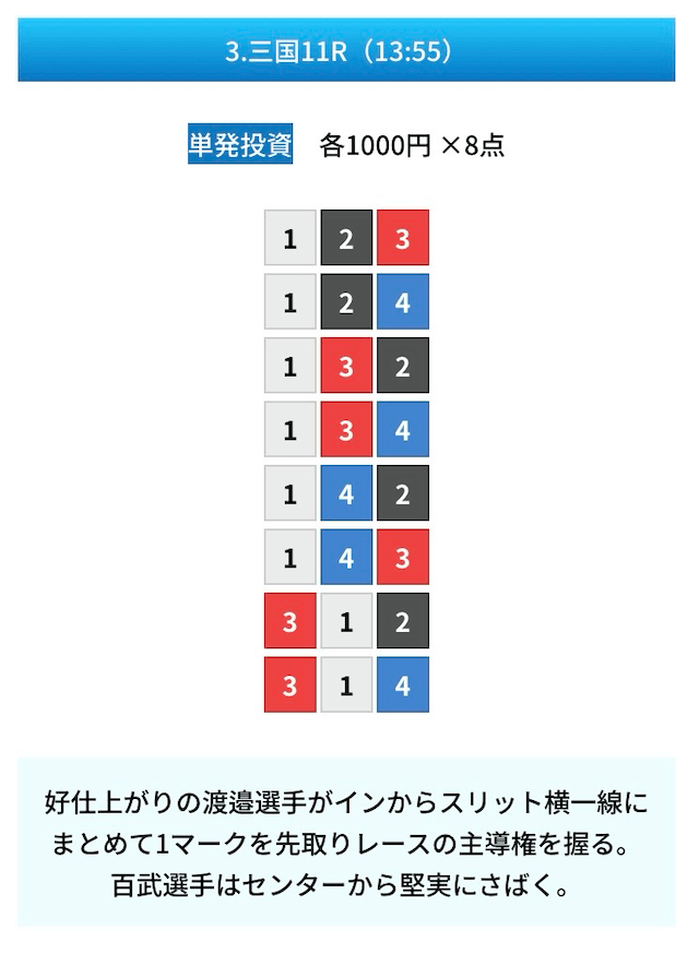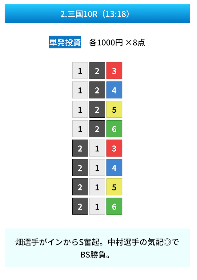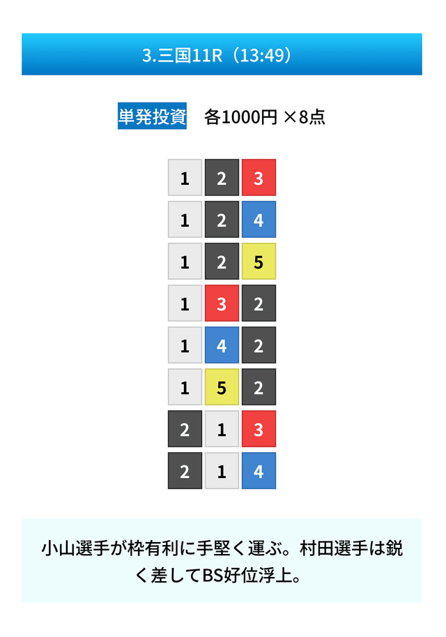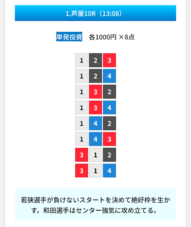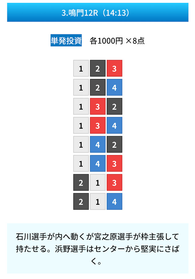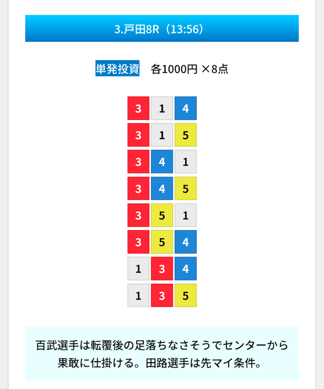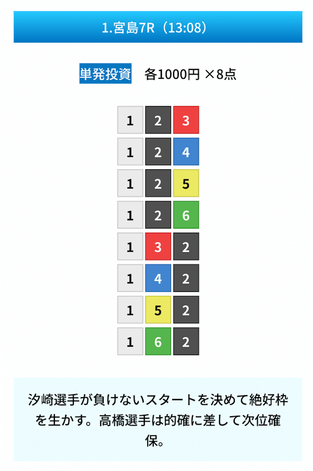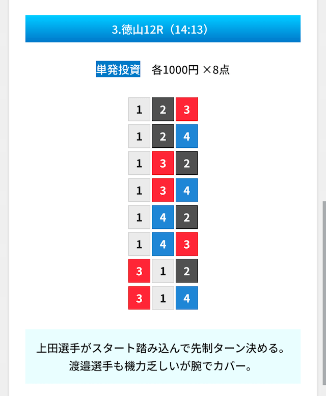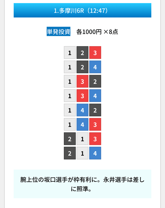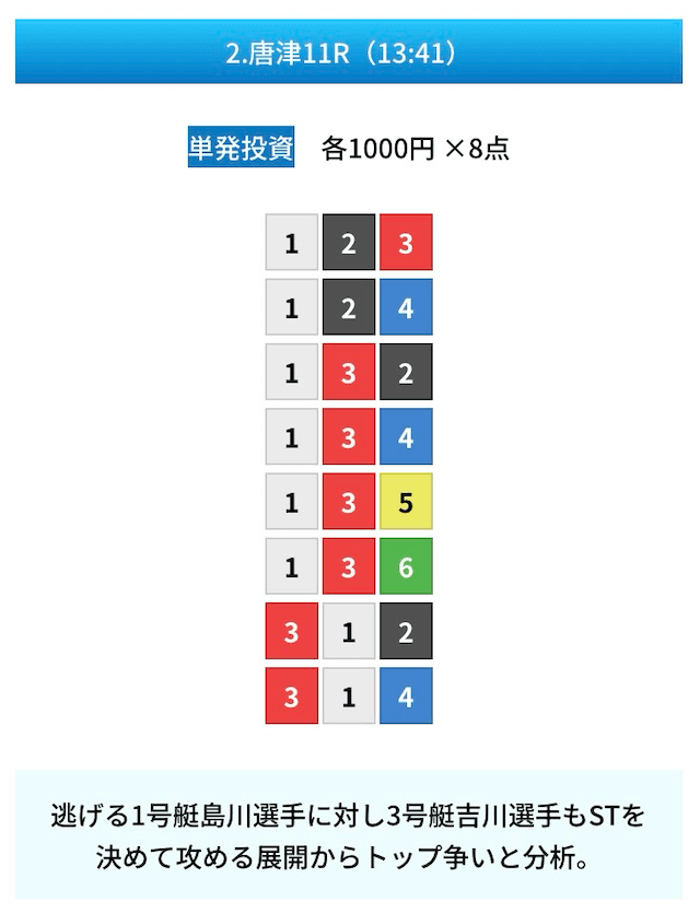 買い目は①④号艇を軸に置いて、②⑤号艇を絡めた組み合わせ。