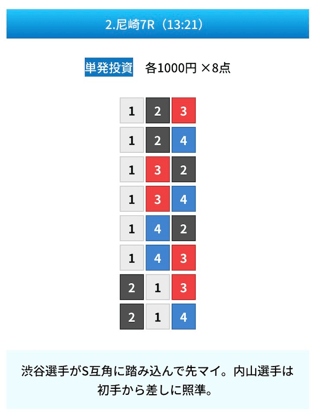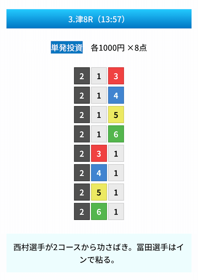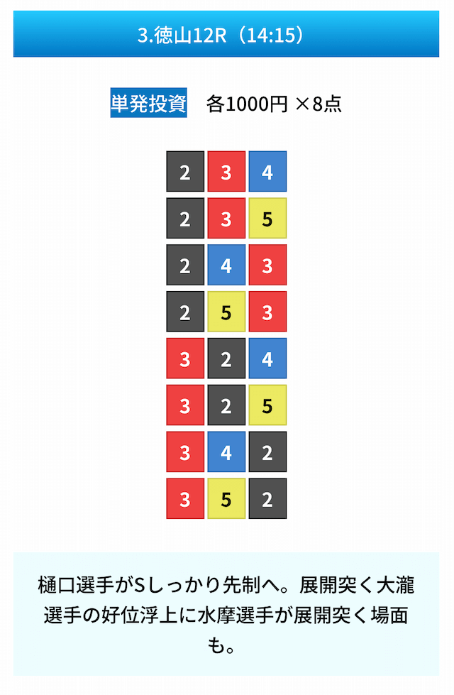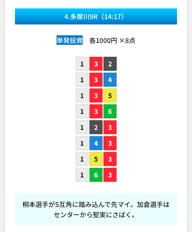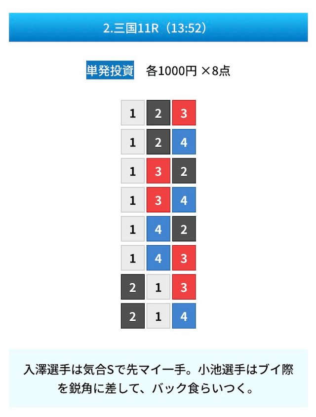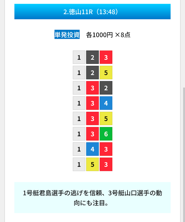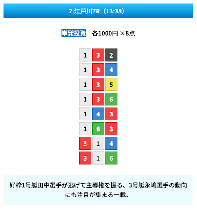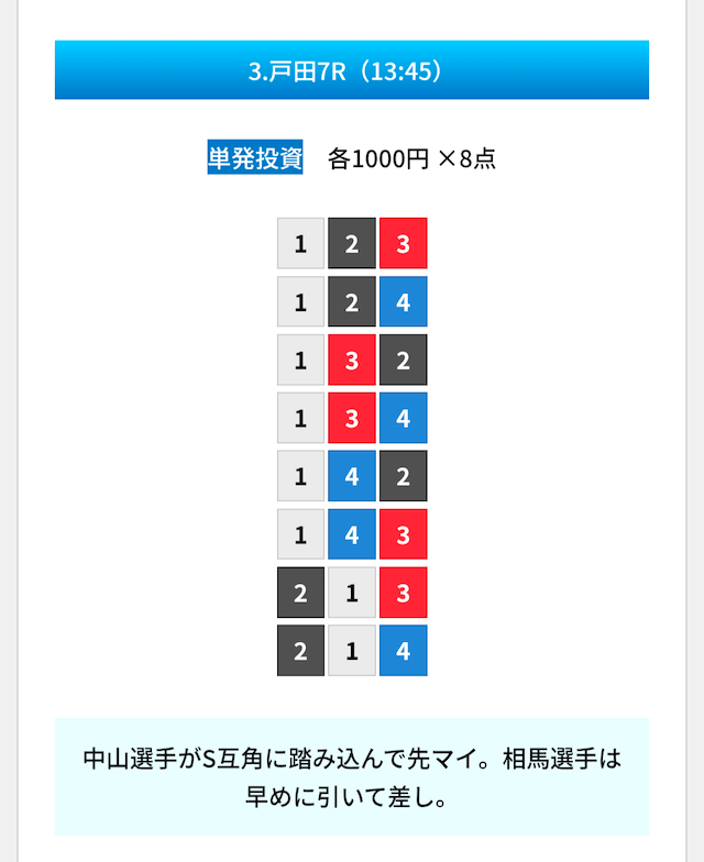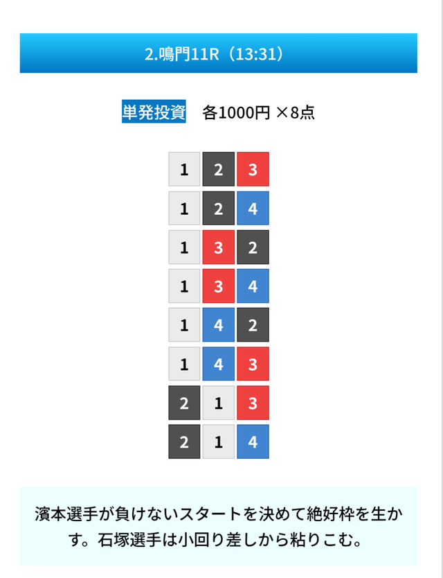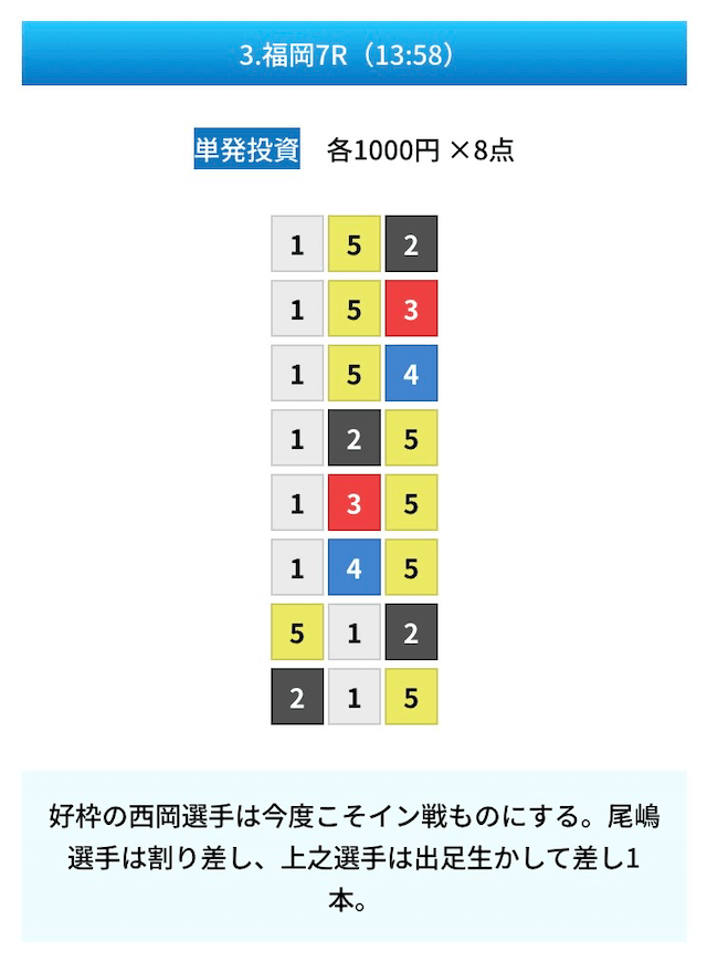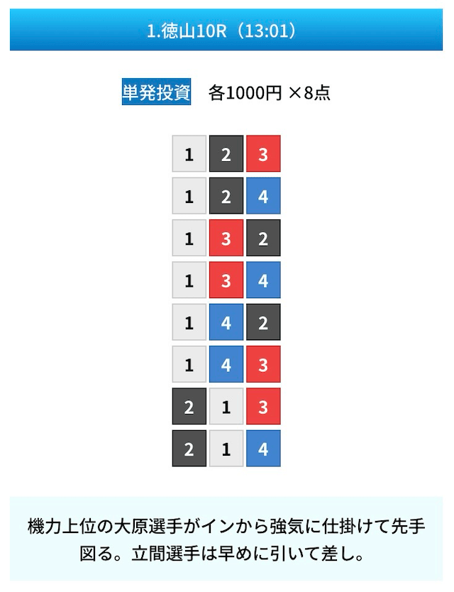 買い目は①④号艇を軸に置いて、②⑤号艇を絡めた組み合わせ。