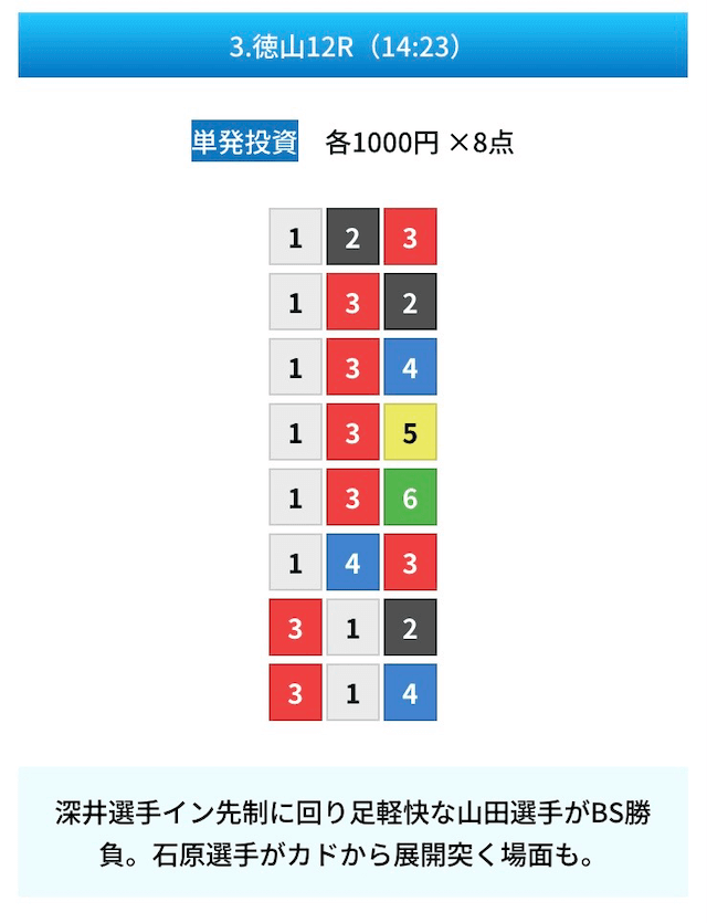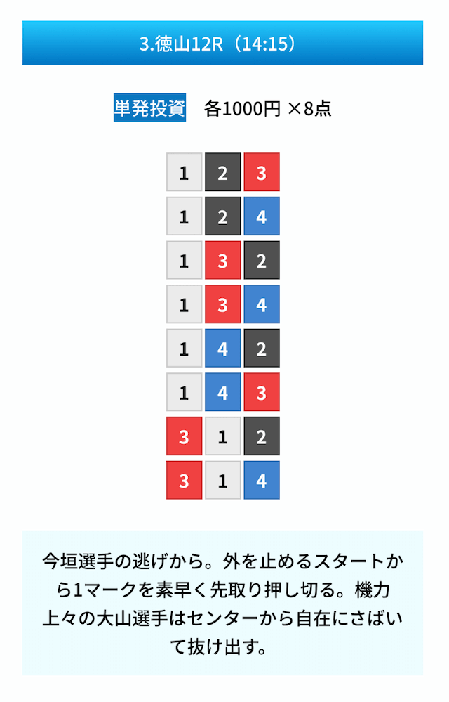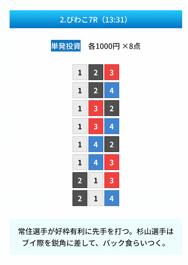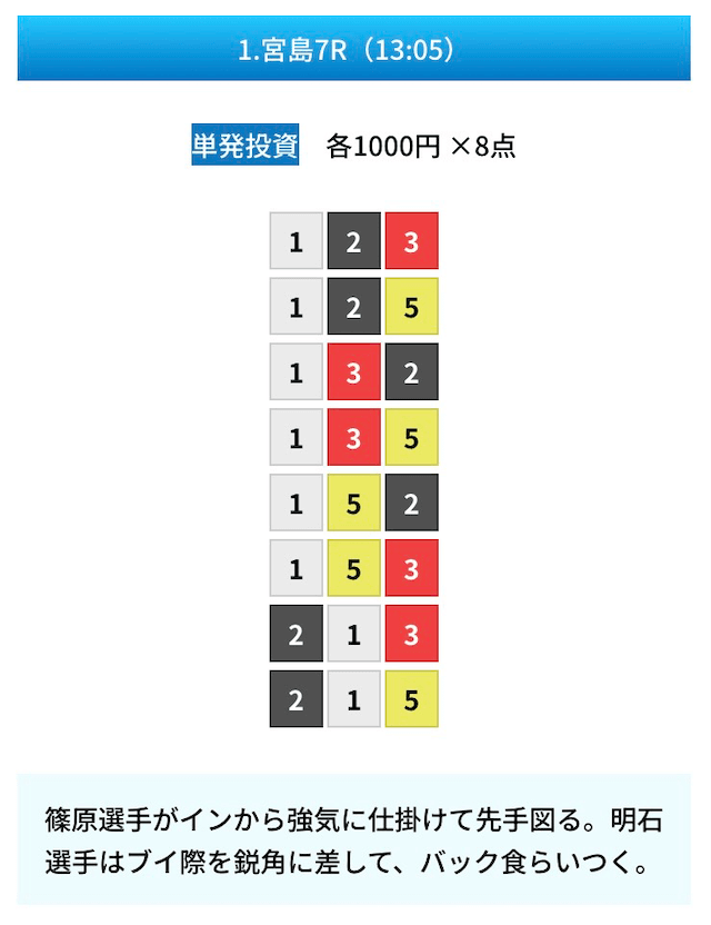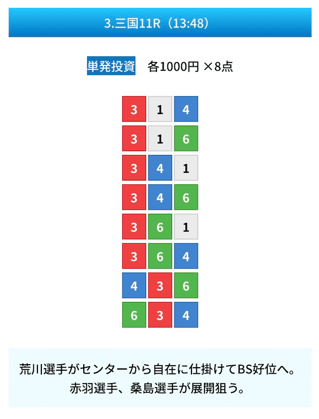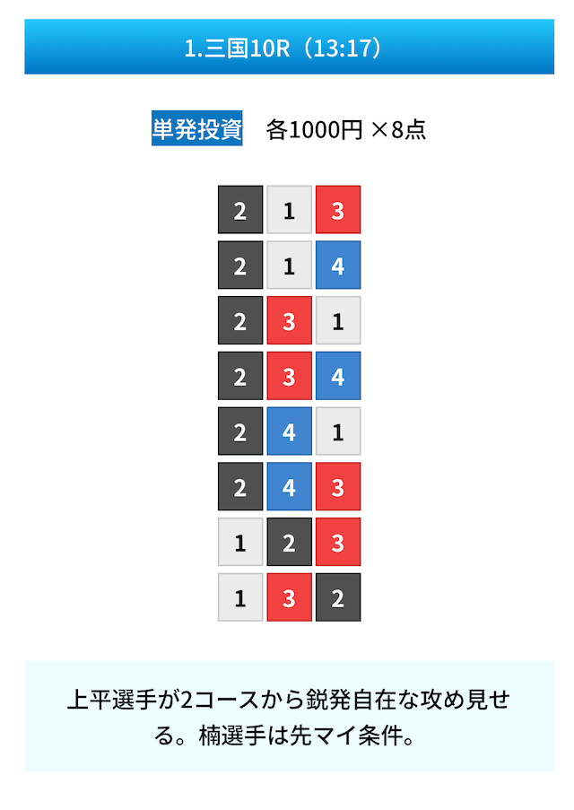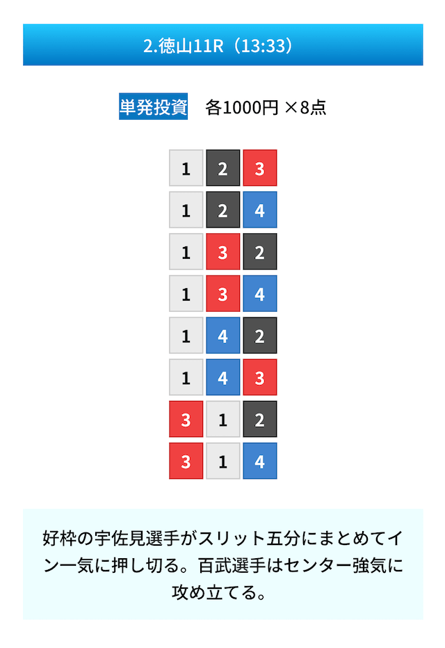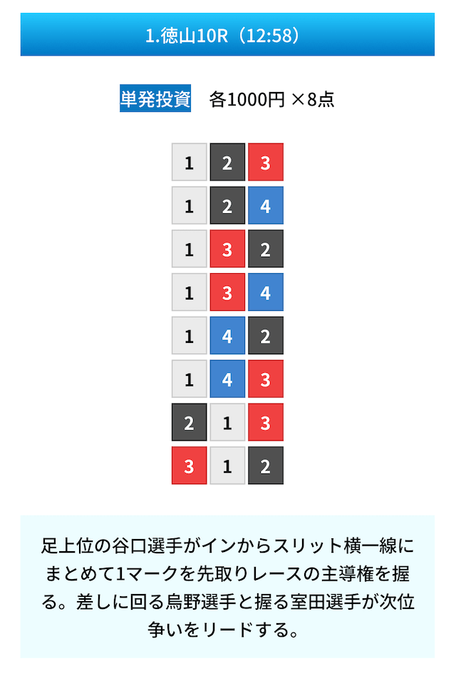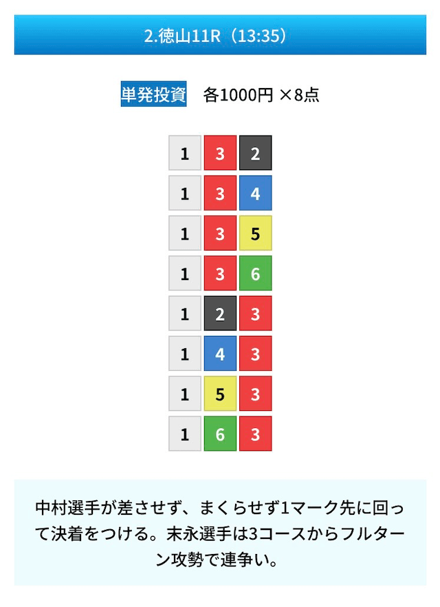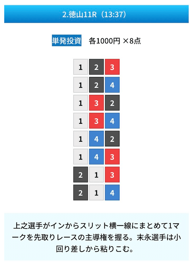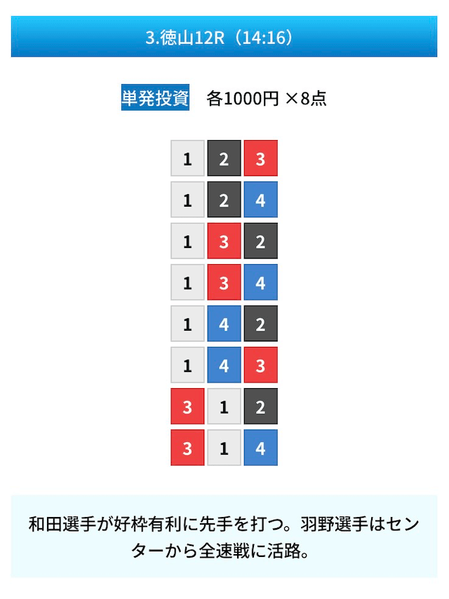 買い目は①④号艇を軸に置いて、②⑤号艇を絡めた組み合わせ。