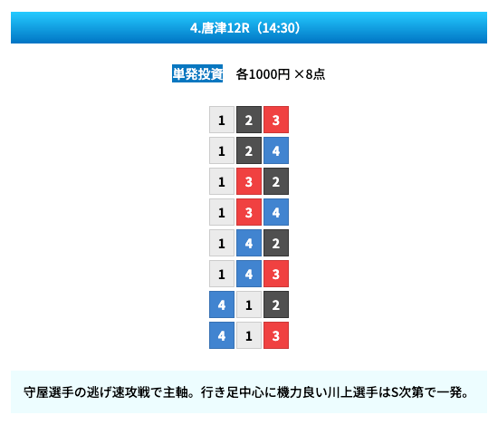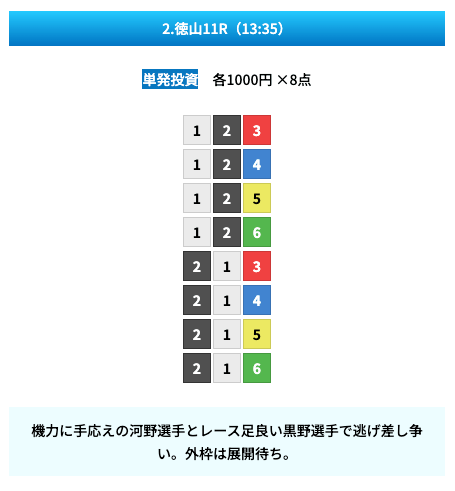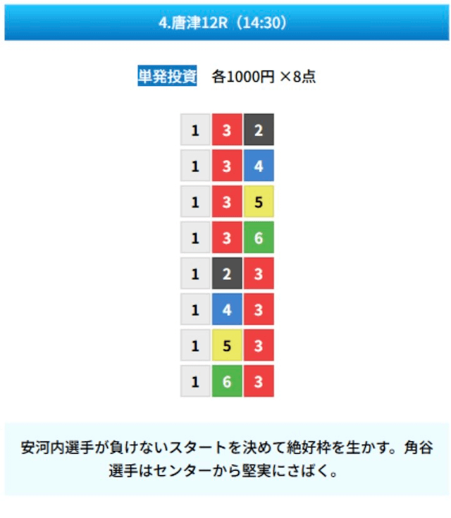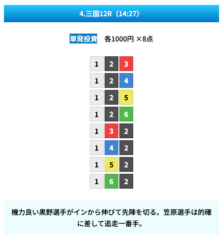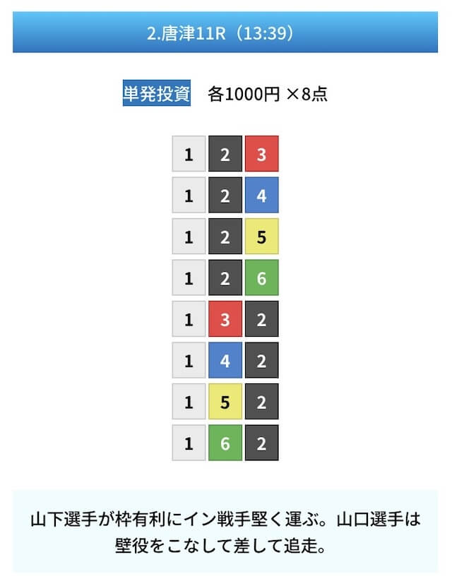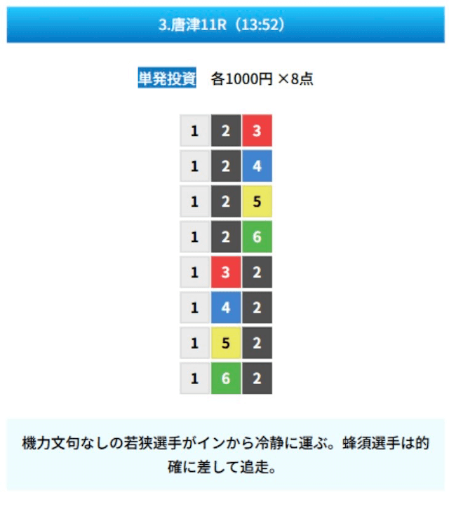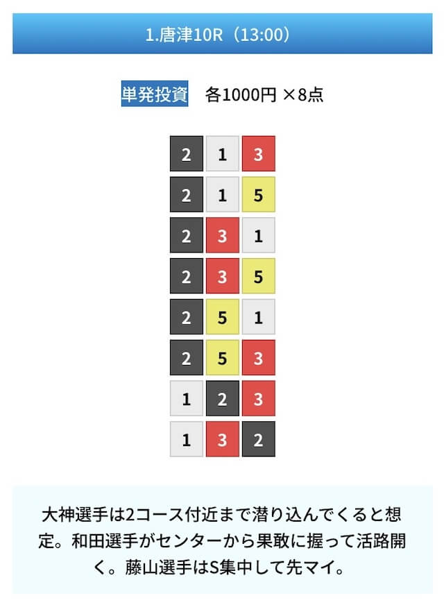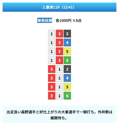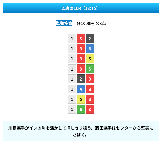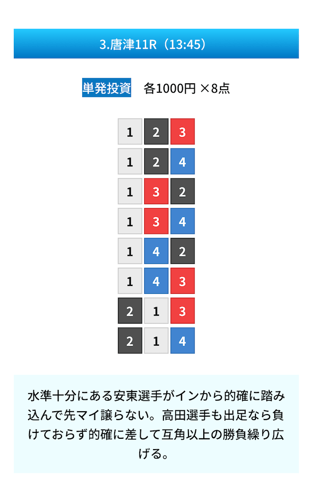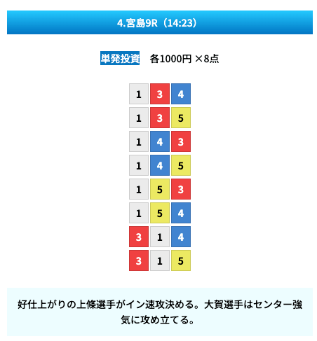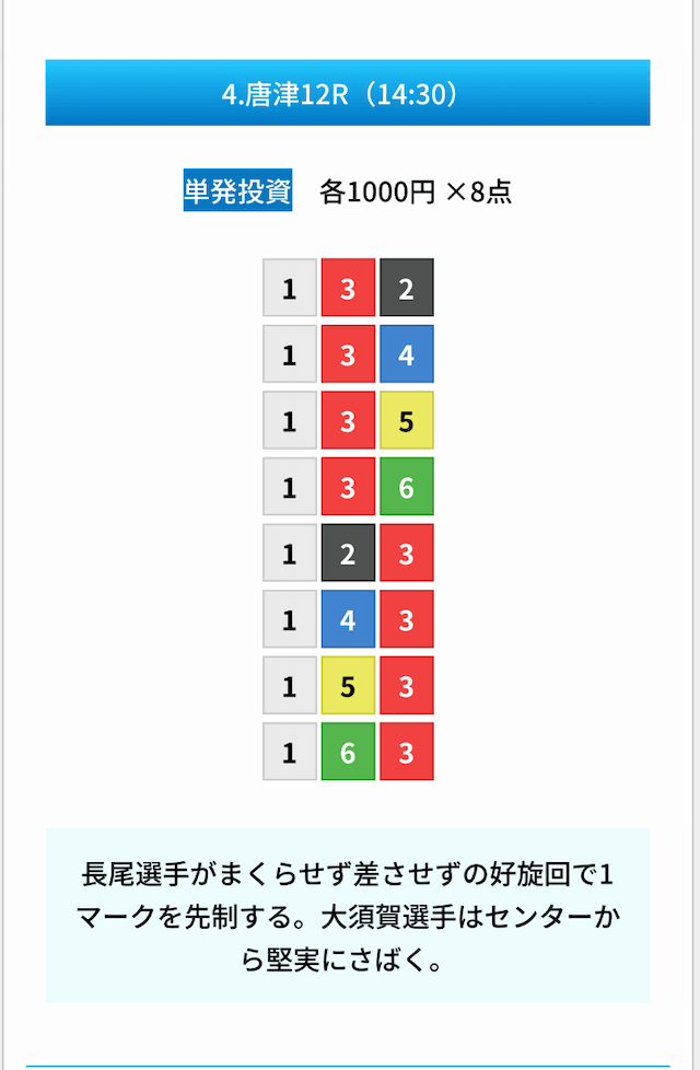 - 試しに無料予想に参加してみたら、いきなり的中して1万ちょいの回収!本当に無料でこれはびっくり。見解も書かれてるから初心者でも参考にしやすかった。投稿日:2025/01/10
