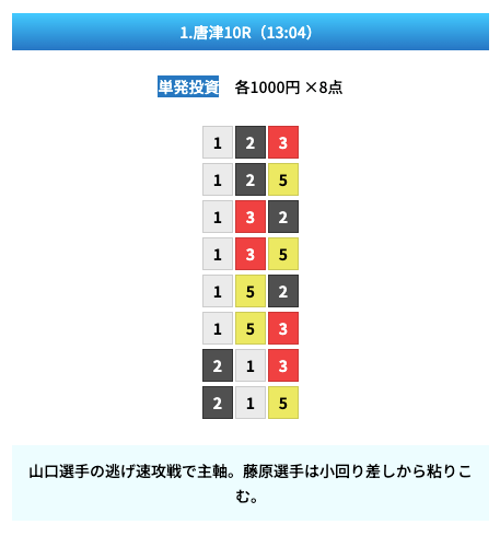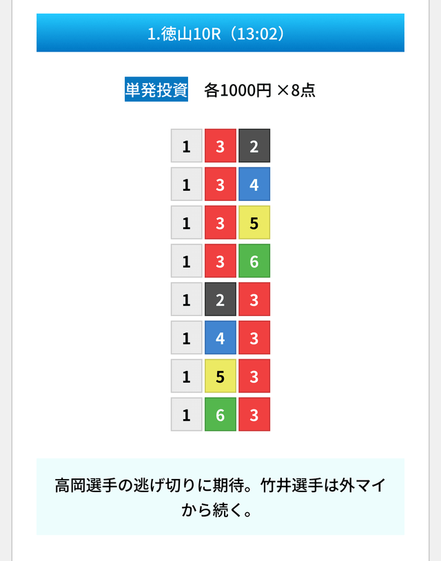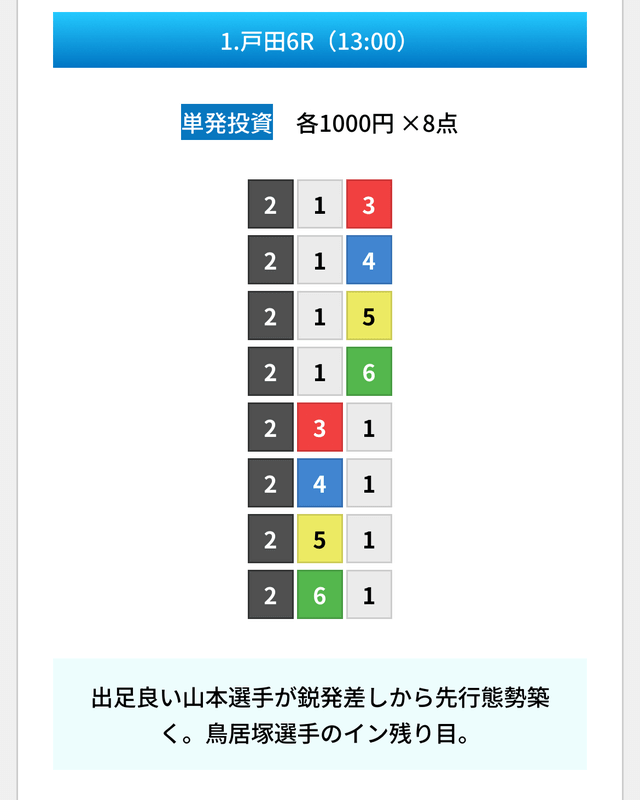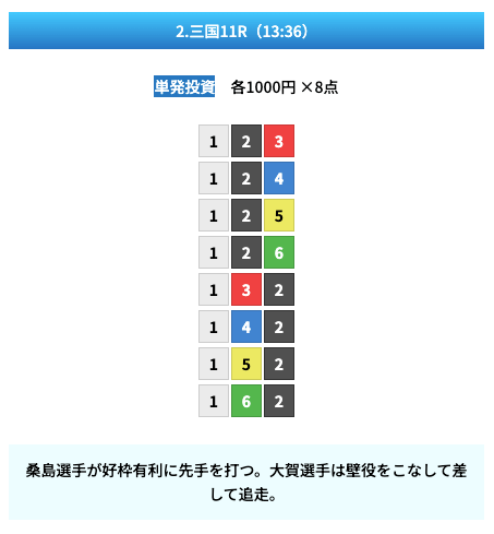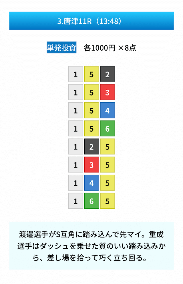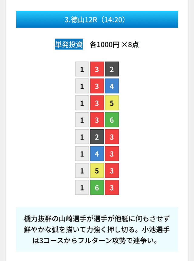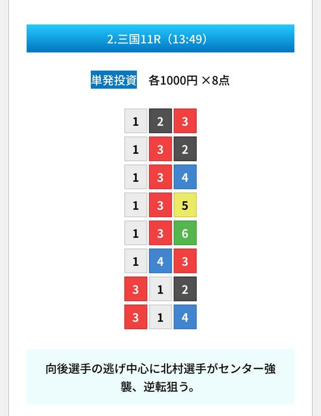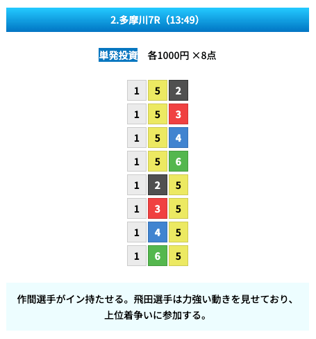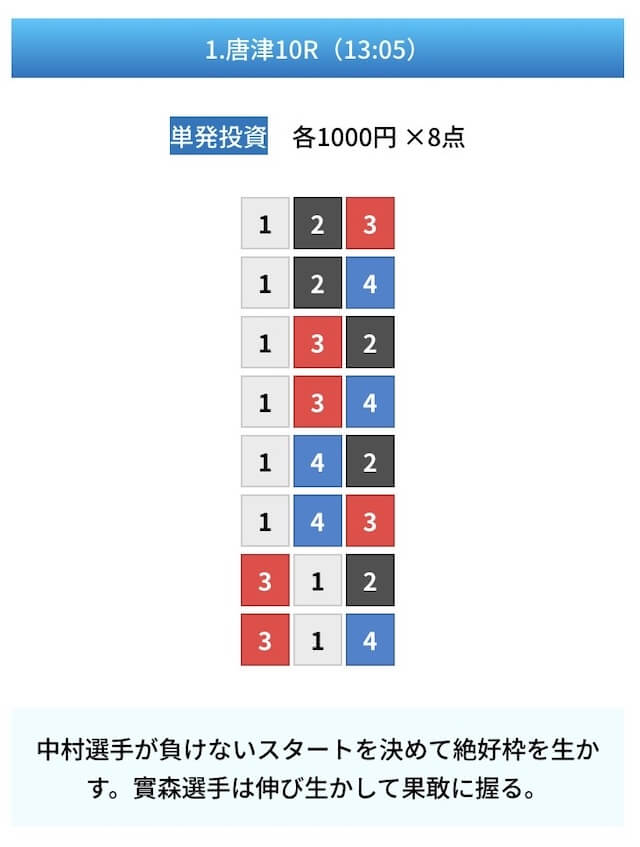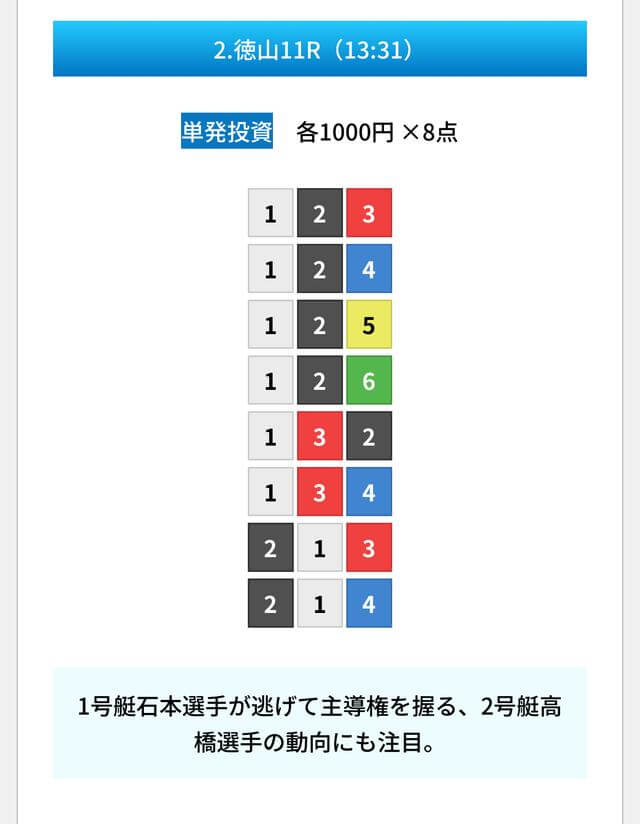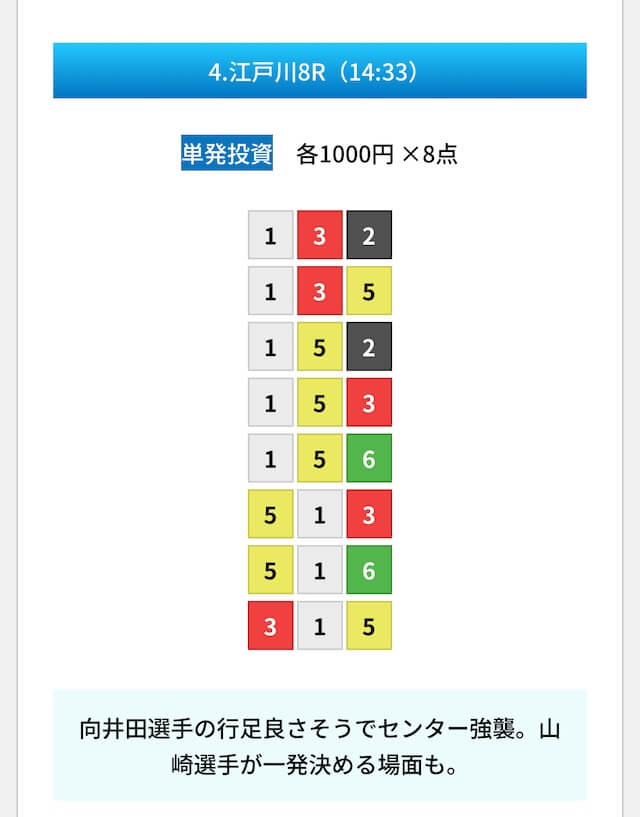 - 試しに無料予想に参加してみたら、いきなり的中して1万ちょいの回収!本当に無料でこれはびっくり。見解も書かれてるから初心者でも参考にしやすかった。投稿日:2025/01/10