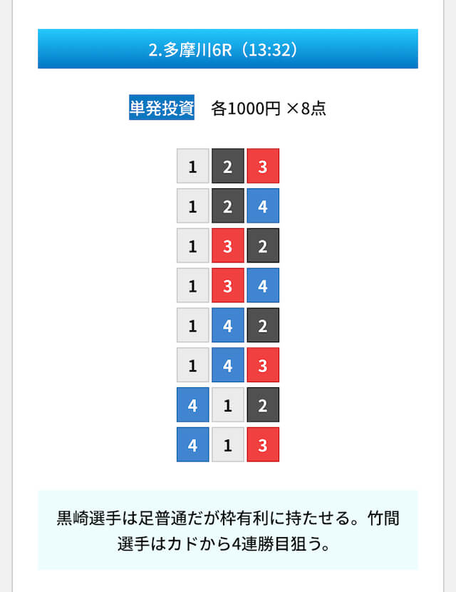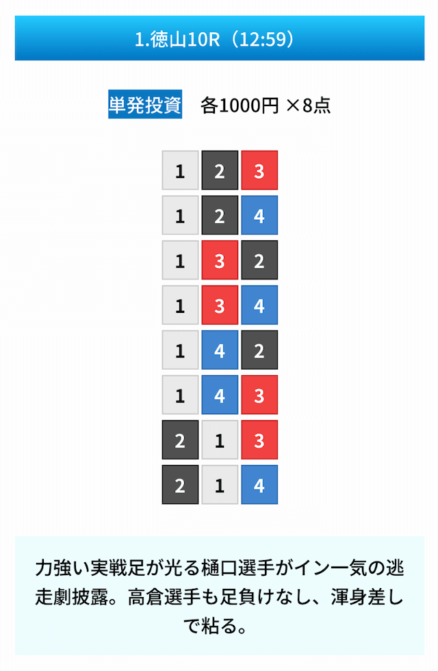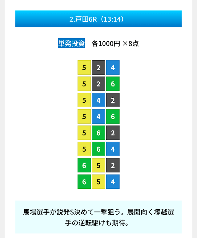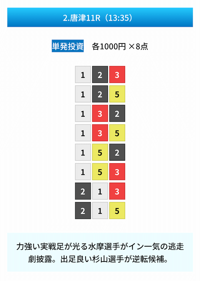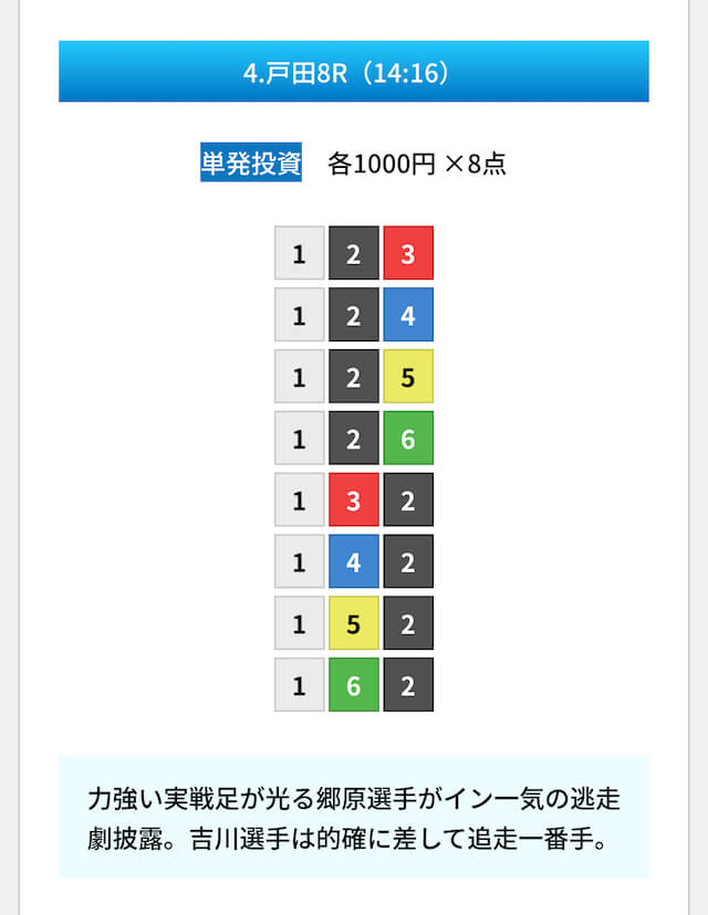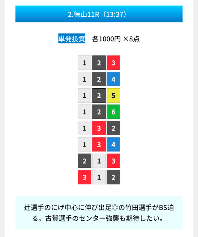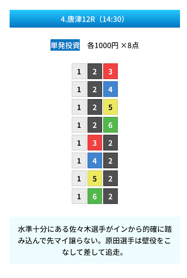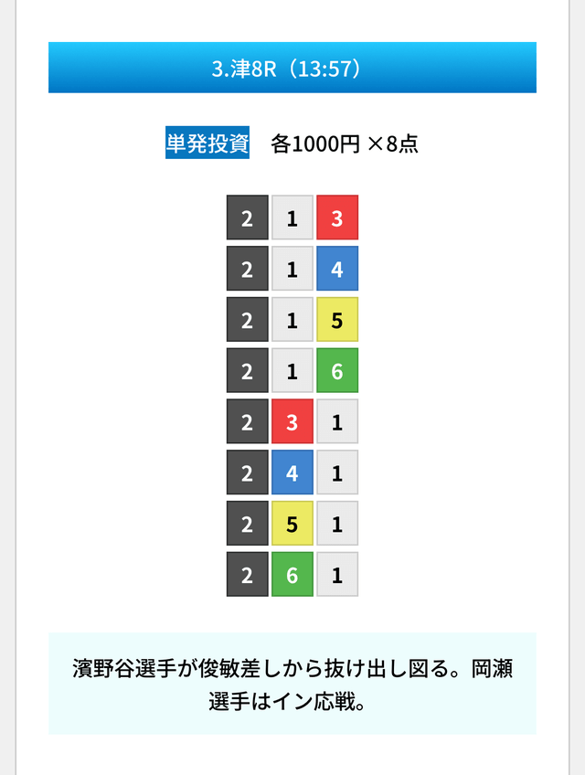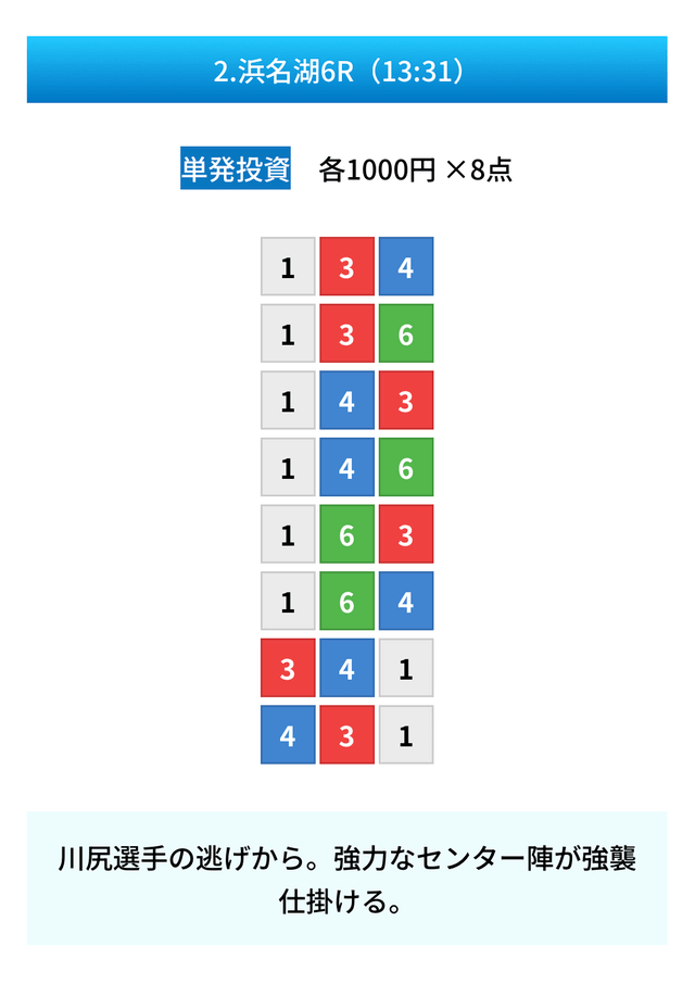 - 試しに無料予想に参加してみたら、いきなり的中して1万ちょいの回収!本当に無料でこれはびっくり。見解も書かれてるから初心者でも参考にしやすかった。投稿日:2025/01/10