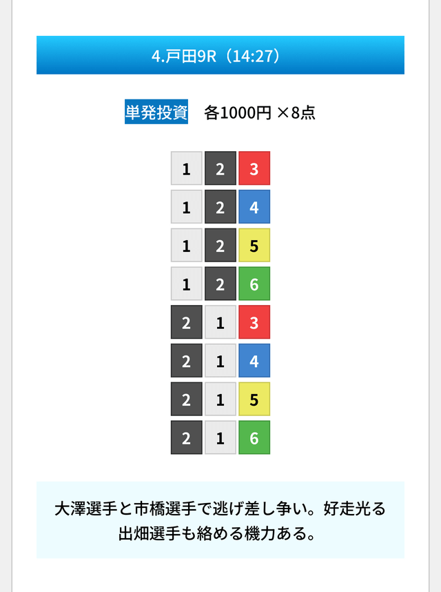 - 無料予想で1レース目が的中すると、その後の3レースは2/3くらいの確率で的中している気がします⋯。初戦の結果が大事ってのを覚えておいて貰えると!!投稿日:2024/10/09